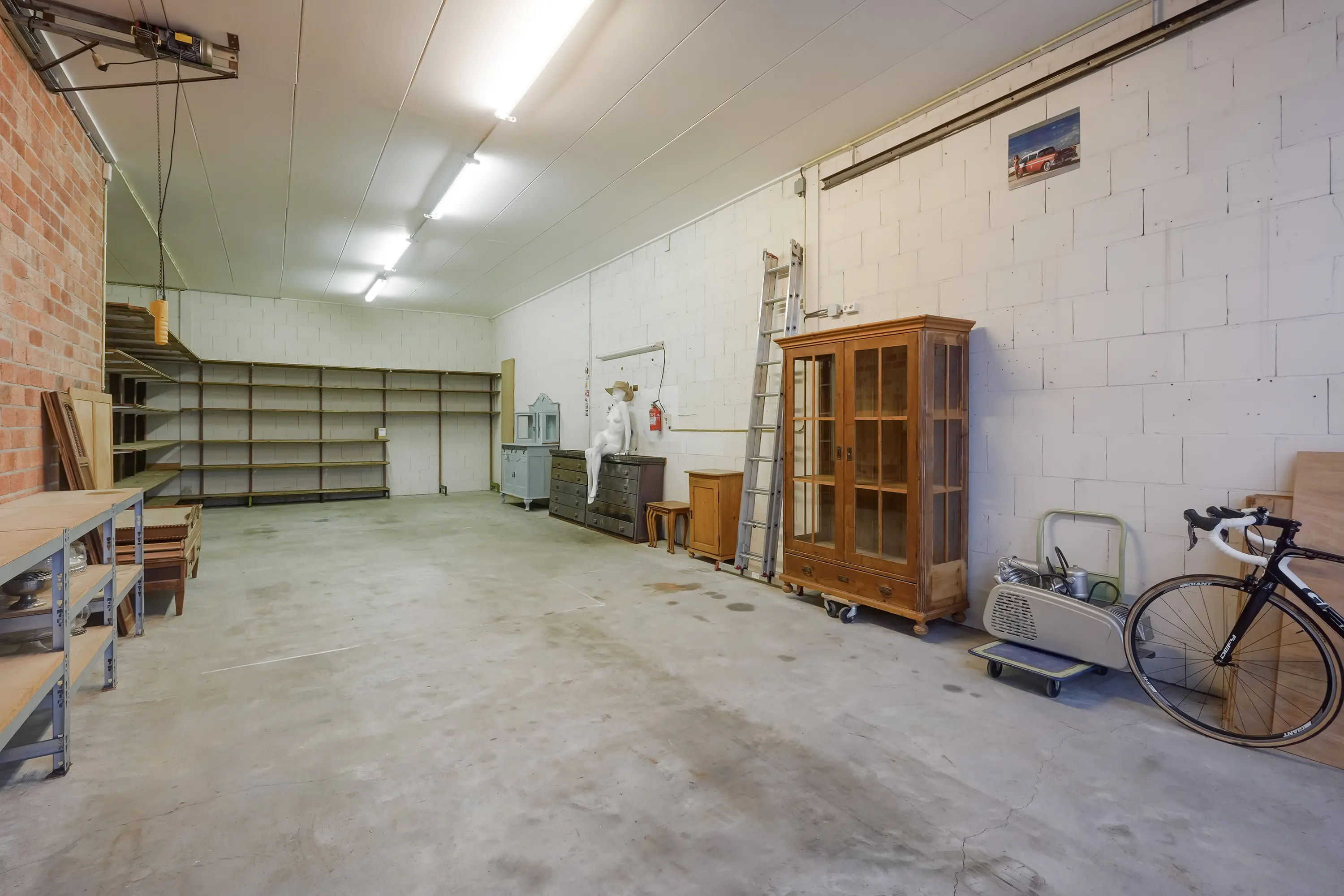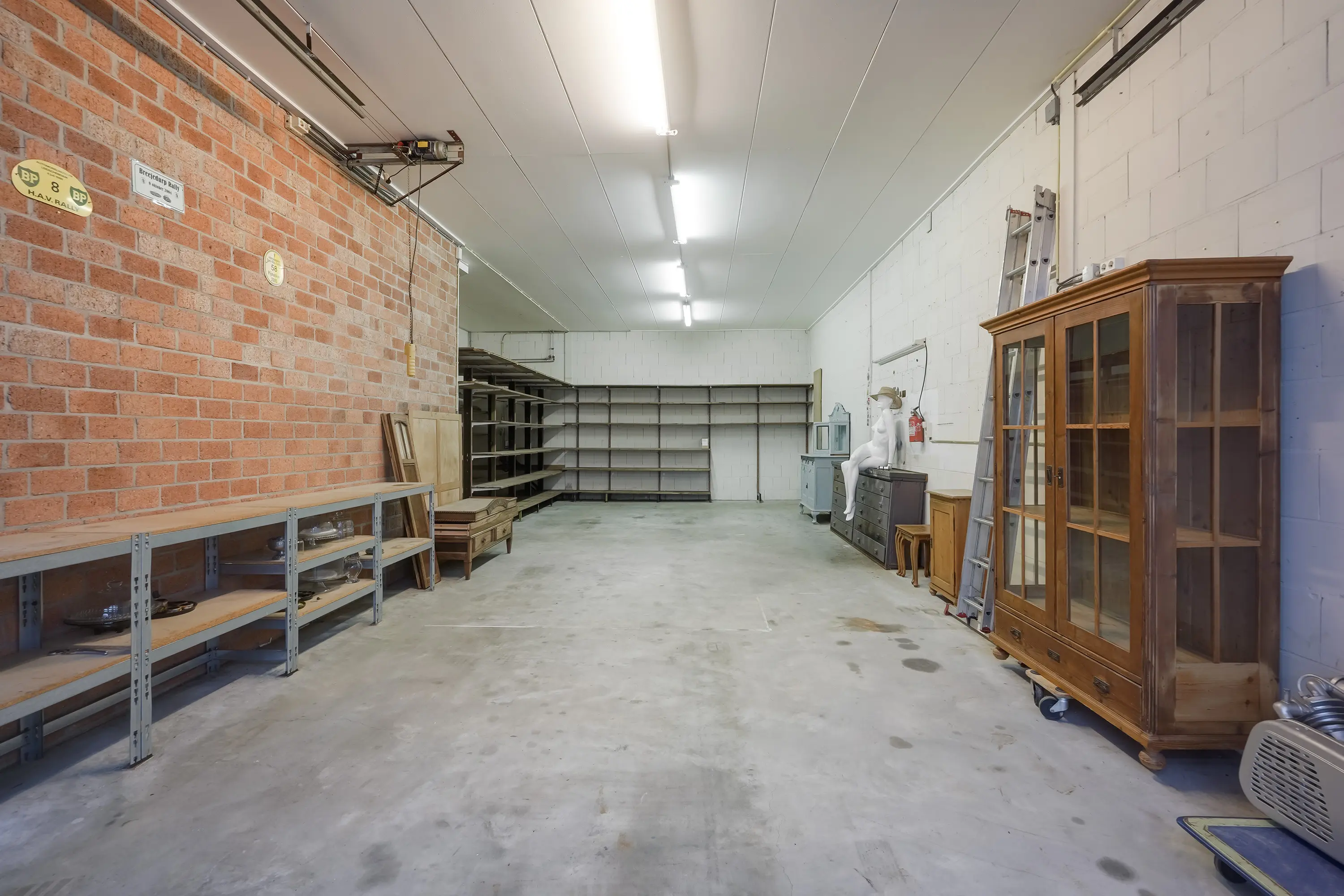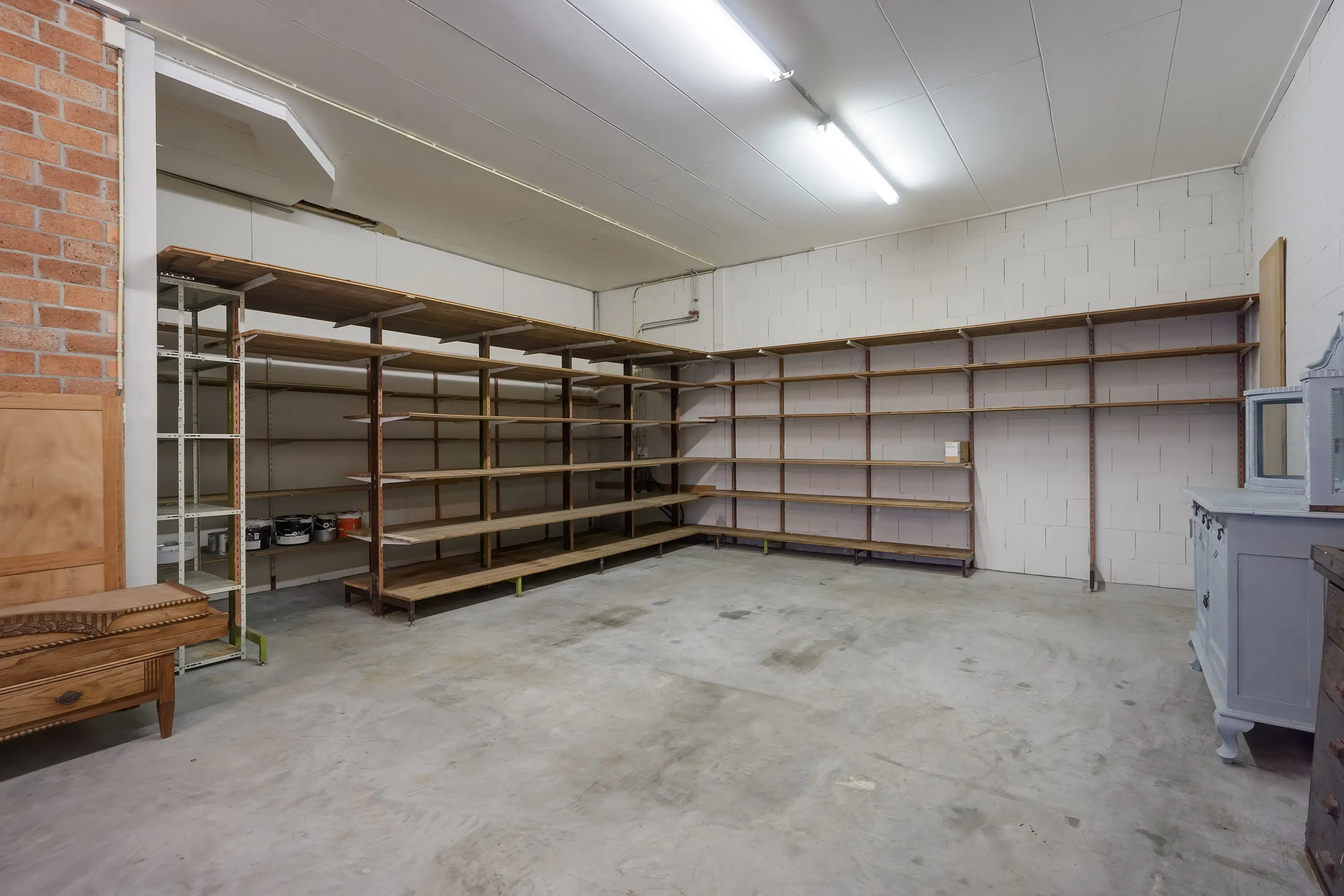 Bedrijfsruimte heeft diverse stellingen, TL verlichting, meterkast met aansluiting voor gas, water, elektra en glasvezel internetverbinding.