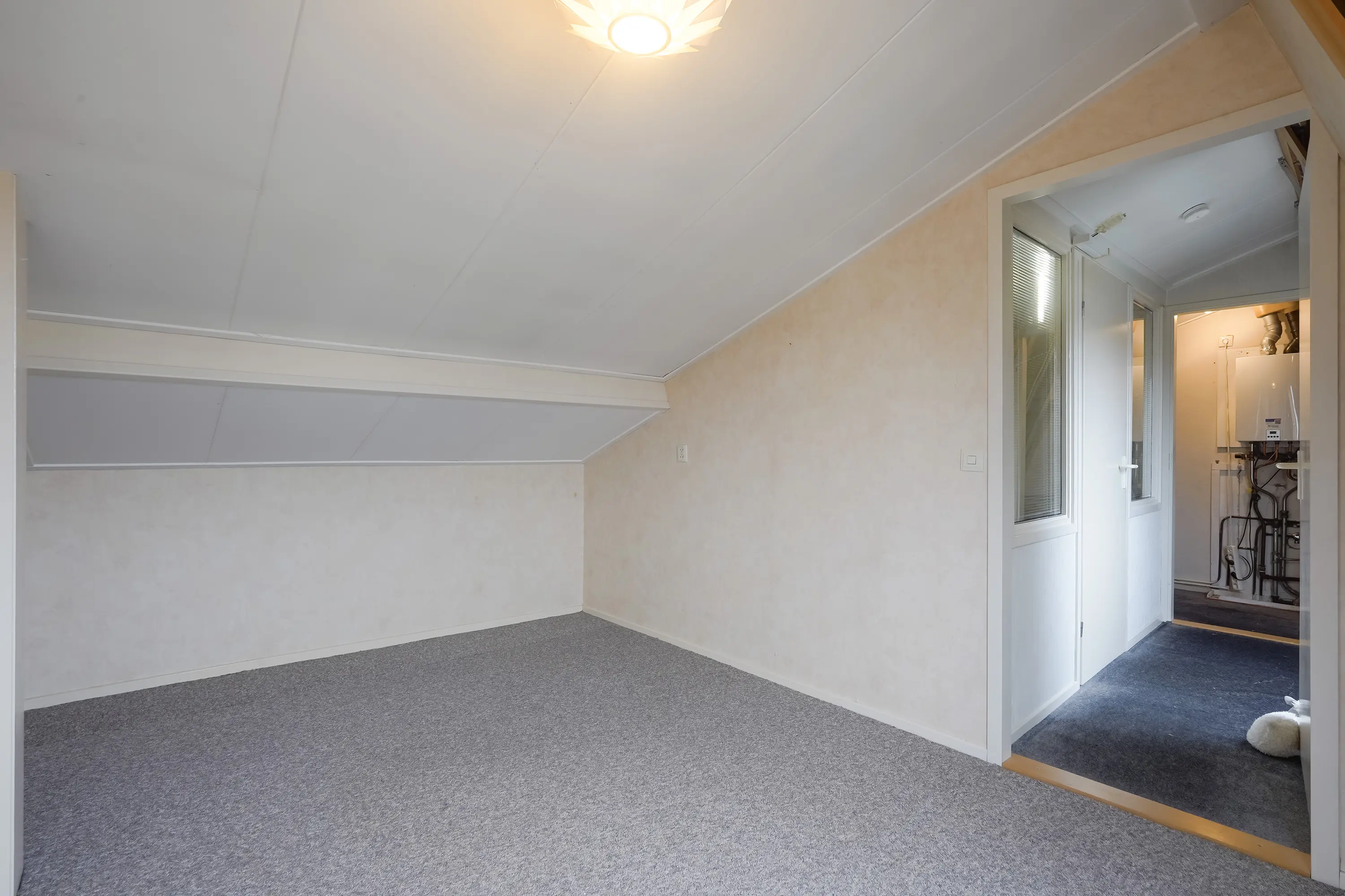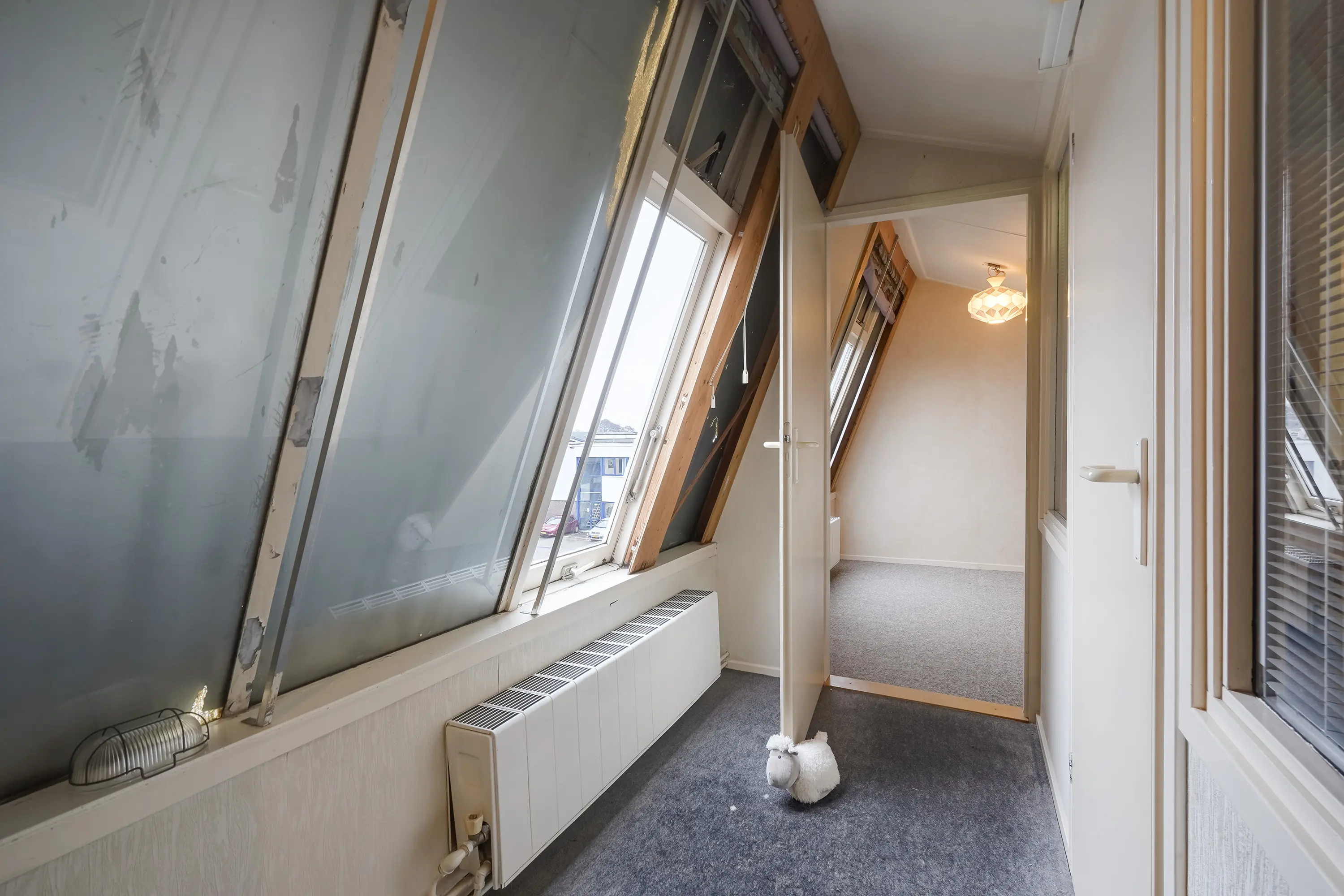 Overloop met opstelplaats cv combiketel (Remeha Avanta), corridor met glas. Twee naast elkaar gelegen slaapkamers met bergruimte.
