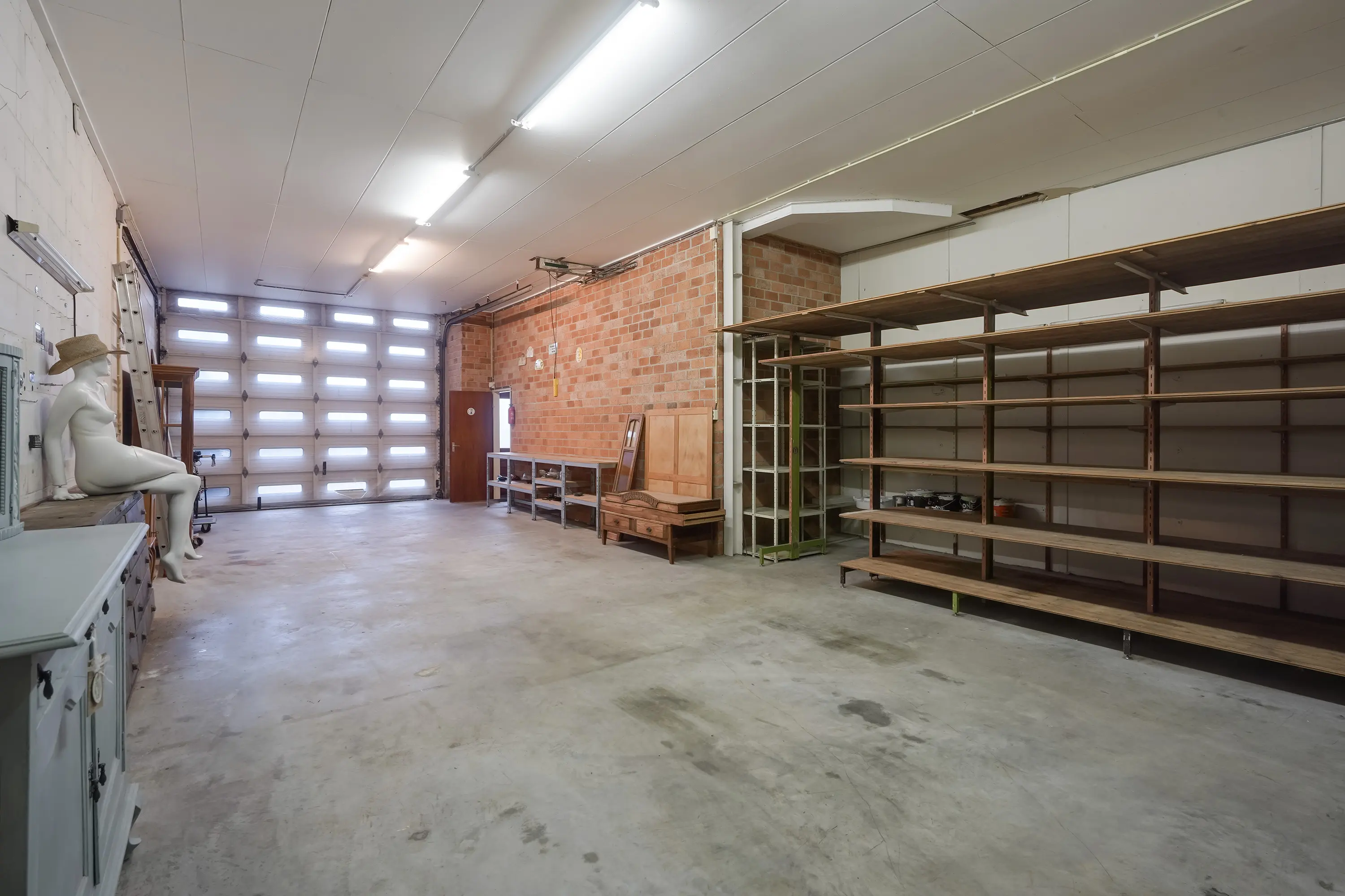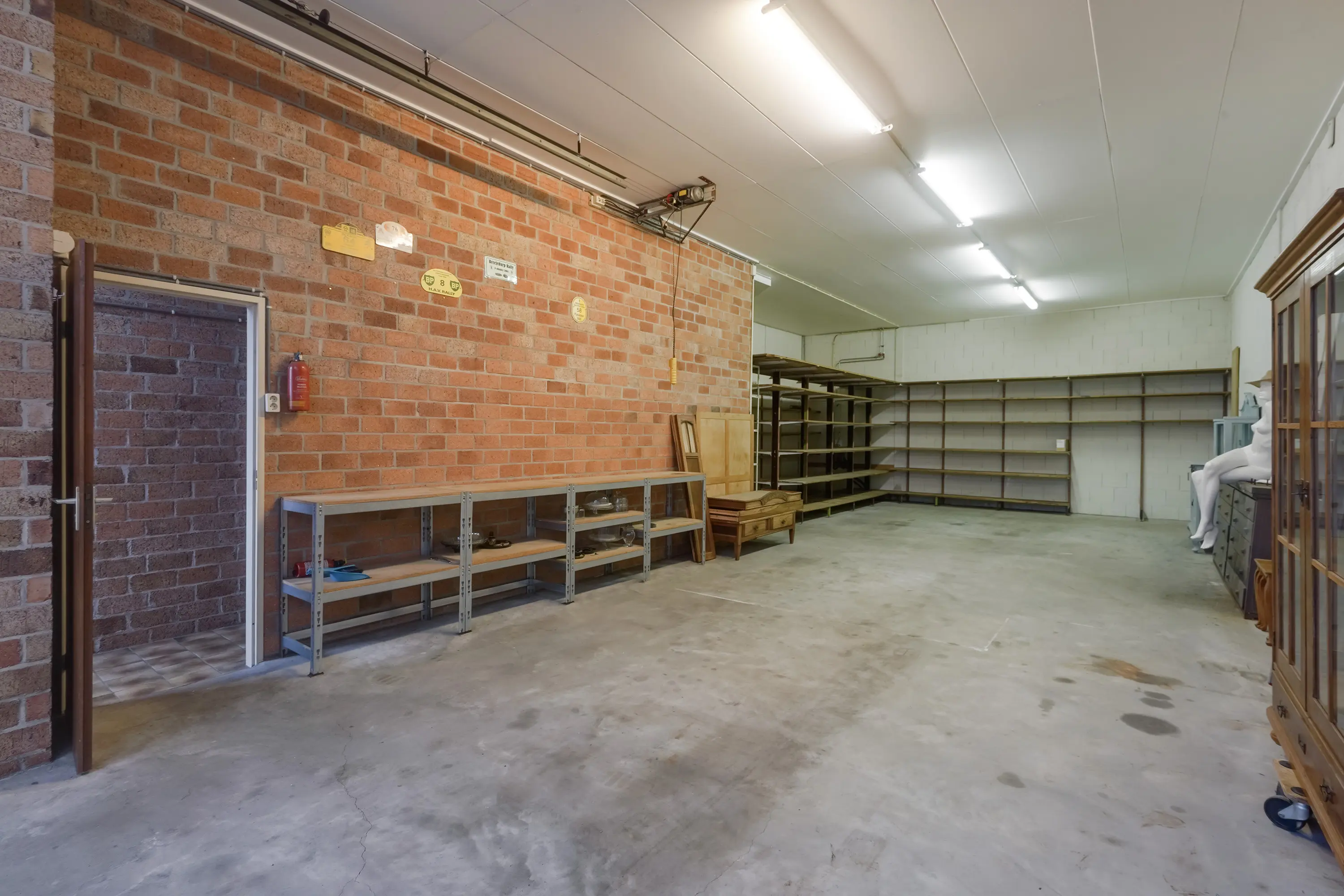 Bedrijfsruimte heeft diverse stellingen, TL verlichting, meterkast met aansluiting voor gas, water, elektra en glasvezel internetverbinding.