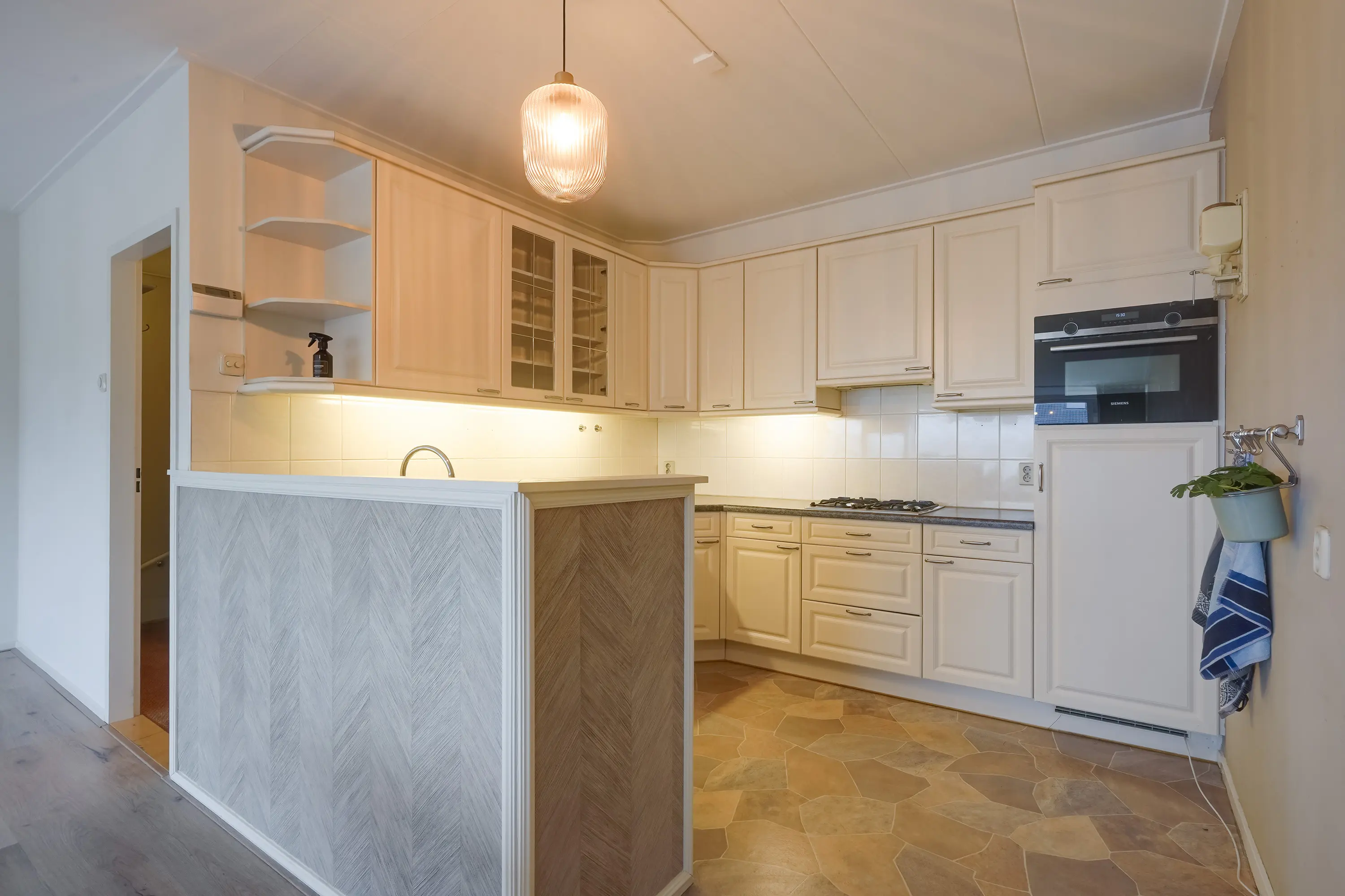 Hal met deur naar de woonkamer aan de voorzijde met balkon v.v. rolluik. Open keuken in hoekopstelling v.v. anderhalve spoelbak met mengkraan, kunststof werkblad, 4-pits gascomfort, afzuigkap, combi-oven, koelkast met vriesvak en diverse lades en kasten.