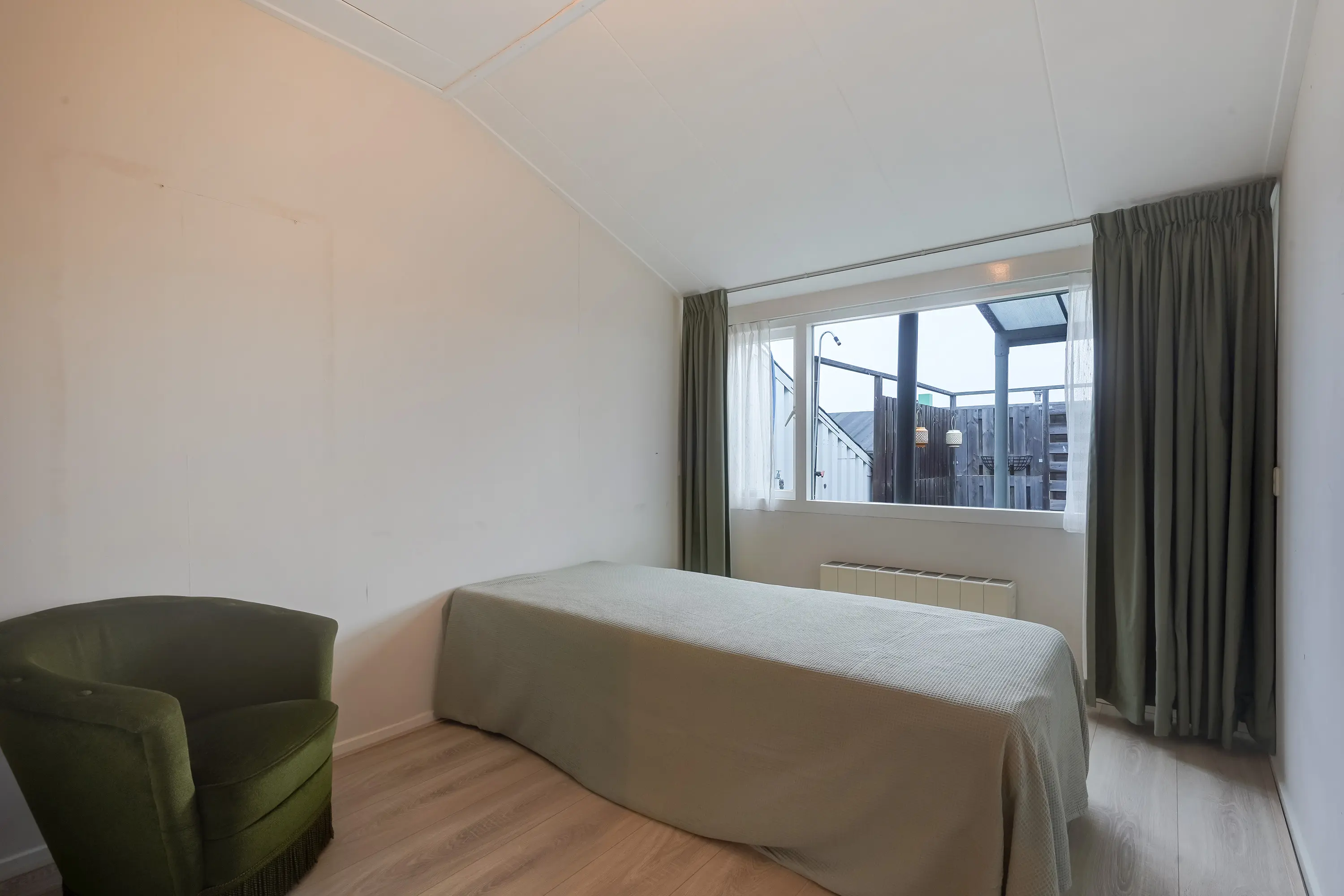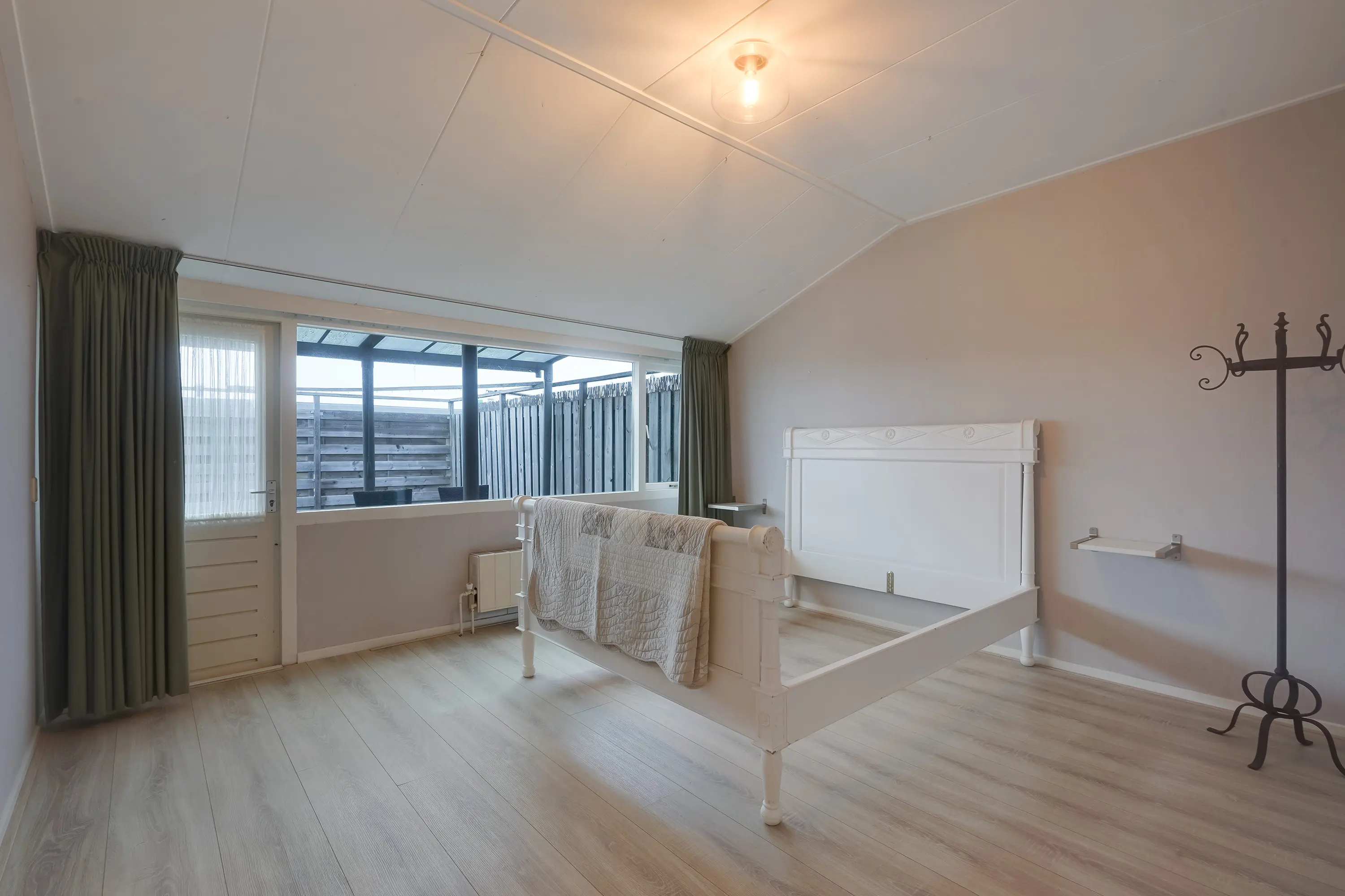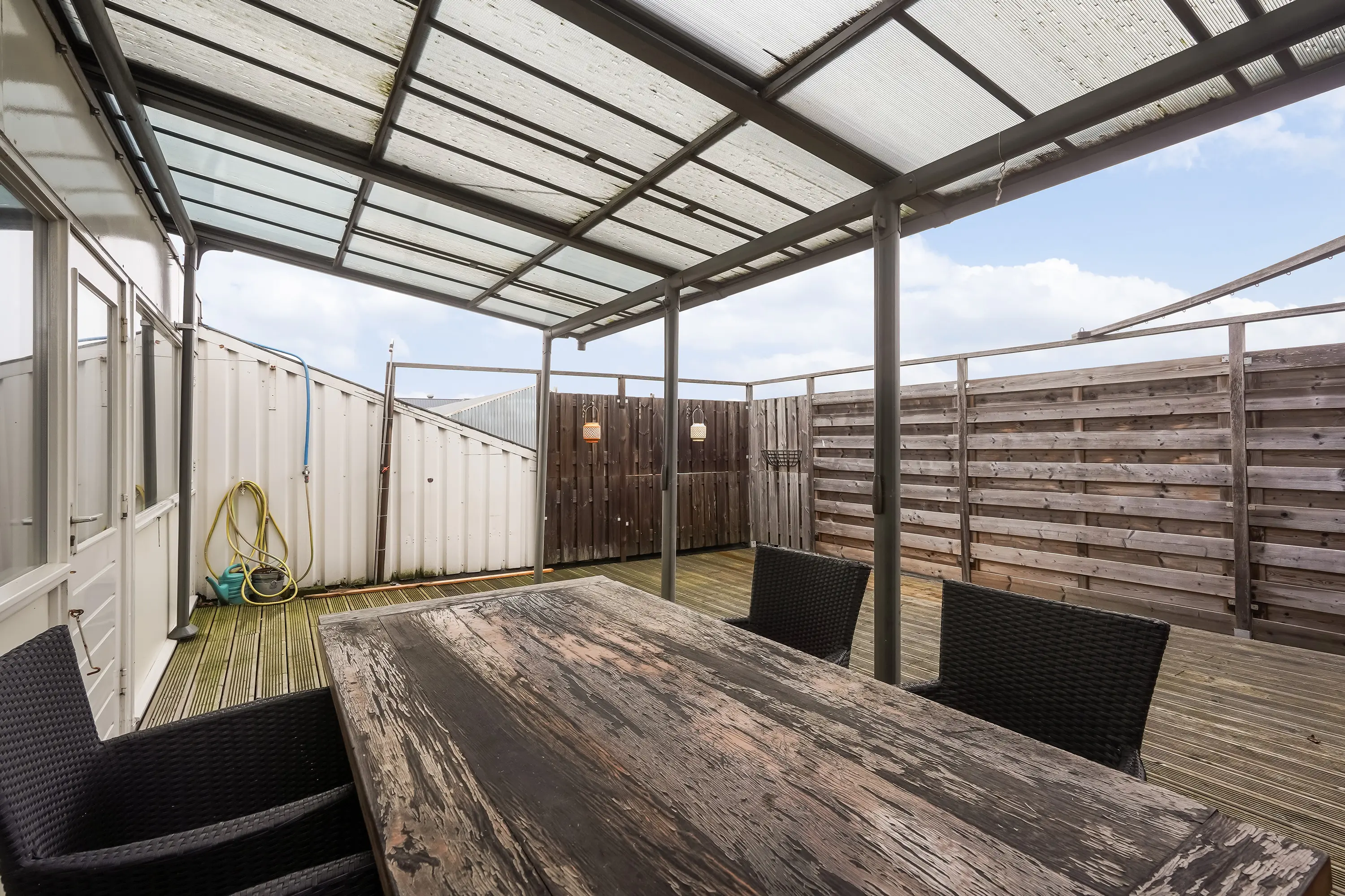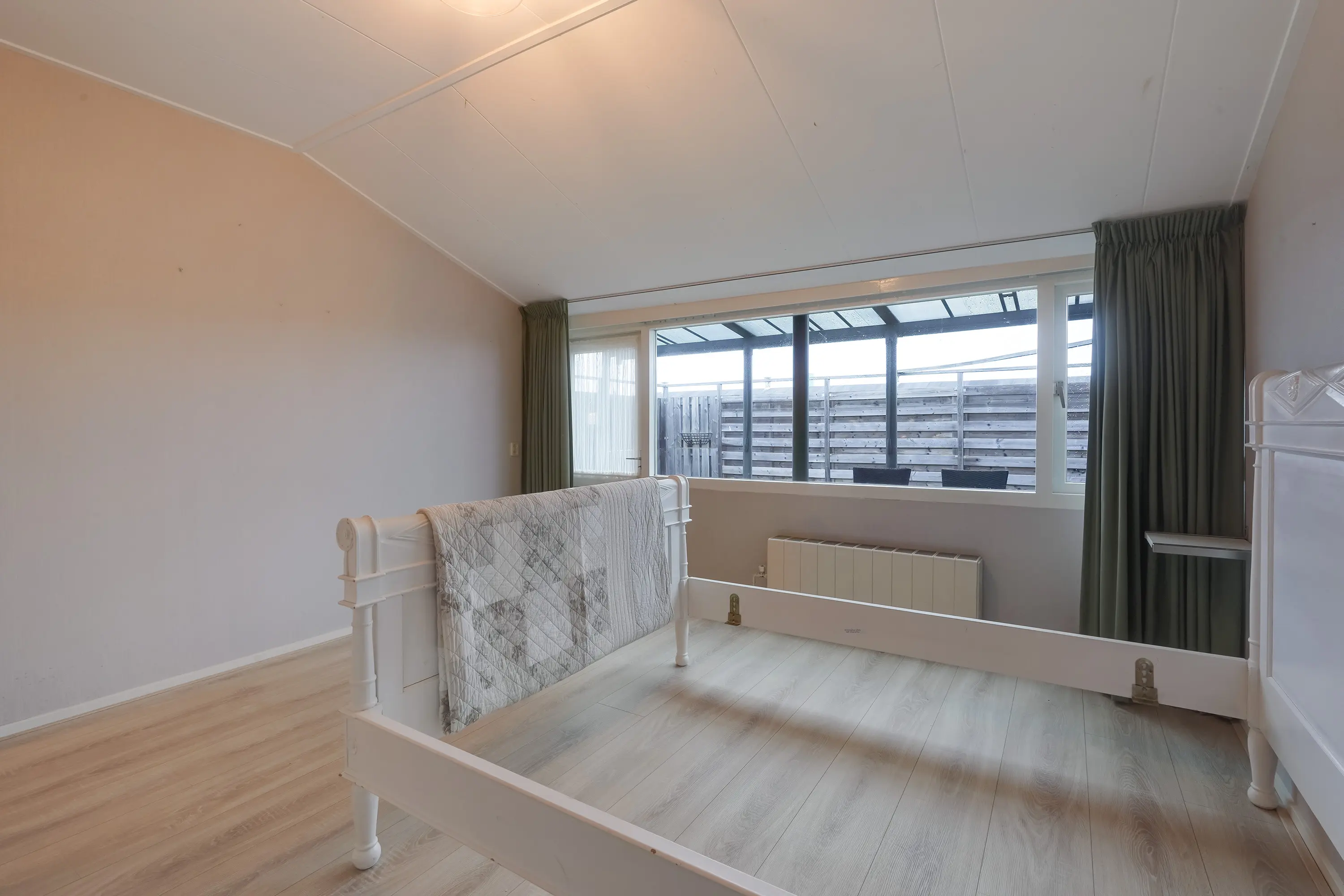 Twee slaapkamers aan de achterzijde, waarbij de hoofdslaapkamer een deur naar het achtergelegen en overkapte dakterras heeft.