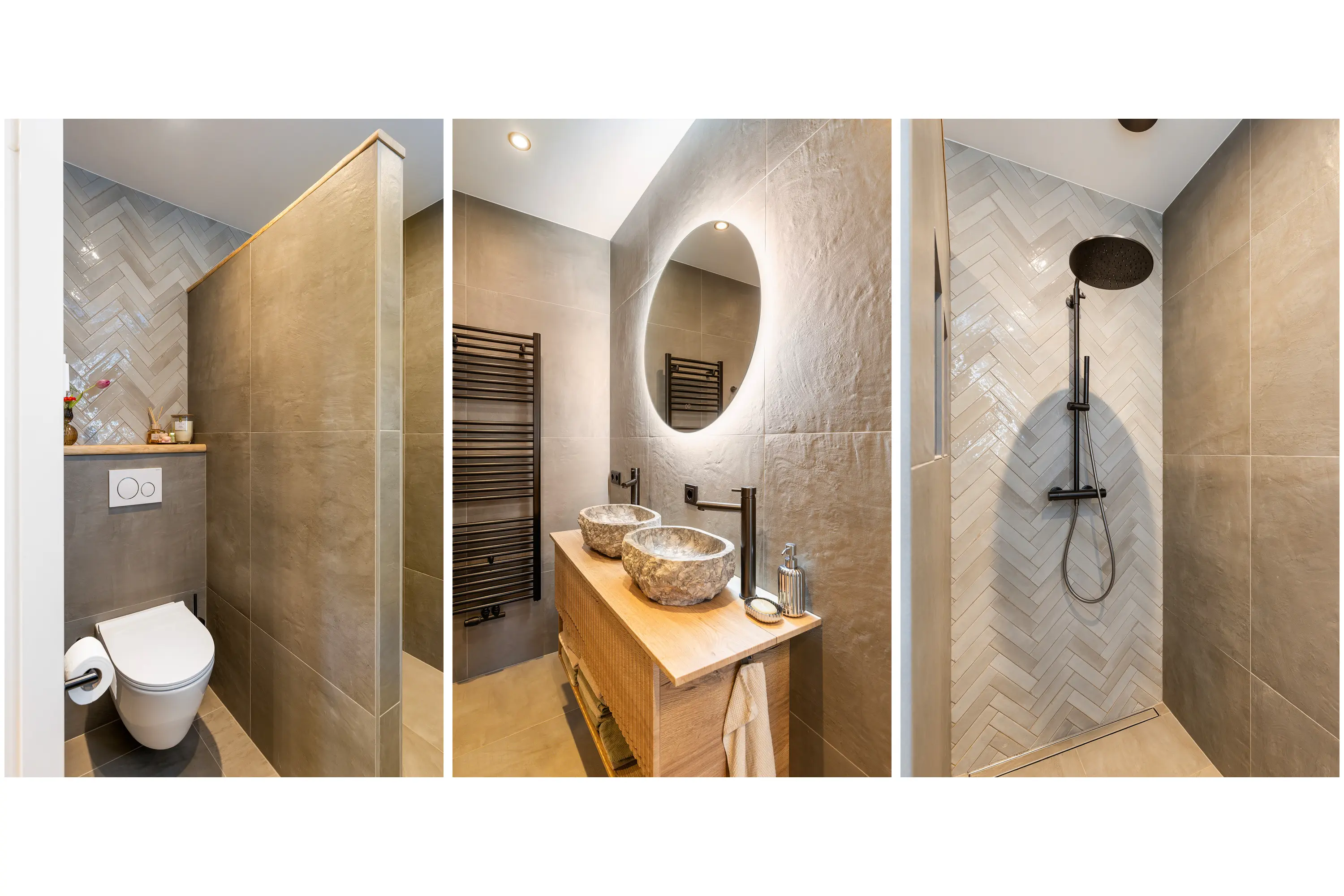 De badkamer (januari, 2025) is modern uitgevoerd en voorzien van een toilet, een dubbel wastafelmeubel en een inloopdouche met thermostaatkraan, regendouche en aparte handdouche. De combinatie van warm grijs-beige tegelwerk en een wastafelmeubel met houtlook geeft de badkamer een eigentijdse en luxe uitstraling. De badkamer wordt verwarmd middels een radiator. Daarbij zal de retourleiding in de vloer het hier 's-winters nog iets behaaglijker maken.