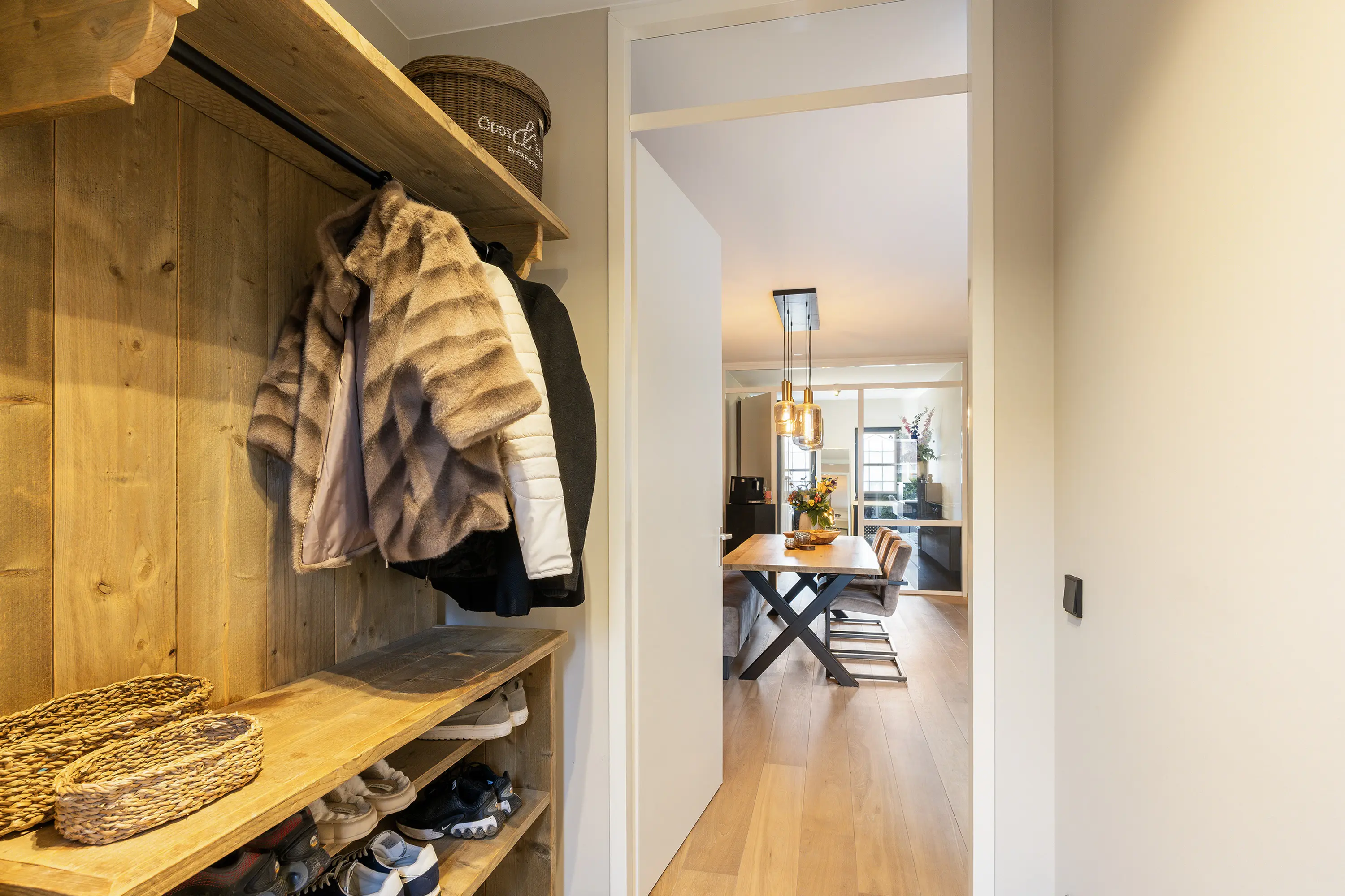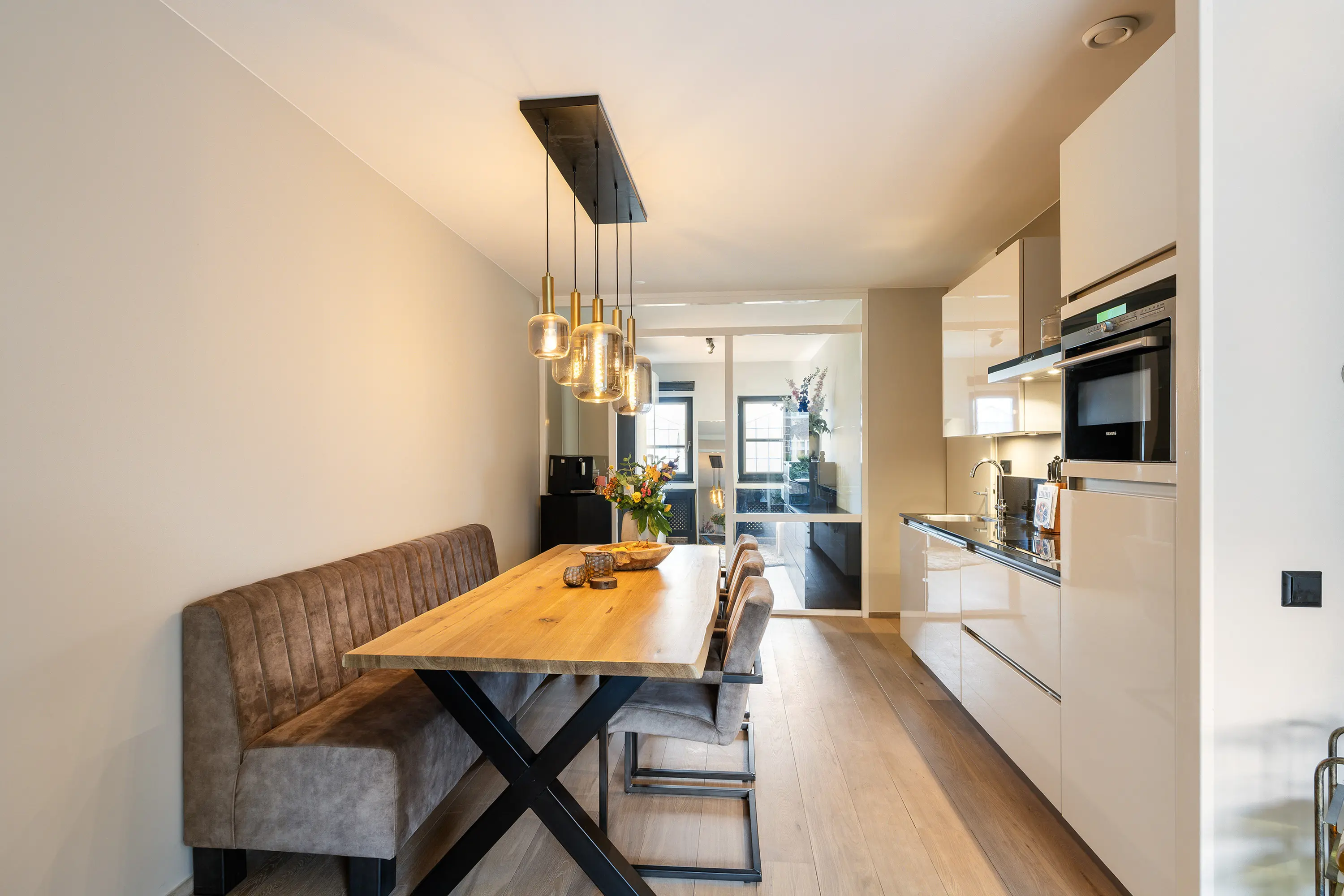 Aan de achterzijde van de woonkamer bevindt zich de eethoek, die in open verbinding staat met de keuken. De open keuken is uitgerust met diverse inbouwapparatuur, waaronder een inductiekookplaat, afzuiginstallatie, oven, koelkast met vriesvak en vaatwasser.