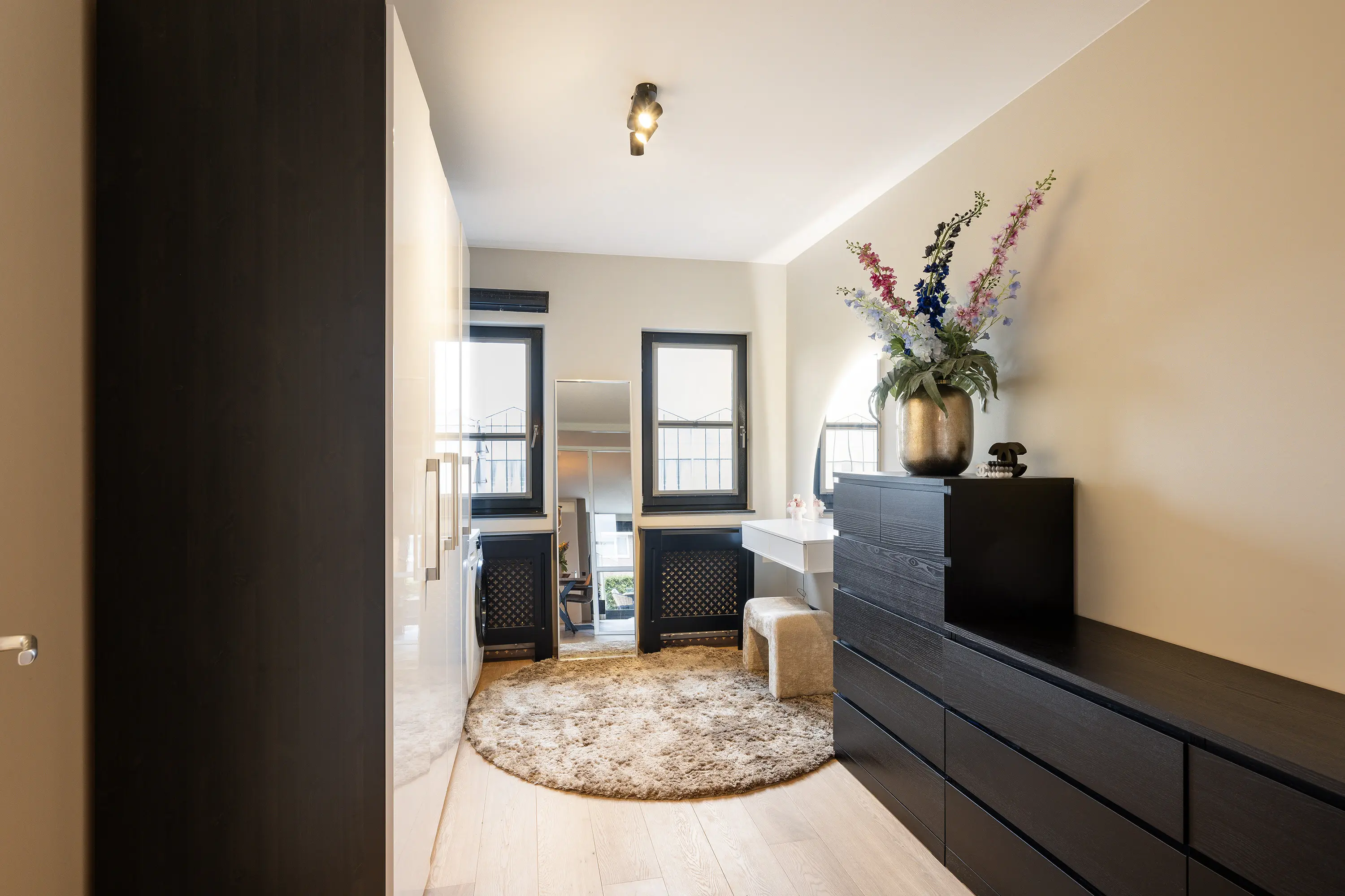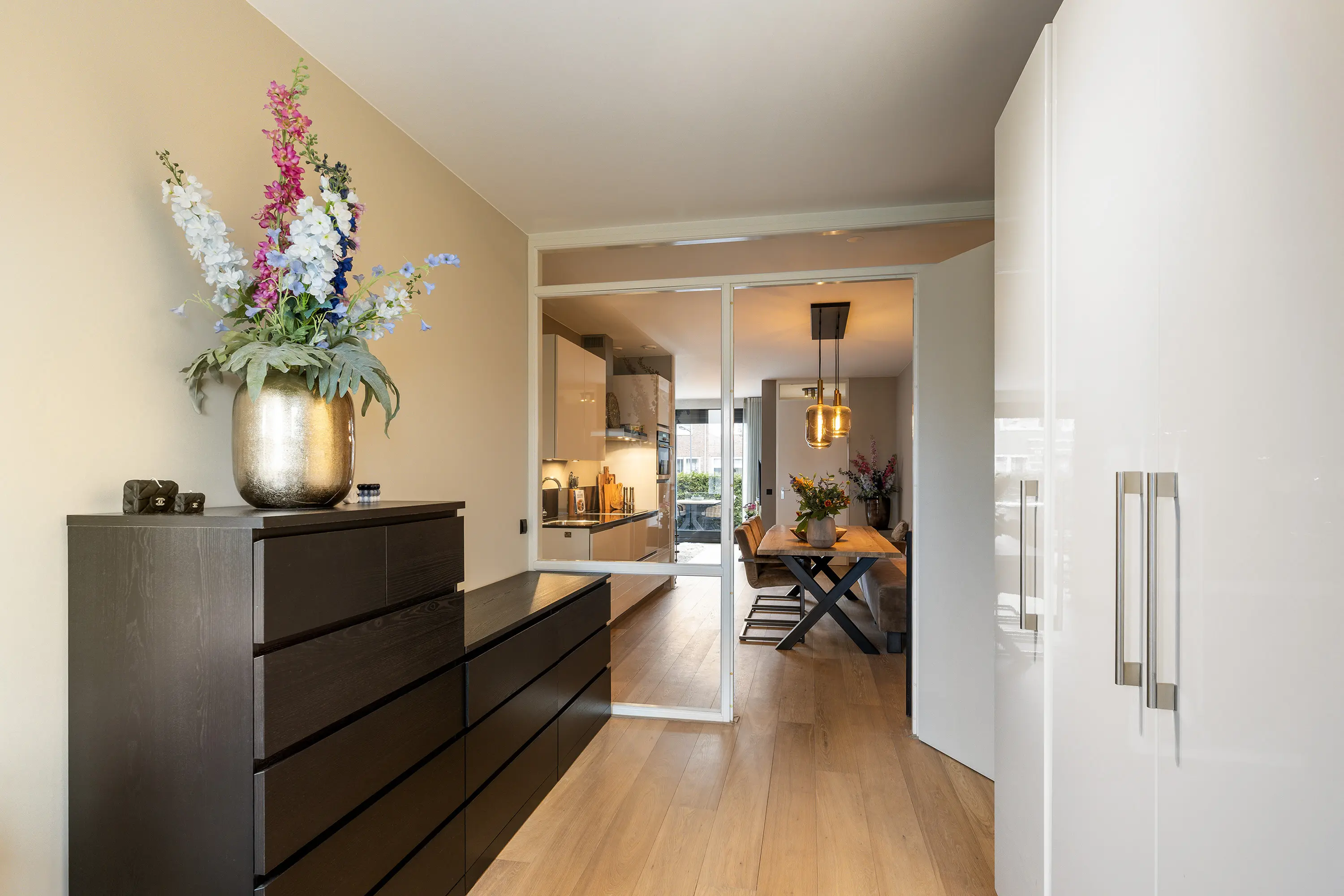 De eerste (slaap)kamer is eveneens gelegen aan de achterzijde van de woning en beschikt over een glazen wand en deur met zicht op de eethoek en keuken. Dankzij de aanwezige raampartij en prettige lichtinval is deze ruimte uitstekend geschikt als slaapkamer, werkkamer of hobbyruimte. Momenteel wordt de kamer gebruikt als inloopkast en kleedruimte.