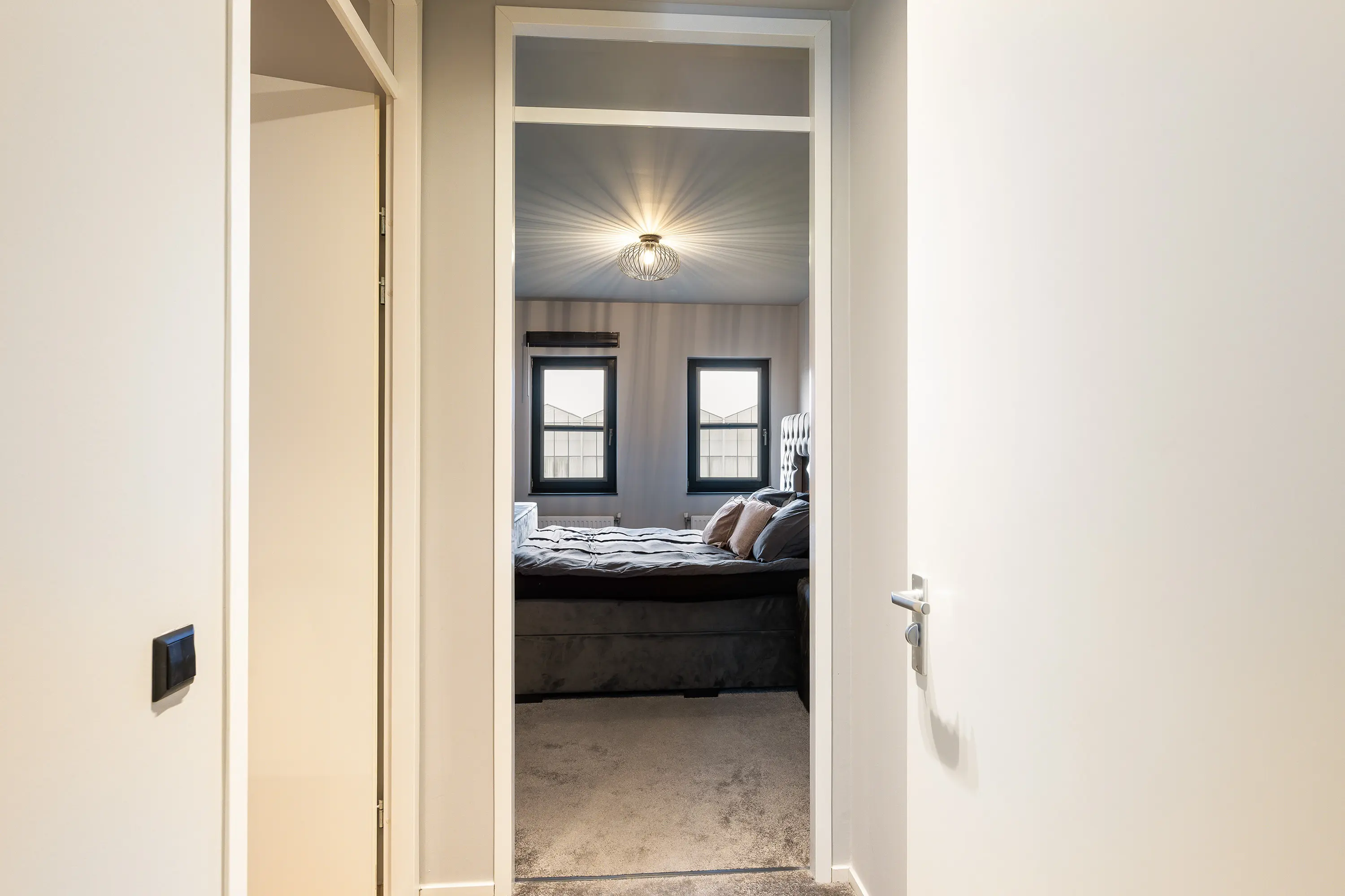 - Hoofdslaapkamer aan de achterzijde met twee ramen en een warme, sfeervolle afwerking