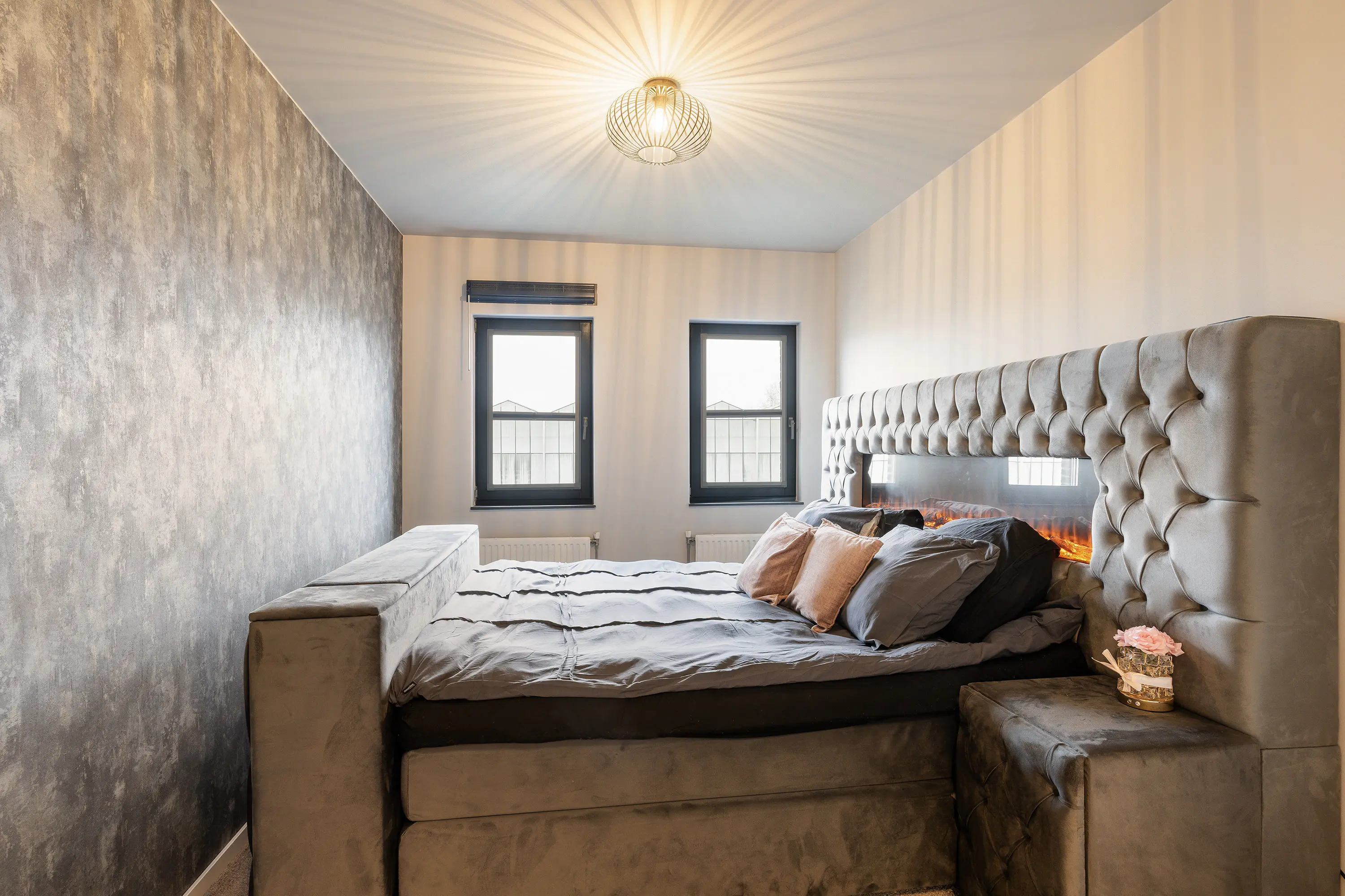 De hoofdslaapkamer ligt aan de achterzijde van de woning en beschikt over twee ramen, wat zorgt voor voldoende daglicht. Een wand is afgewerkt met een bruin-grijzig behang, wat de kamer een warme en sfeervolle uitstraling geeft.