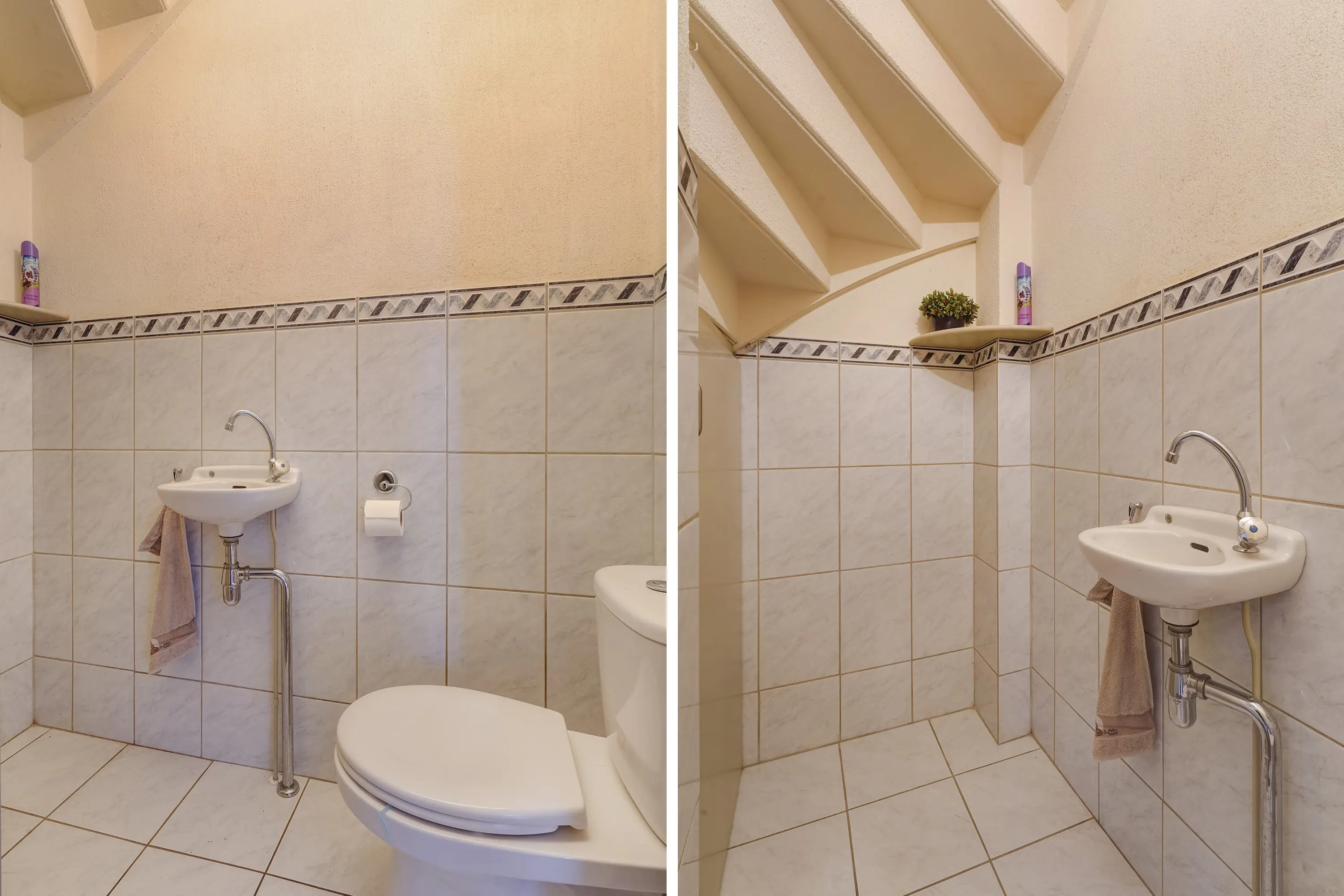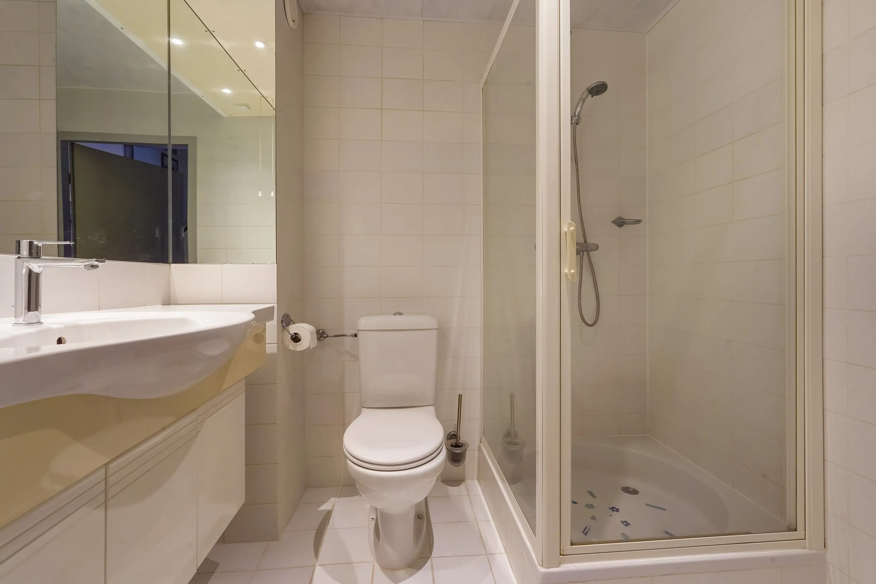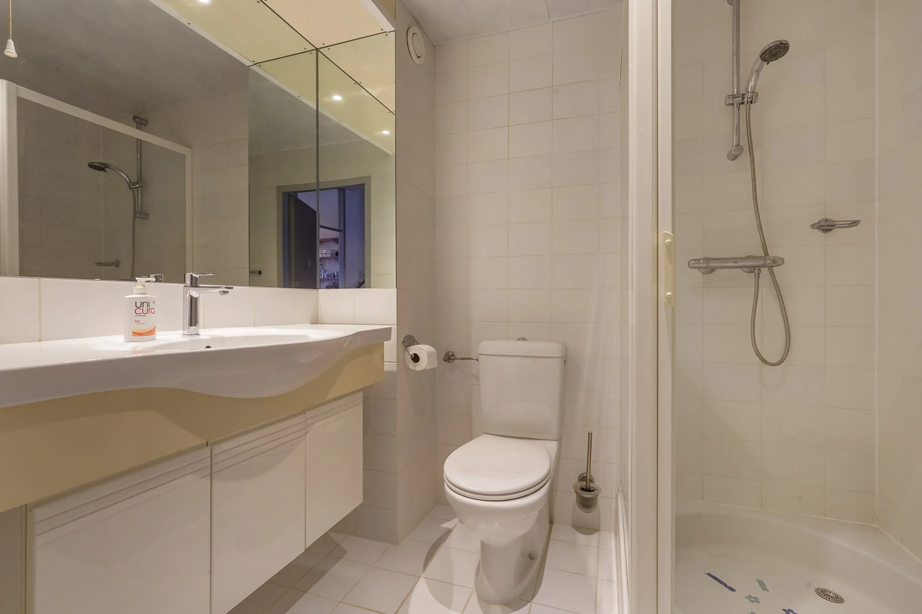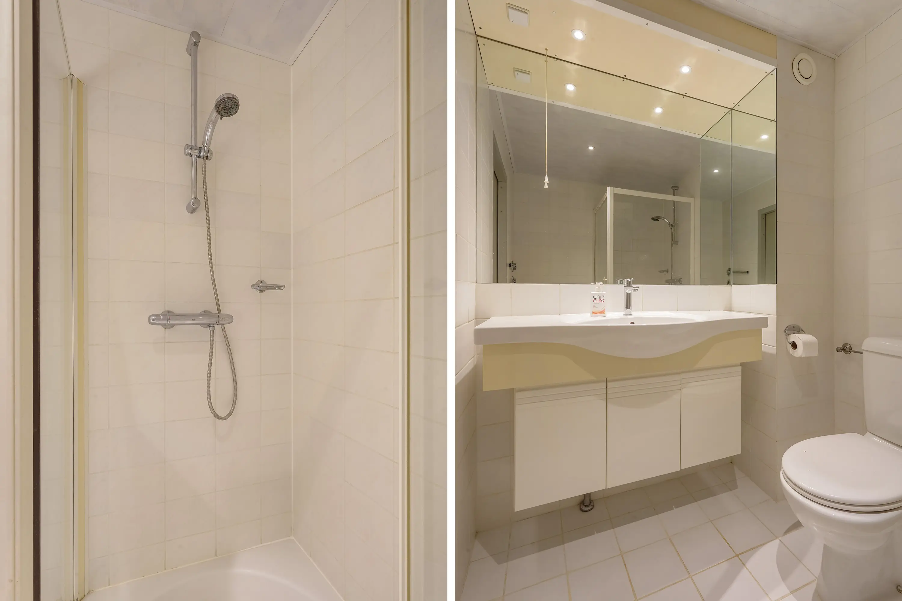 Terug op de overloop bevindt zich in het midden, recht tegenover de trap, de deur naar de badkamer. De badkamer is afgewerkt met strakke witte tegels en beschikt over een douche, toilet en wastafelmeubel.