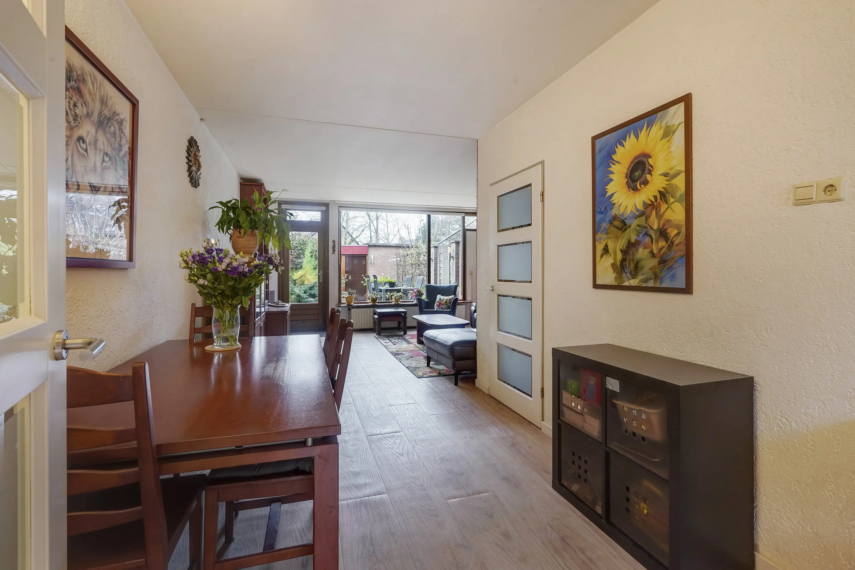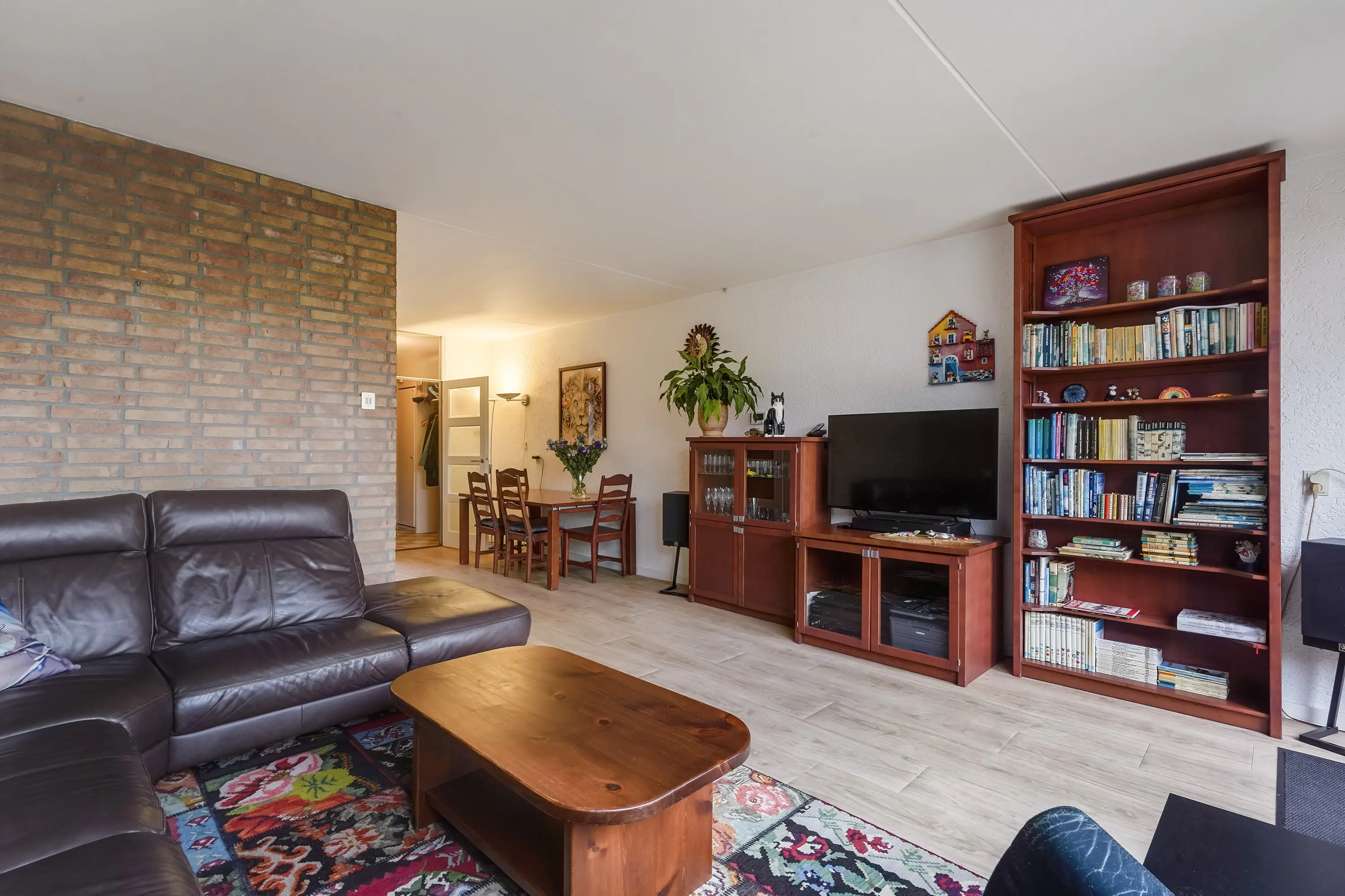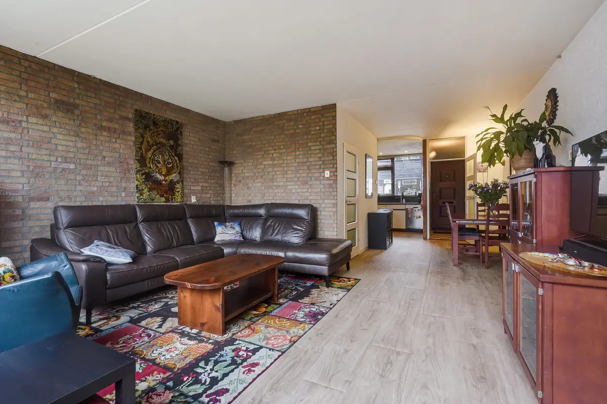 De woonkamer heeft een L-vormige opstelling, waardoor een gedeeltelijke scheiding ontstaat tussen de eetkamer/keuken en het zitgedeelte. De eethoek bevindt zich in de doorloop van de keuken naar de zithoek, tegenover de deur naar de hal.