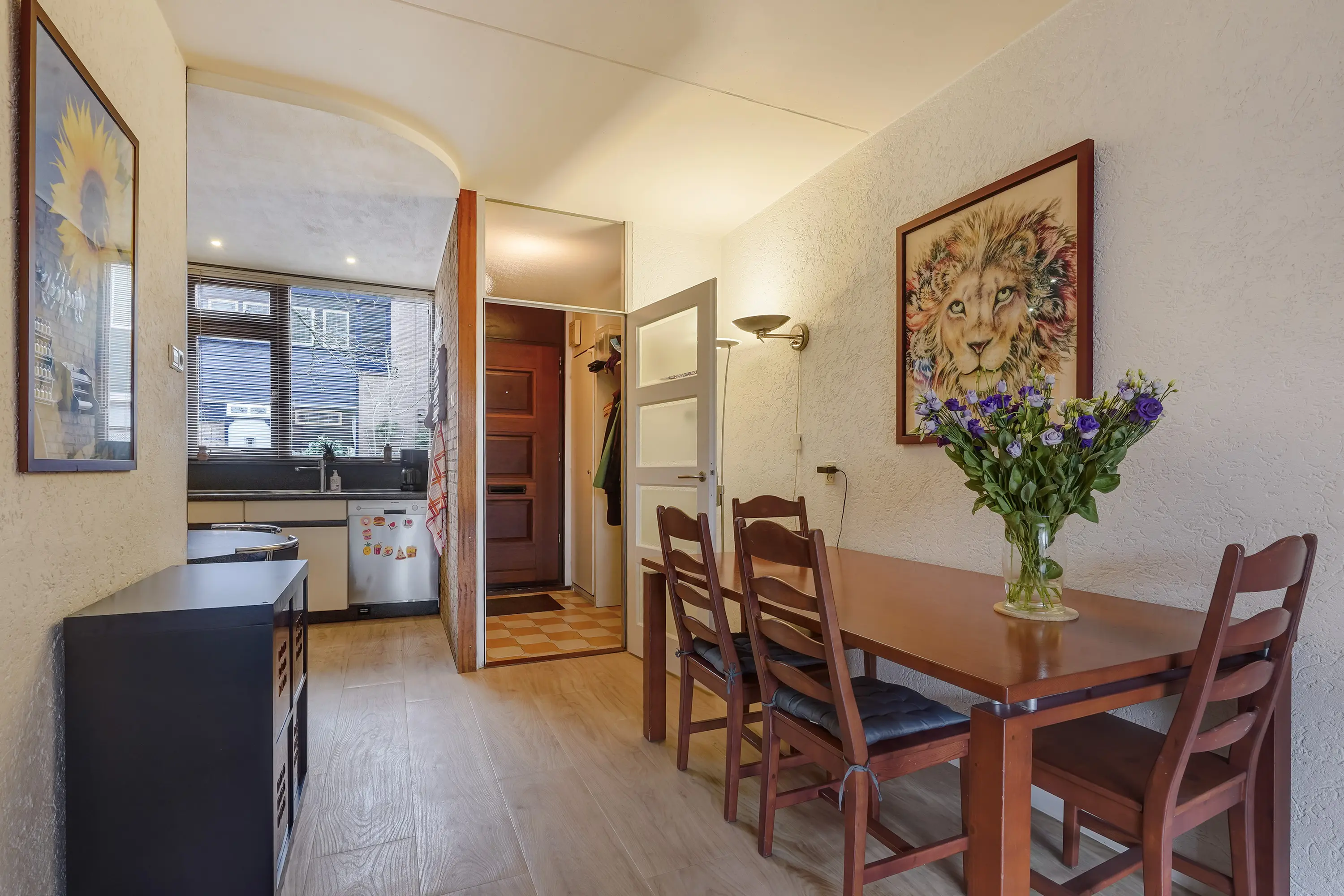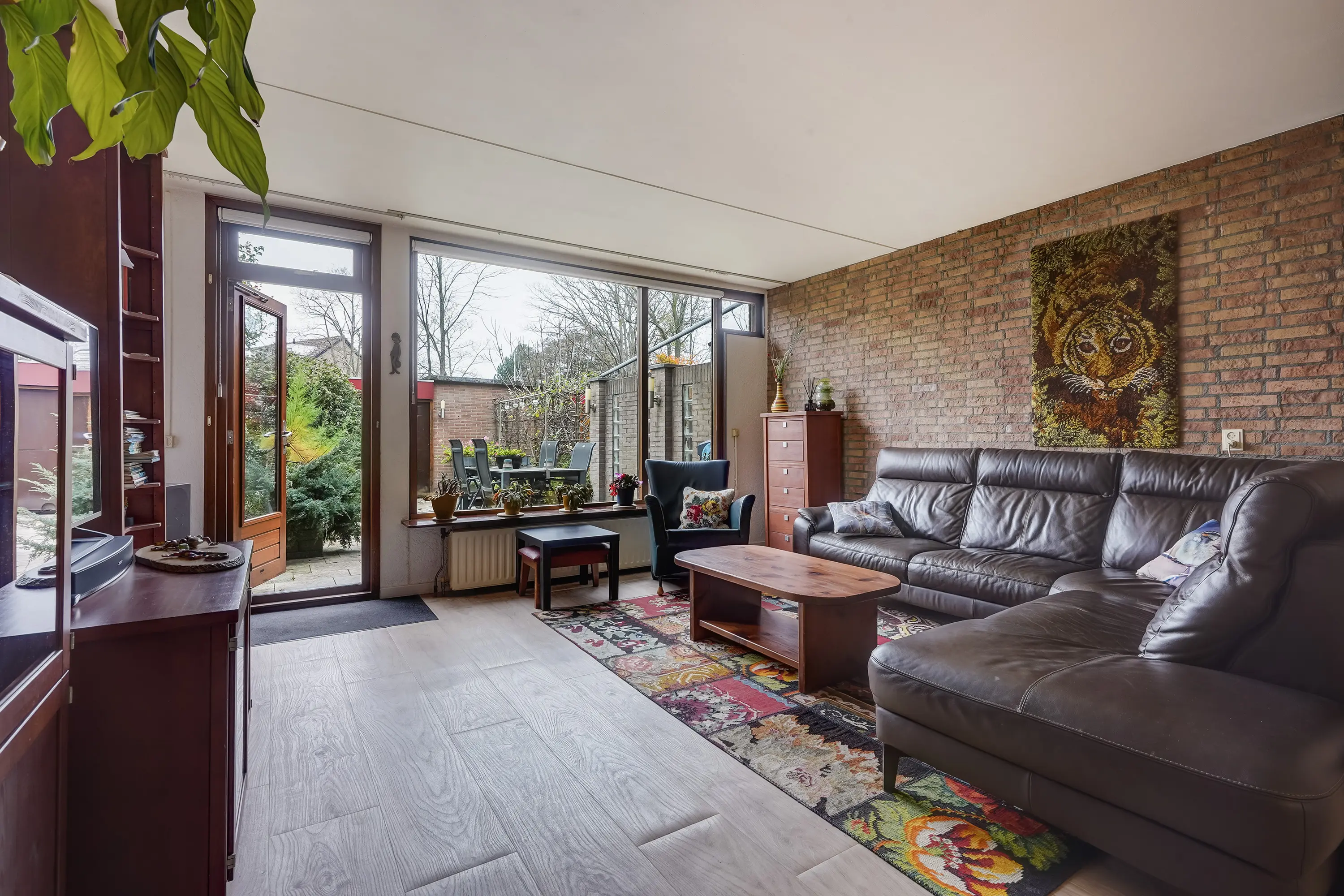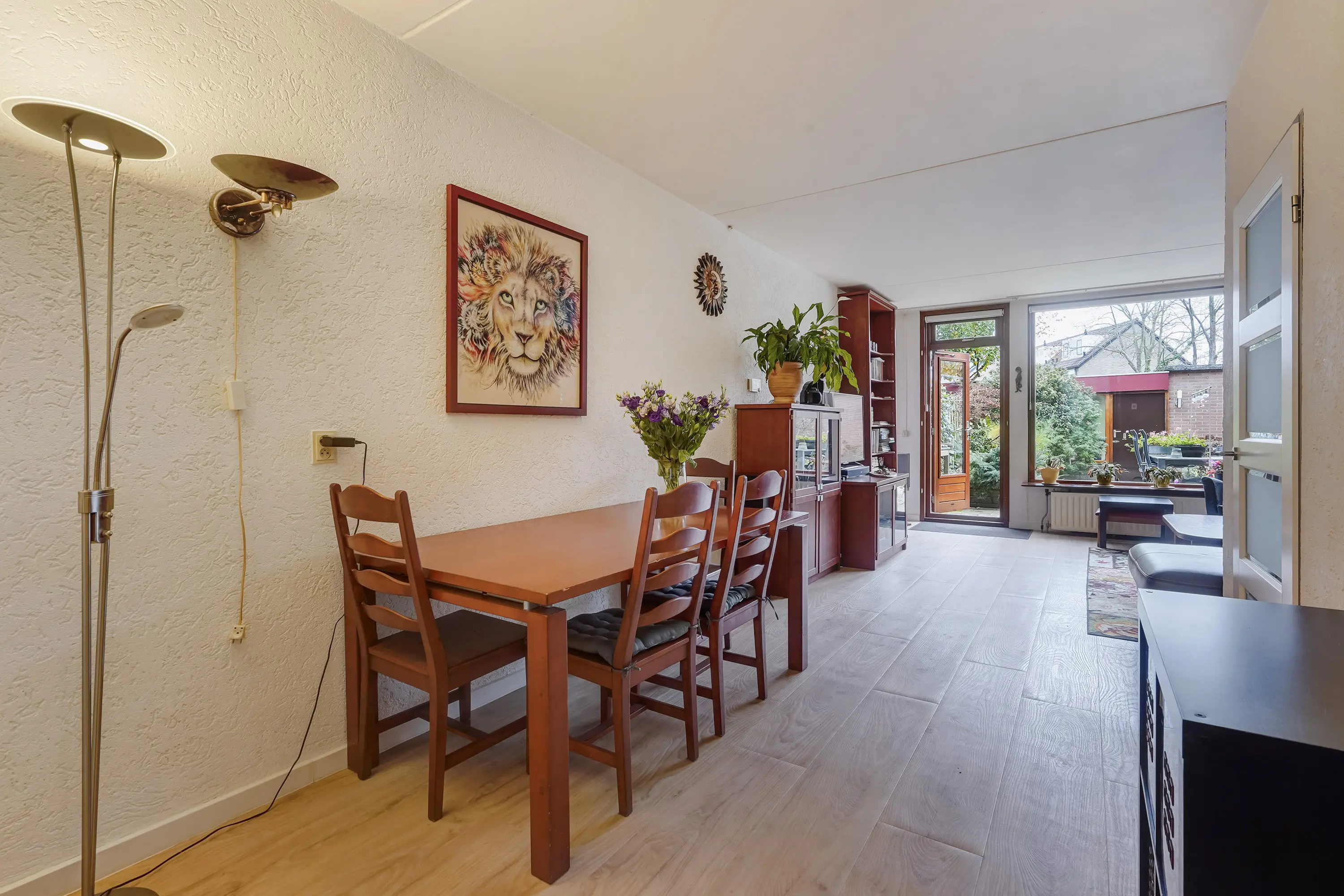 De woonkamer heeft een L-vormige opstelling, waardoor een gedeeltelijke scheiding ontstaat tussen de eetkamer/keuken en het zitgedeelte. De eethoek bevindt zich in de doorloop van de keuken naar de zithoek, tegenover de deur naar de hal.