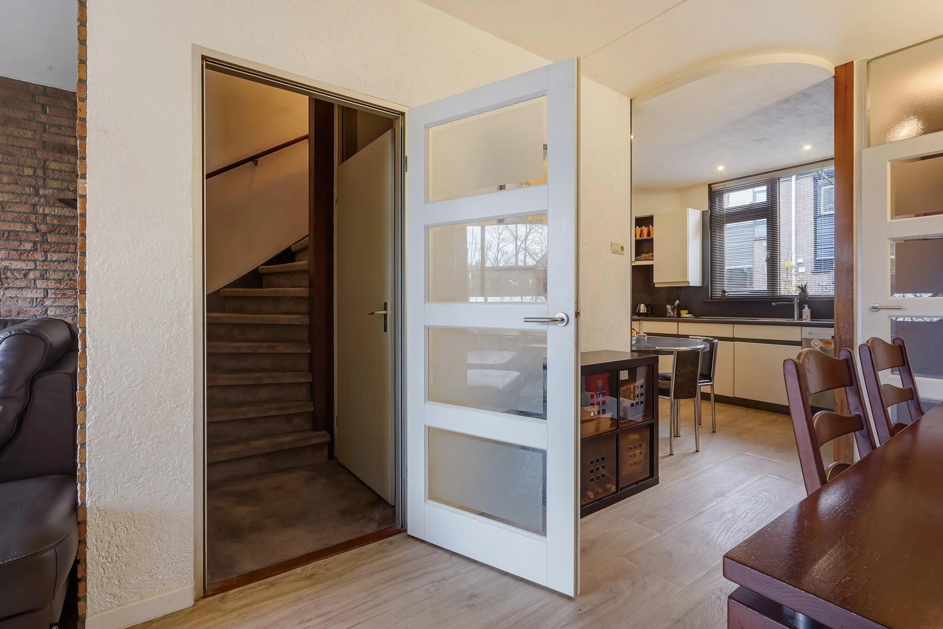 Tussen de keuken en de woonkamer bevindt zich de deur naar de hal. Via deze hal heeft u toegang tot het ruime toilet met fontein en de trapopgang naar de eerste verdieping.