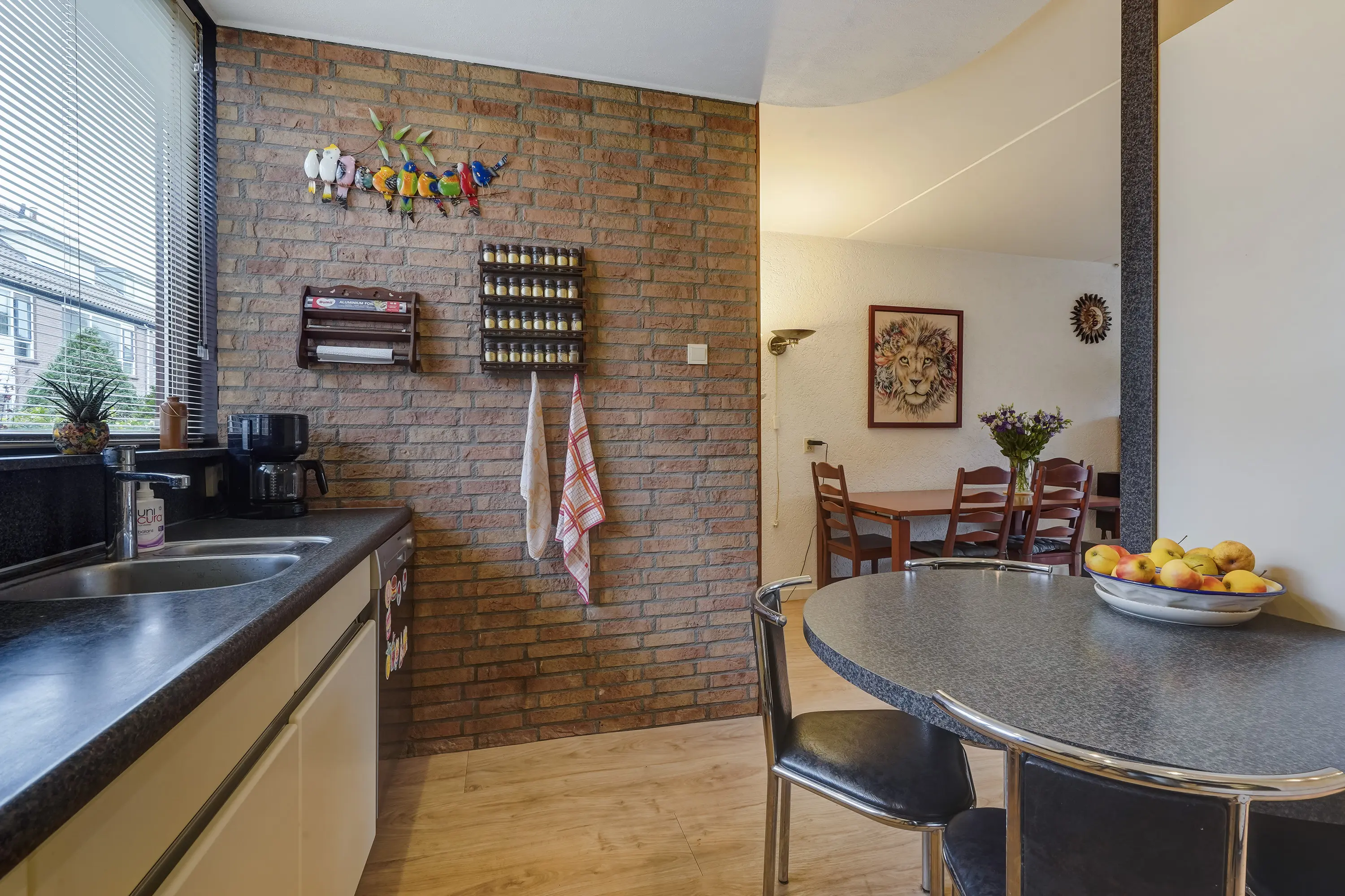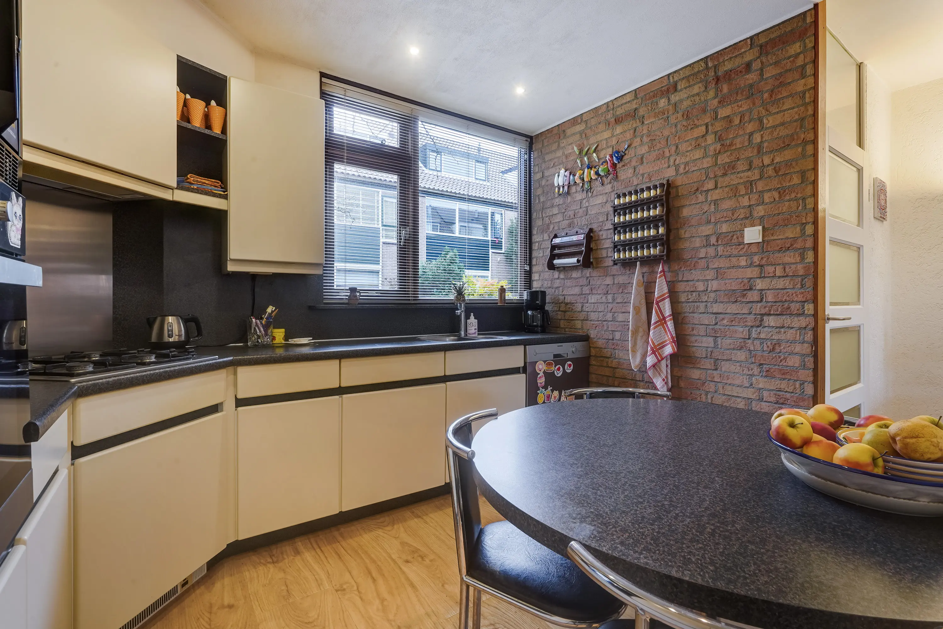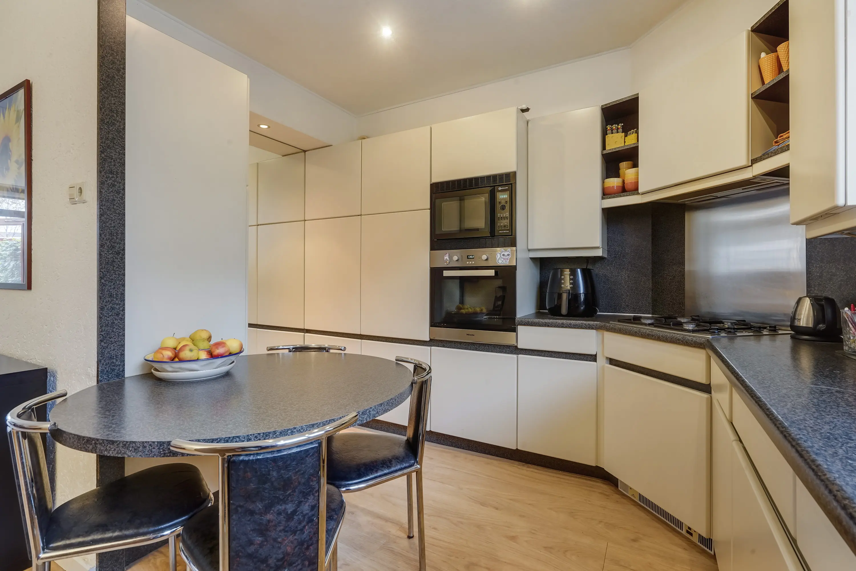 De open keuken ligt aan de voorzijde van de woning. De keuken is uitgerust met diverse inbouwapparatuur, waaronder een 4-pits gaskookplaat, afzuigkap, koelkast, vriezer, vaatwasser, oven en magnetron. Daarnaast staat er momenteel een kleine ronde eettafel. Het keukenraam zorgt voor prettig lichtinval.