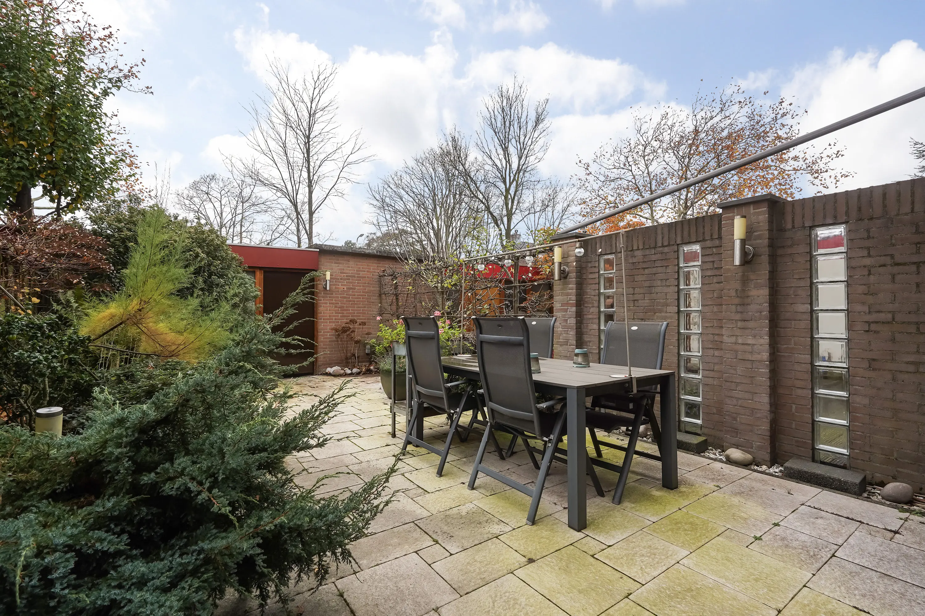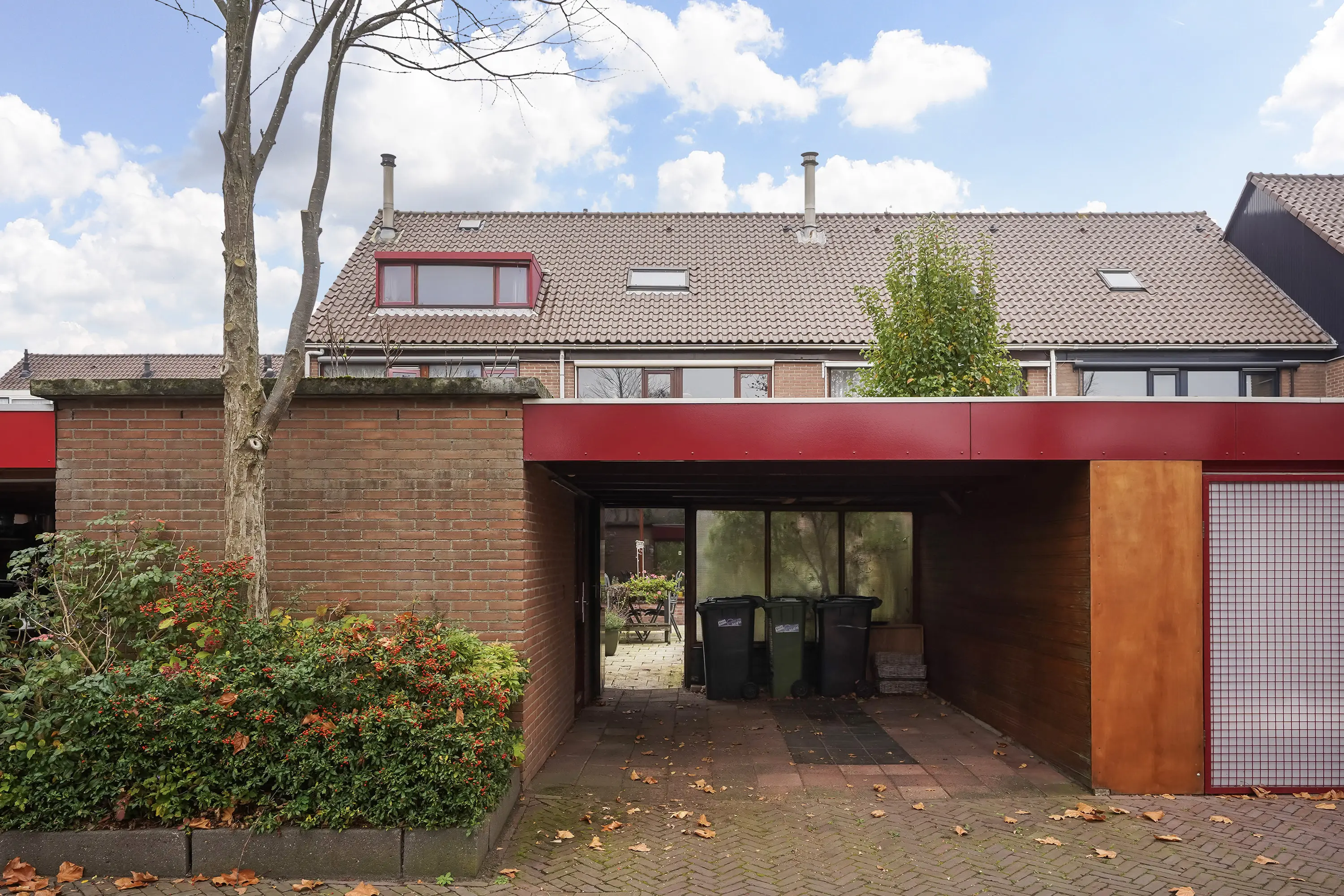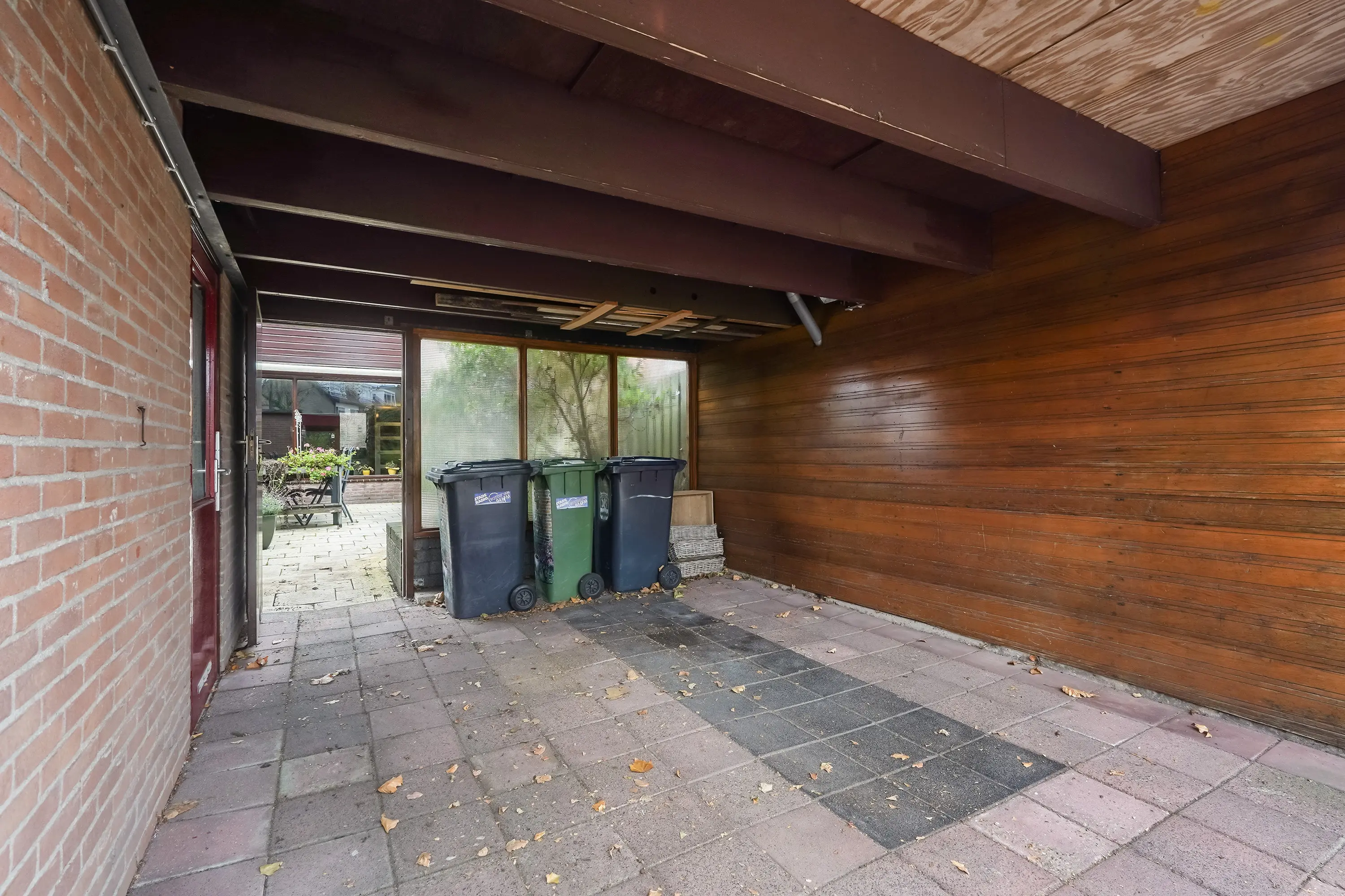 Achter in de woonkamer bevindt zich een grote glazen pui met een deur naar de diepe achtertuin. De tuin biedt voldoende ruimte om meerdere zitplekken te creëren. Achterin de tuin vindt u een doorgang naar de overkapping/carport, waar u uw auto kunt parkeren. Rechts in de carport bevindt zich een deur naar de berging van circa 6 m², ideaal voor opslag.