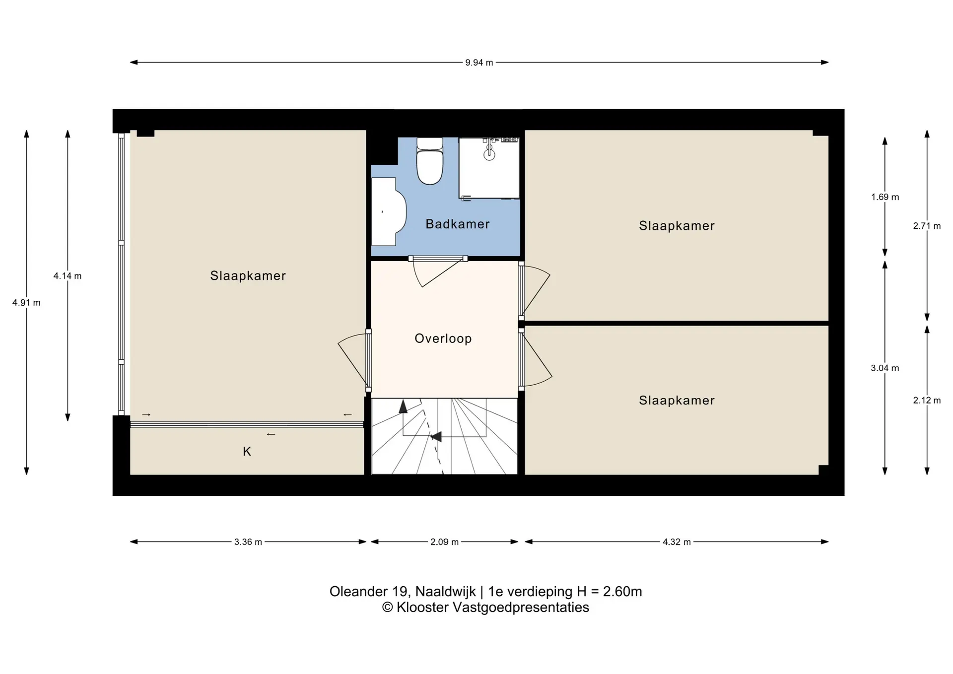 Aan de rechterzijde van de overloop bevinden zich twee deuren die toegang geven tot tweede en derde slaapkamer.
