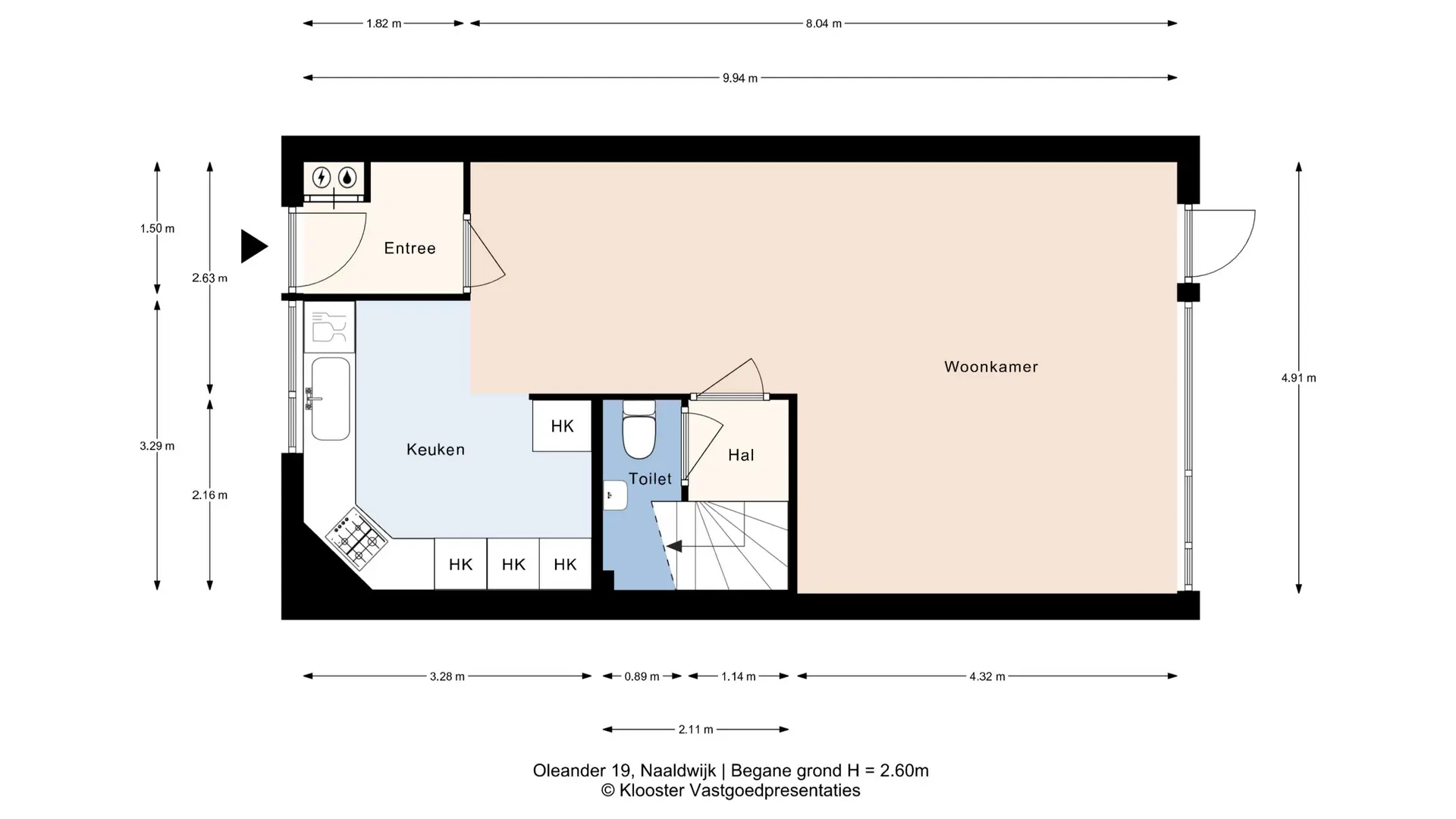 Wanneer u de woning binnenkomt, arriveert u in de entree. Links bevindt zich de meterkast en rechtdoor vindt u de deur naar de woonkamer/eetkamer.