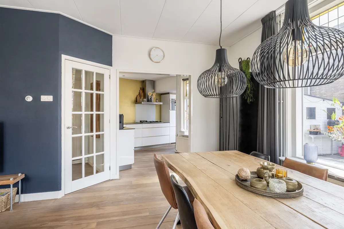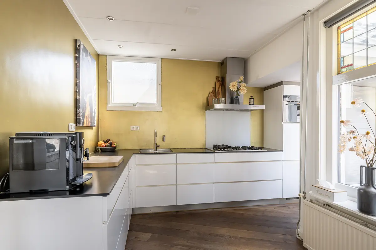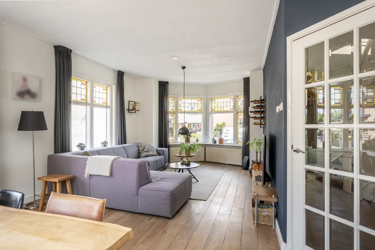 Deze leefruimte van circa 37 m² is het kloppend hart van de woning. De erker aan de voorzijde zorgt voor veel lichtinval en geeft de kamer een vriendelijke uitstraling. Het glas-in-lood en de fraaie parketvloer dragen bij aan de authentieke sfeer, terwijl de ruimte praktisch is ingedeeld en mogelijkheden biedt voor zowel een royale zithoek als een grote eettafel.