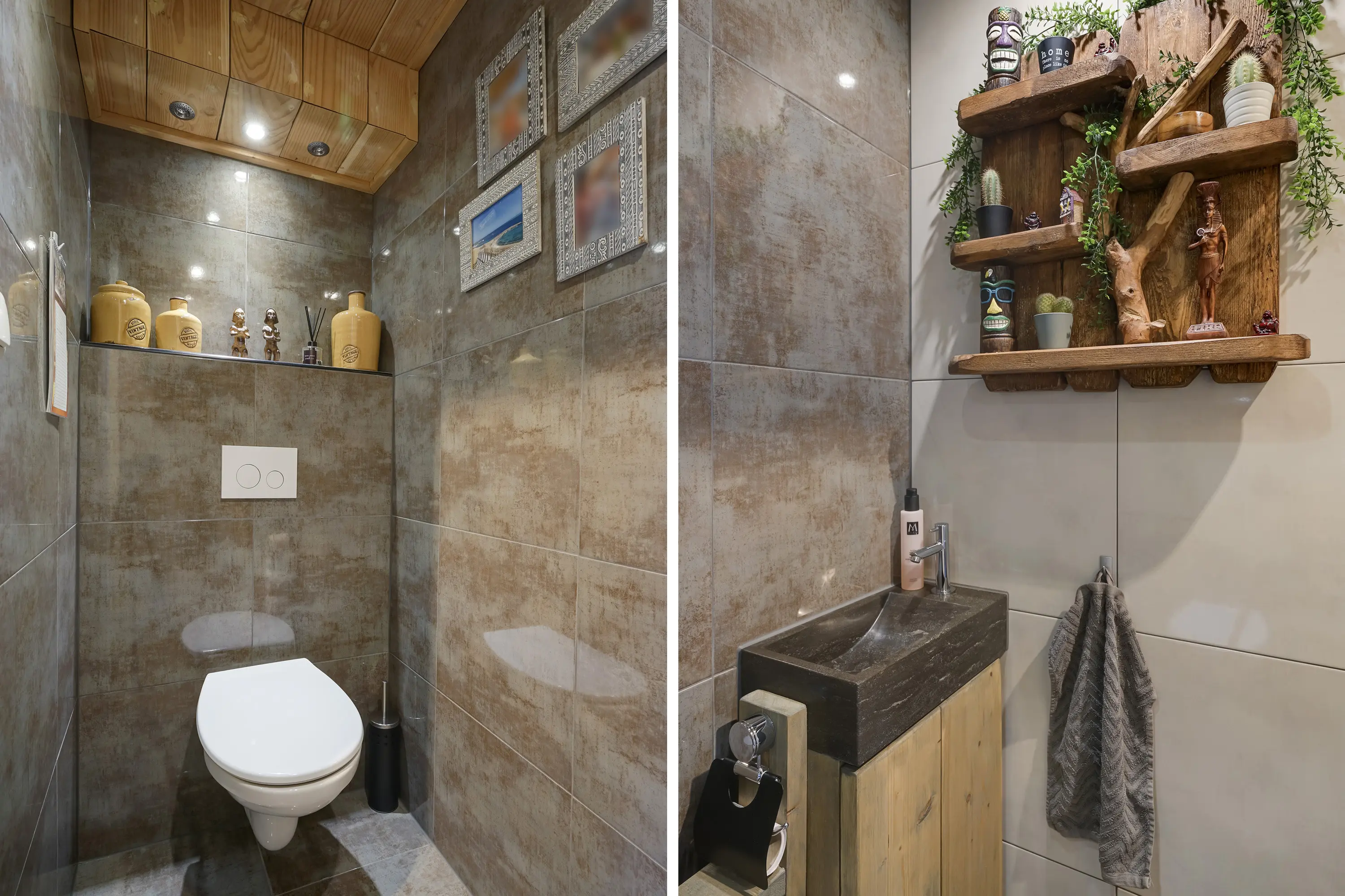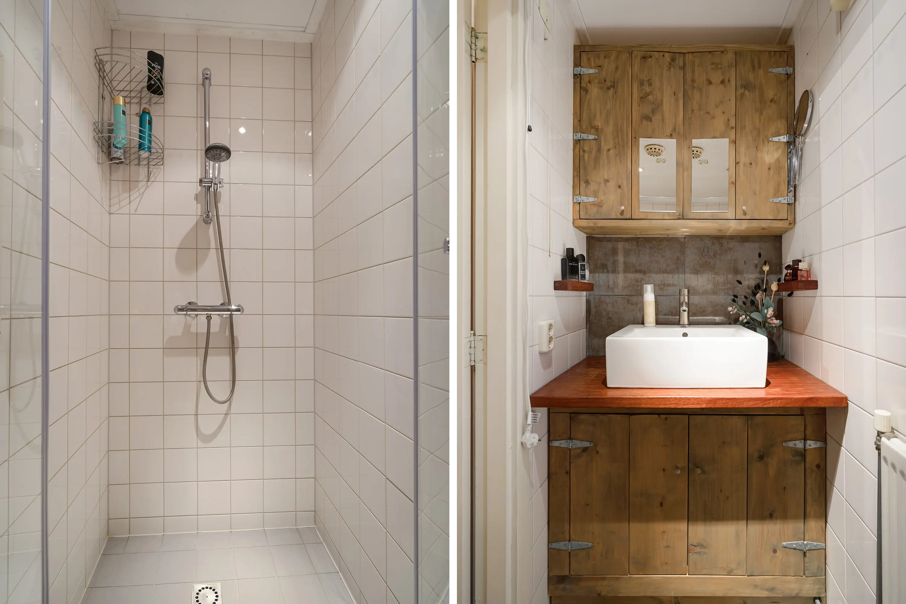 De badkamer is aan de voorzijde van de woning gesitueerd en beschikt over een douche met thermostaatkraan en een wastafelmeubel met houten kasten. De badkamer is uitgevoerd in een tijdloze stijl met witte tegels.