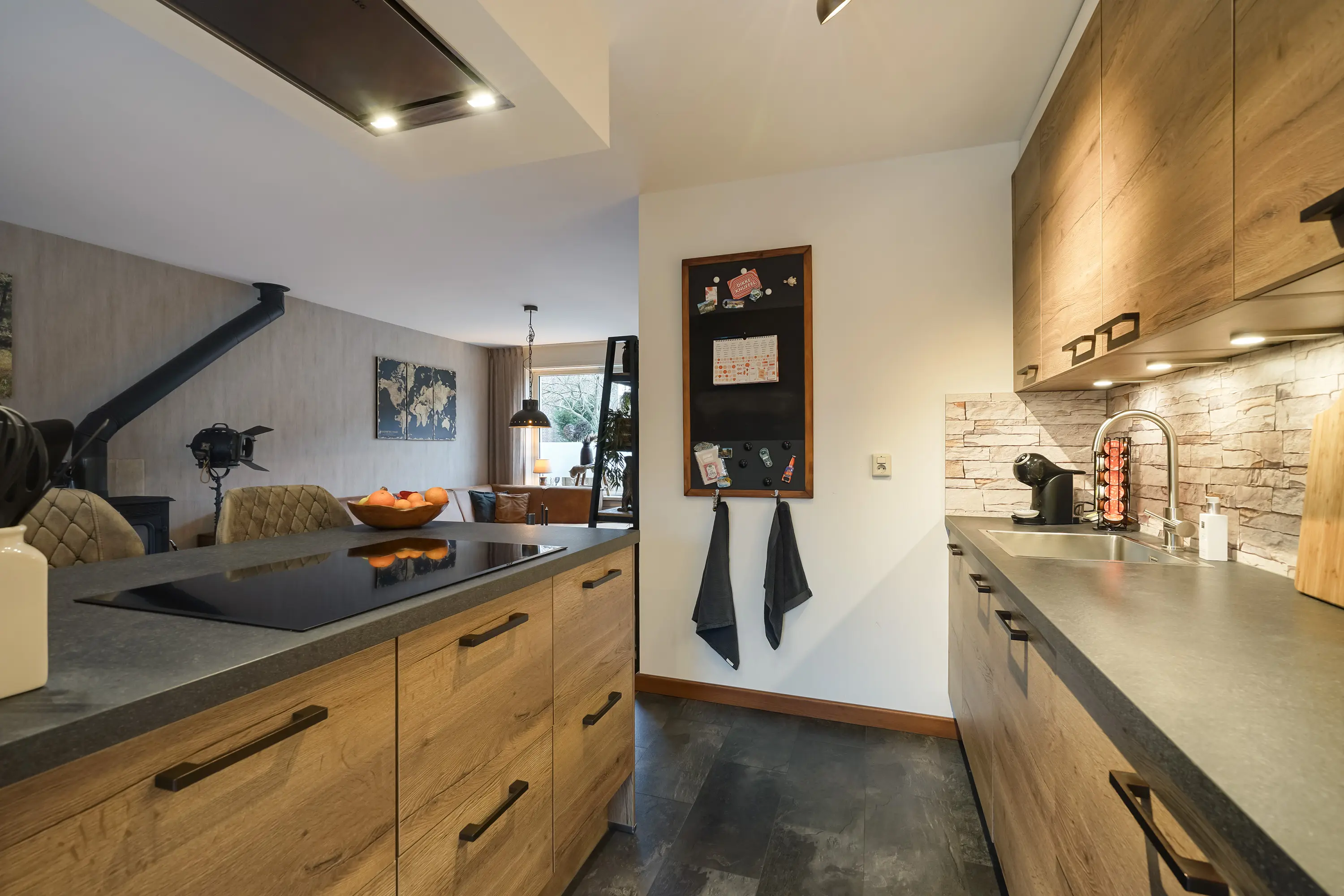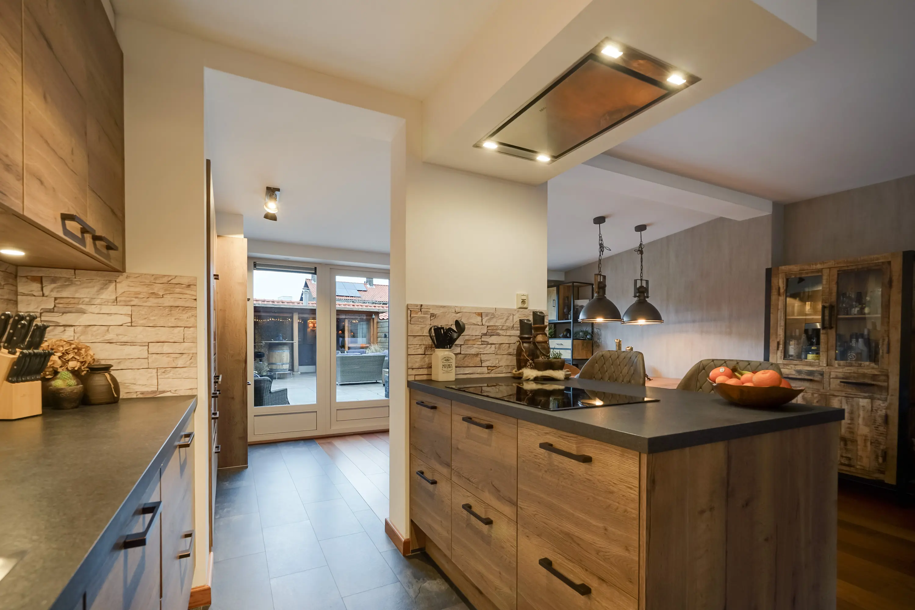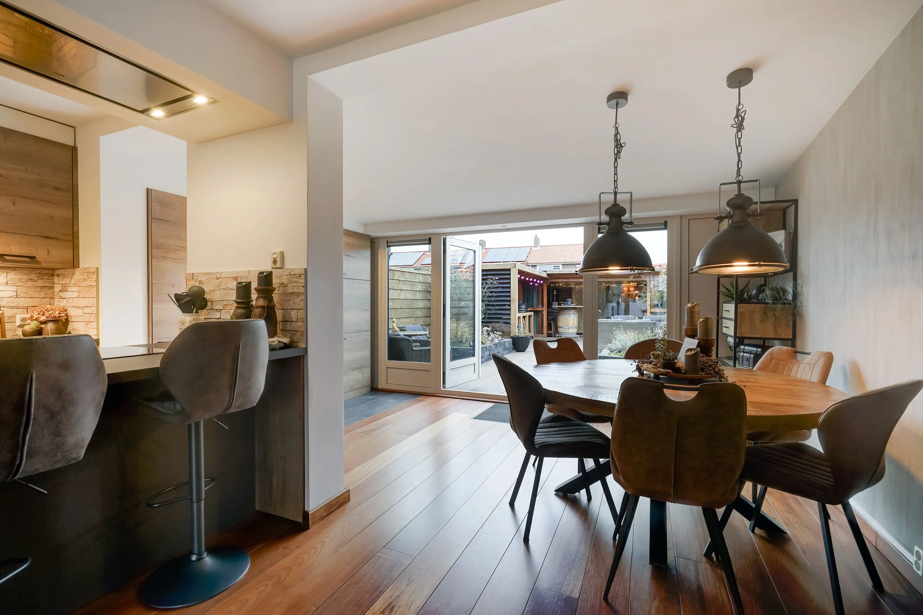 Aan de achterzijde van de woning bevinden zich de keuken en eethoek. De keuken is ingericht met een kookeiland waaraan barstoelen zijn geplaatst, ideaal voor zowel koken als gezellig samenzijn. De vloer is afgewerkt met hout en de keuken heeft een moderne houtlook uitstraling. Verder is de keuken voorzien van diverse inbouwapparatuur, waaronder een inductiekookplaat, vaatwasser, koelkast, vriezer en een combi-oven. Dankzij de vele kasten is er ruim voldoende opbergruimte.