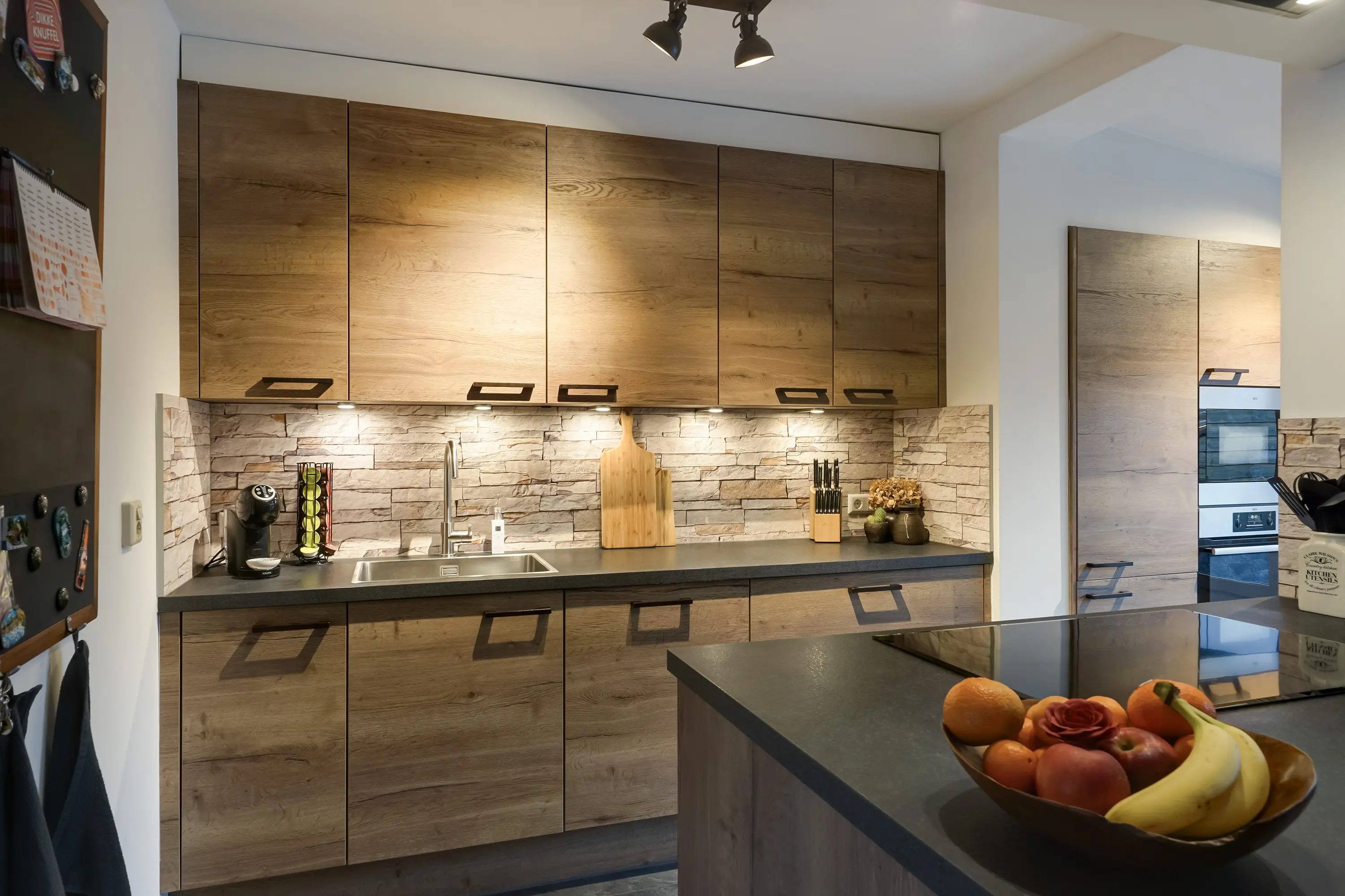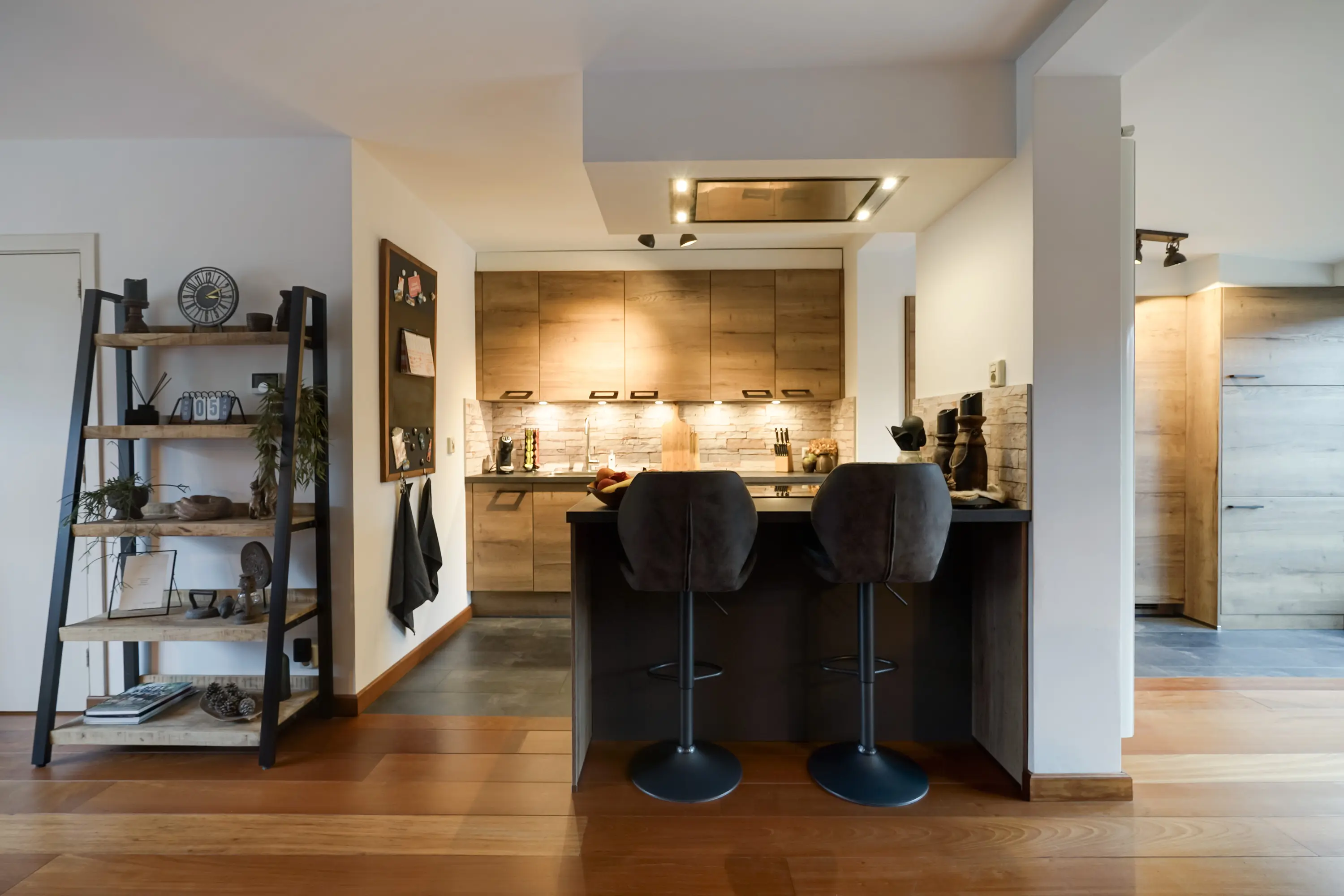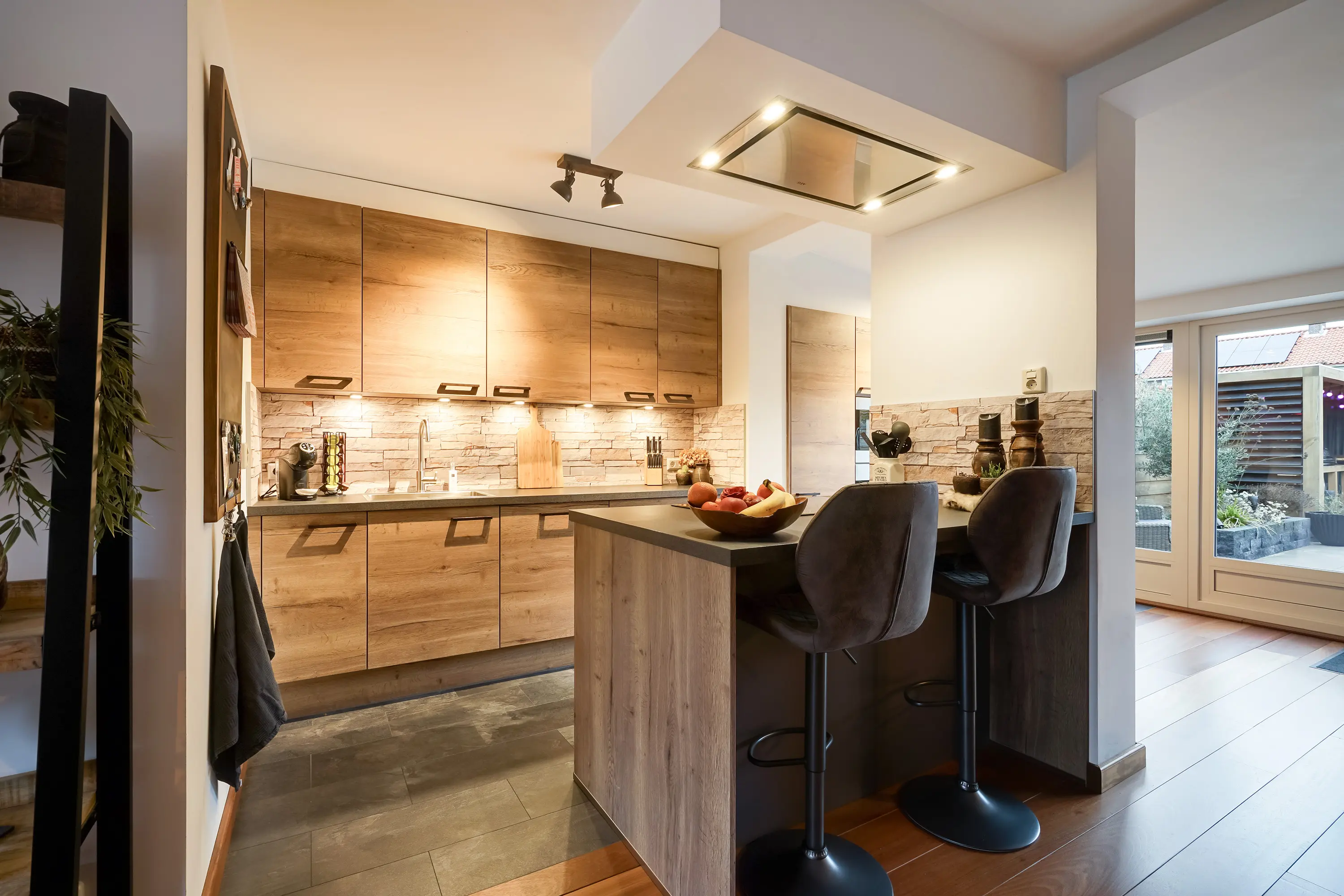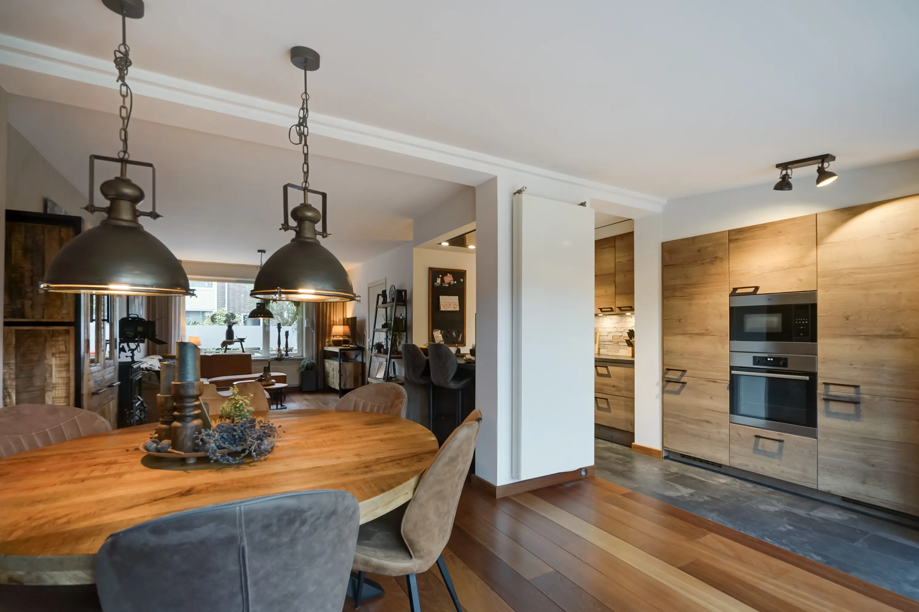 Aan de achterzijde van de woning bevinden zich de keuken en eethoek. De keuken is ingericht met een kookeiland waaraan barstoelen zijn geplaatst, ideaal voor zowel koken als gezellig samenzijn. De vloer is afgewerkt met hout en de keuken heeft een moderne houtlook uitstraling. Verder is de keuken voorzien van diverse inbouwapparatuur, waaronder een inductiekookplaat, vaatwasser, koelkast, vriezer en een combi-oven. Dankzij de vele kasten is er ruim voldoende opbergruimte.