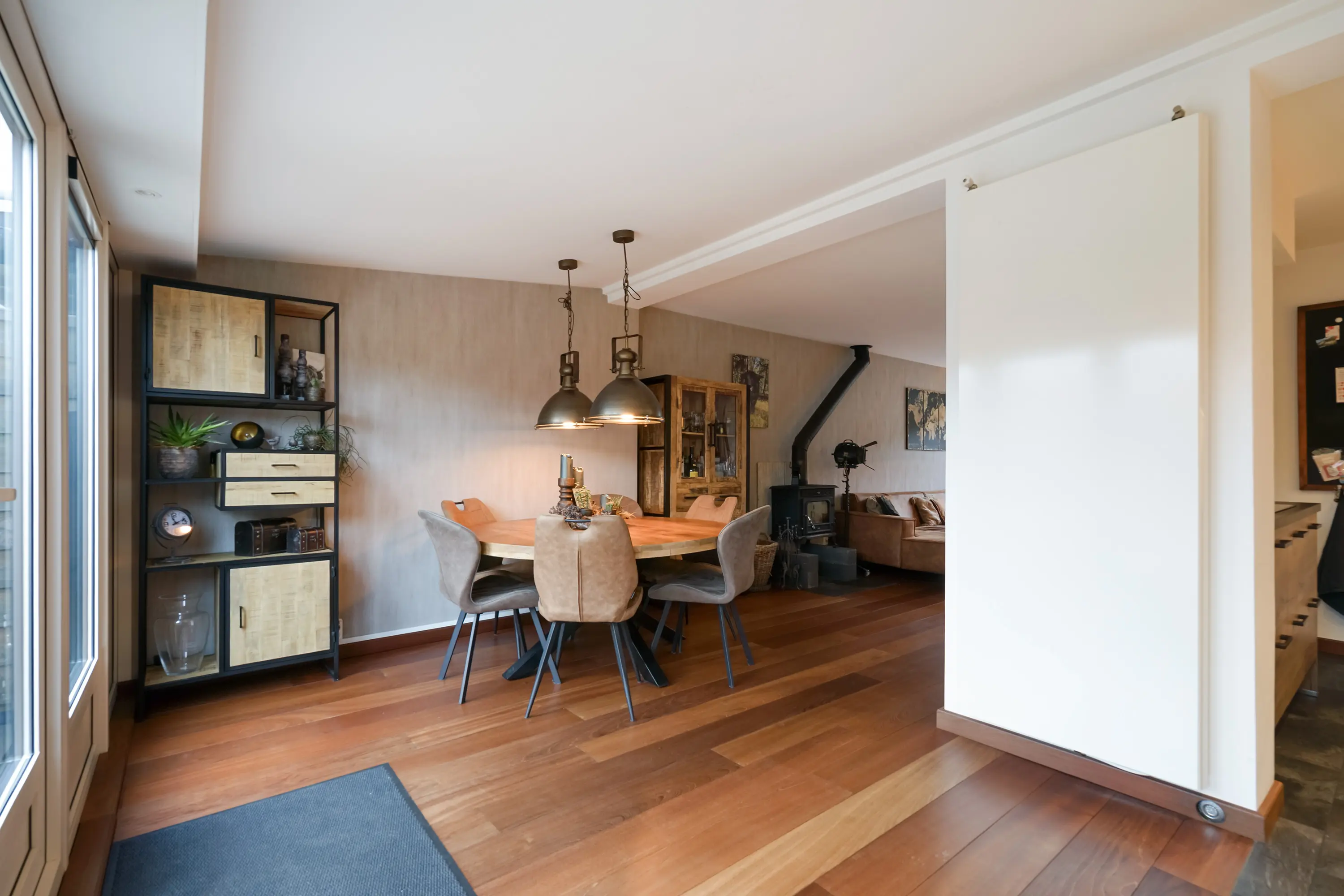 De woonkamer is voorzien van een houten vloer en beschikt aan de voorzijde over een grote raampartij die zorgt voor een prettige lichtinval. Daarnaast is de woonkamer uitgerust met een karakteristieke houtkachel, wat bijdraagt aan een warme en sfeervolle uitstraling.