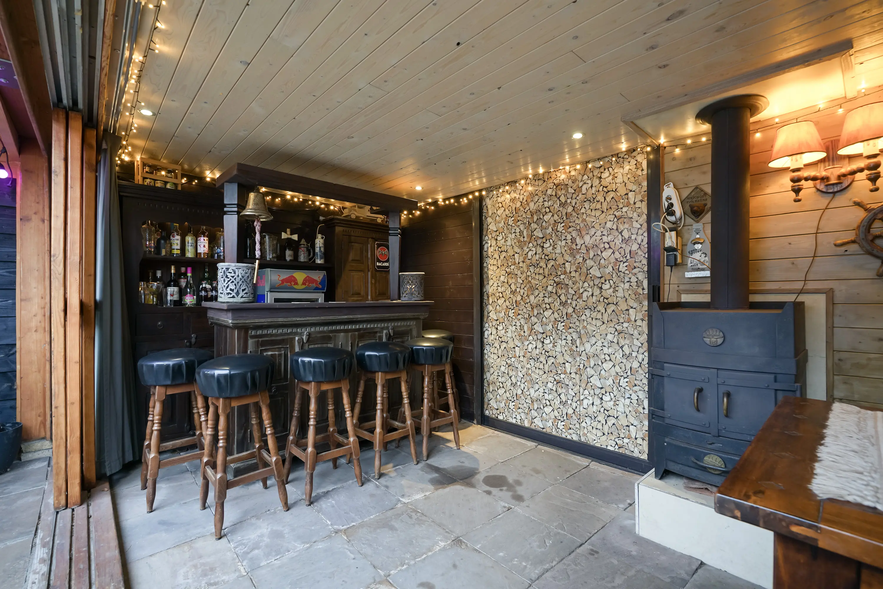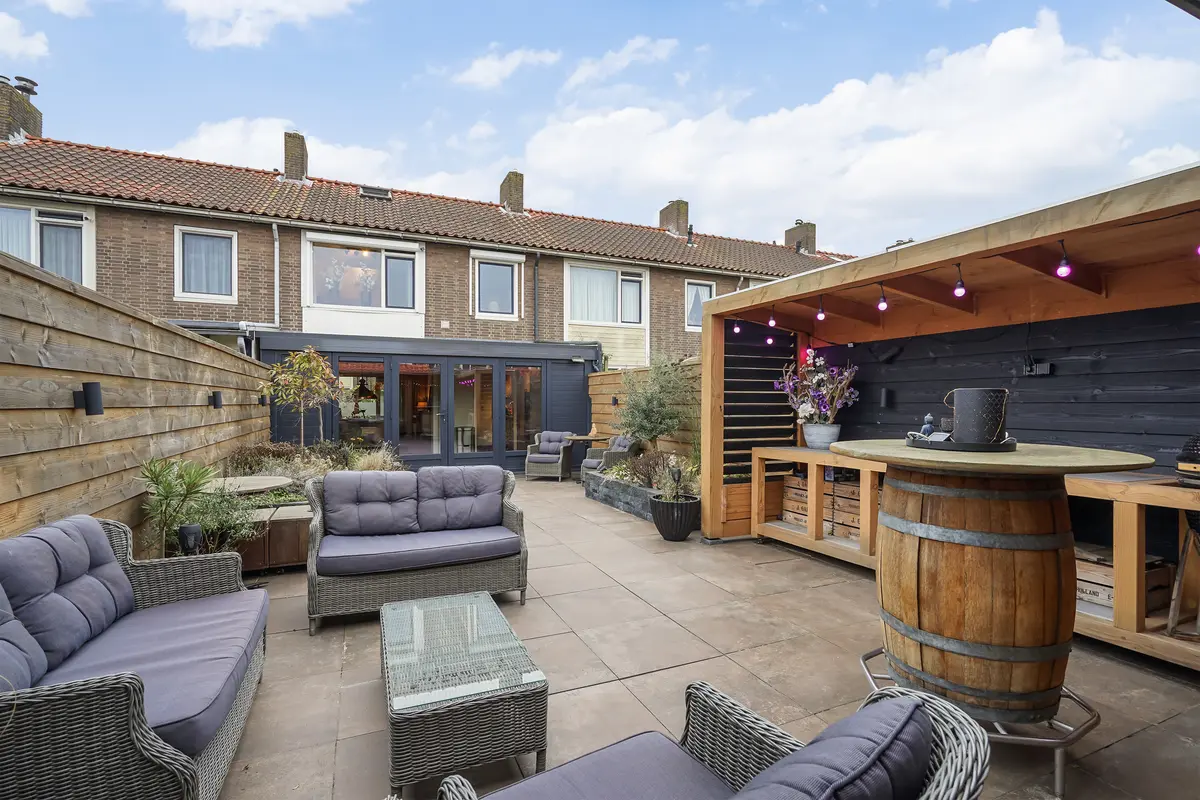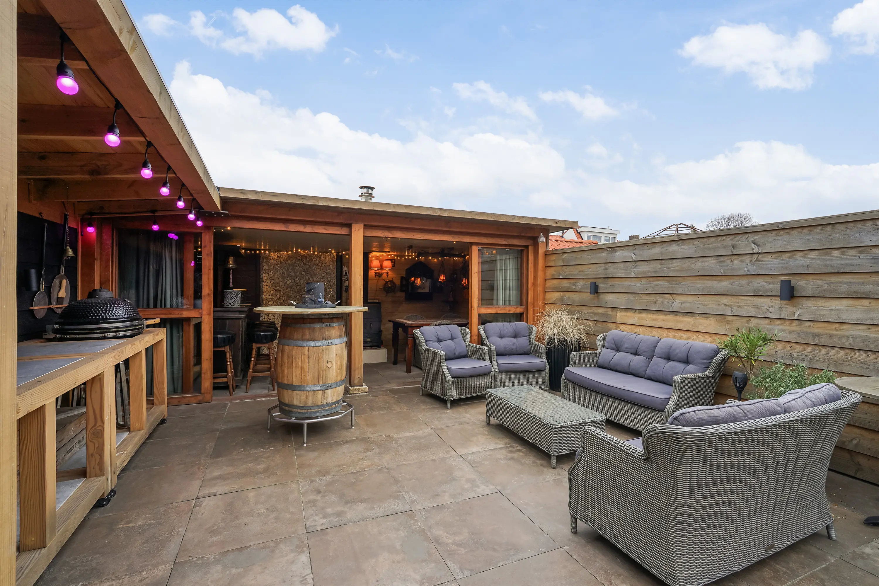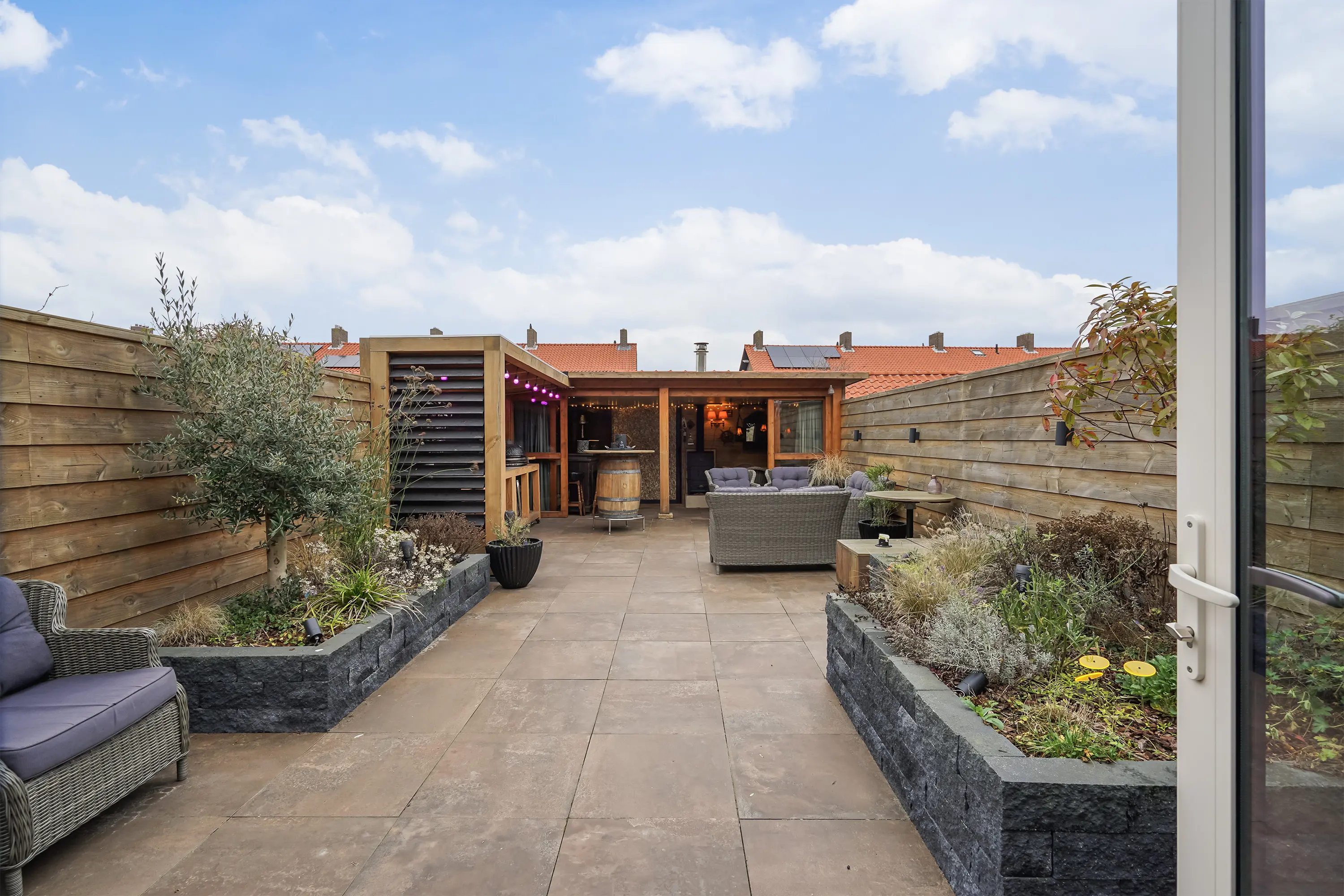 De royale achtertuin heeft een oppervlakte van circa 84 m² en biedt meerdere zitplekken, waardoor u op elk moment van de dag van de zon of schaduw kunt genieten. In de tuin bevindt zich een tuinhuis waar u het hele jaar door gebruik van kunt maken. Dit tuinhuis is ingericht met een bar en zitgelegenheid, ideaal voor gezellige avonden. Achter het tuinhuis bevinden zich nog drie bergingen, perfect voor extra opslag. Daarnaast is er een overkapping aanwezig die momenteel wordt gebruikt als werkbank en barbecueplek.