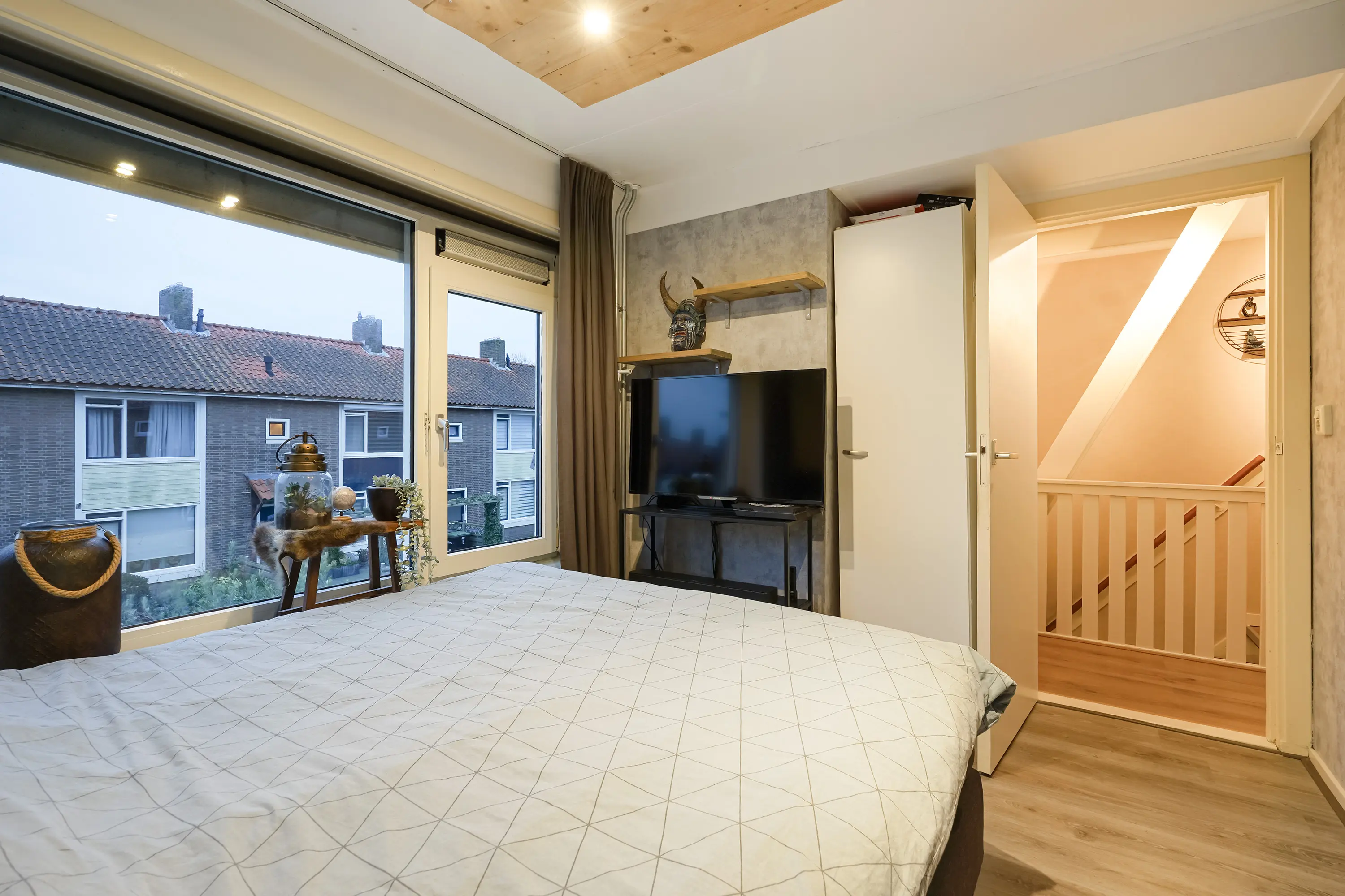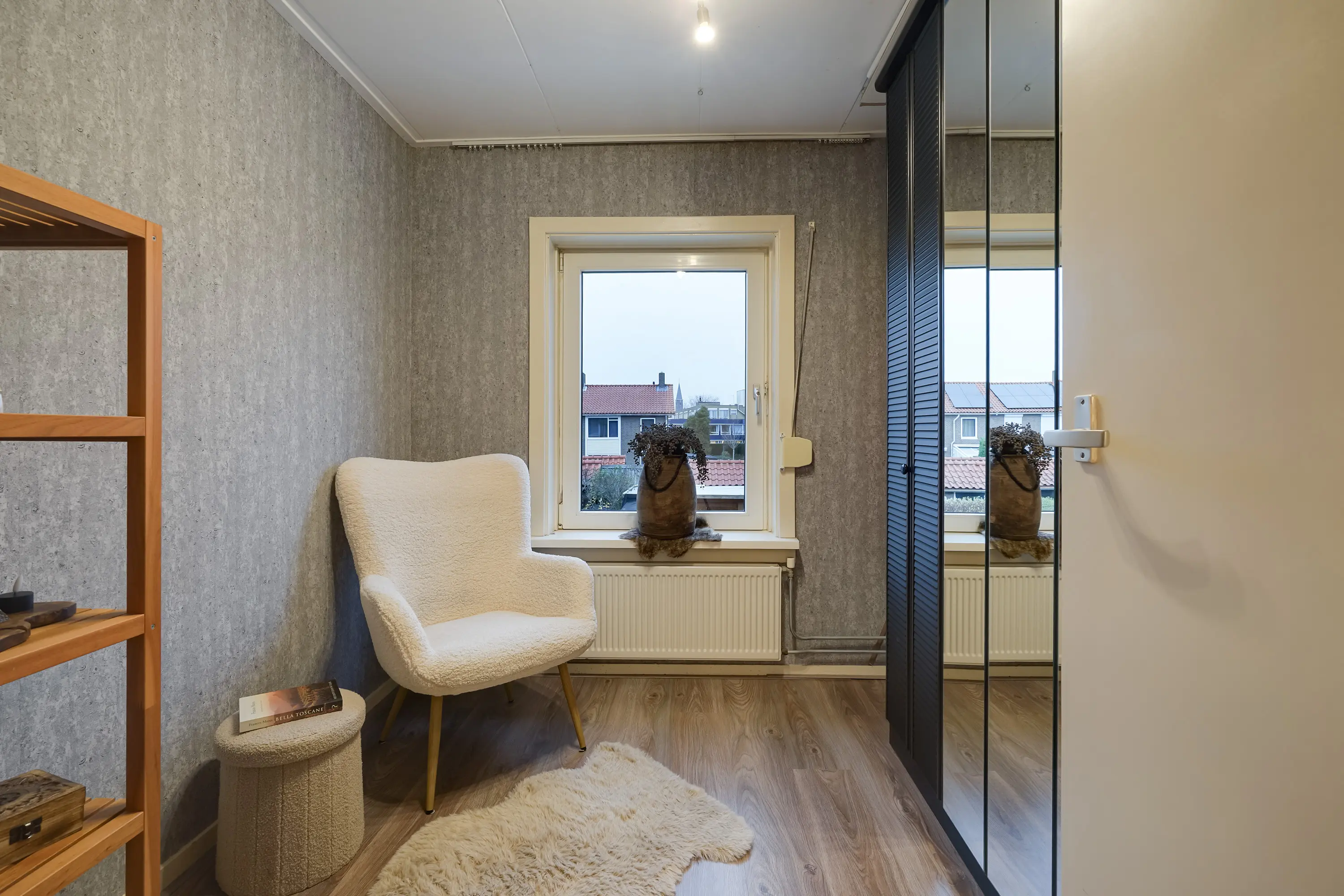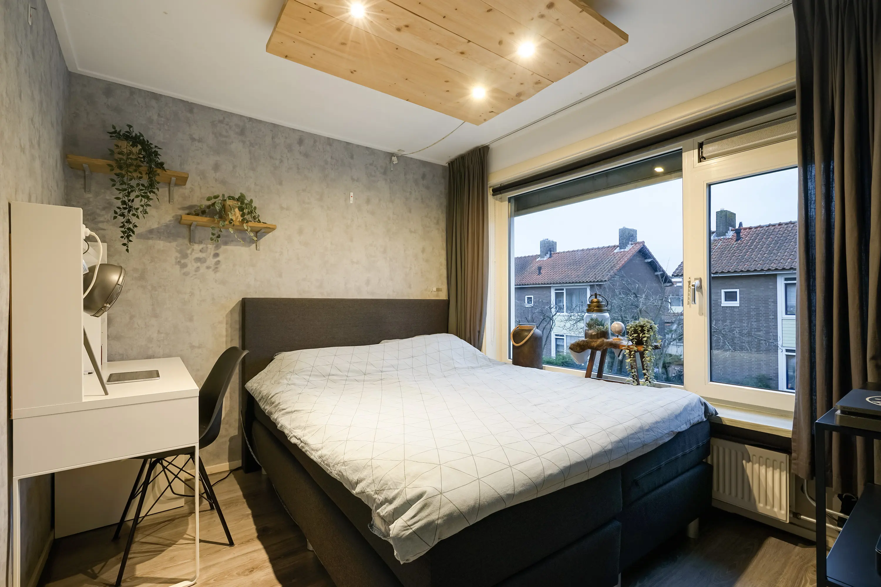 De eerste slaapkamer, gelegen aan de achterzijde van de woning, beschikt over een grote raampartij die zorgt voor veel natuurlijke lichtinval. De tweede slaapkamer bevindt zich aan de voorzijde van de woning en is eveneens voorzien van een royale raampartij.