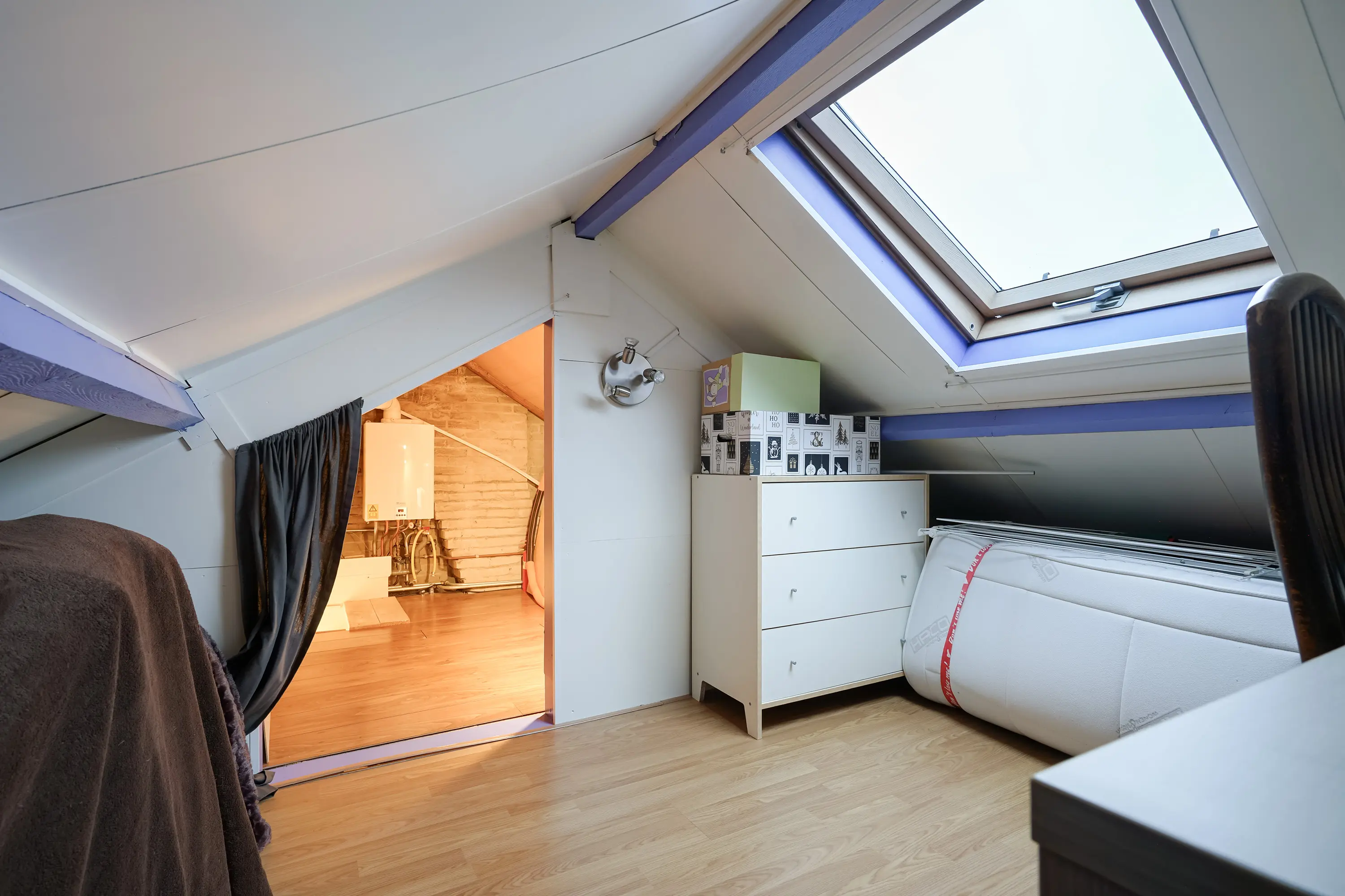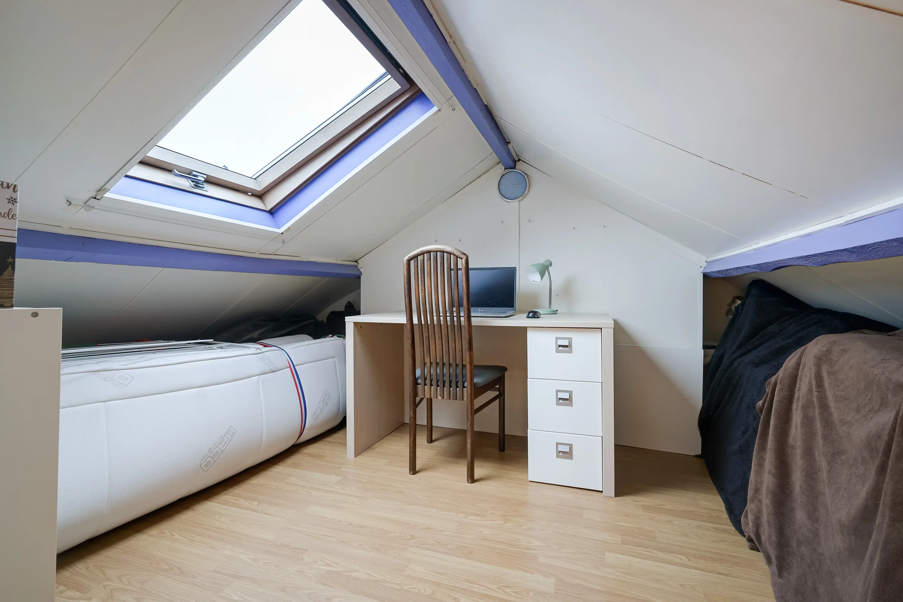Op de zolderverdieping bevindt zich de cv-installatie. Deze ruimte is multifunctioneel en kan uitstekend dienen als kinderkamer, werkplek of hobbyruimte. Dankzij het grote dakraam geniet deze etage van veel natuurlijke lichtinval, wat zorgt voor een prettige en lichte ruimte.