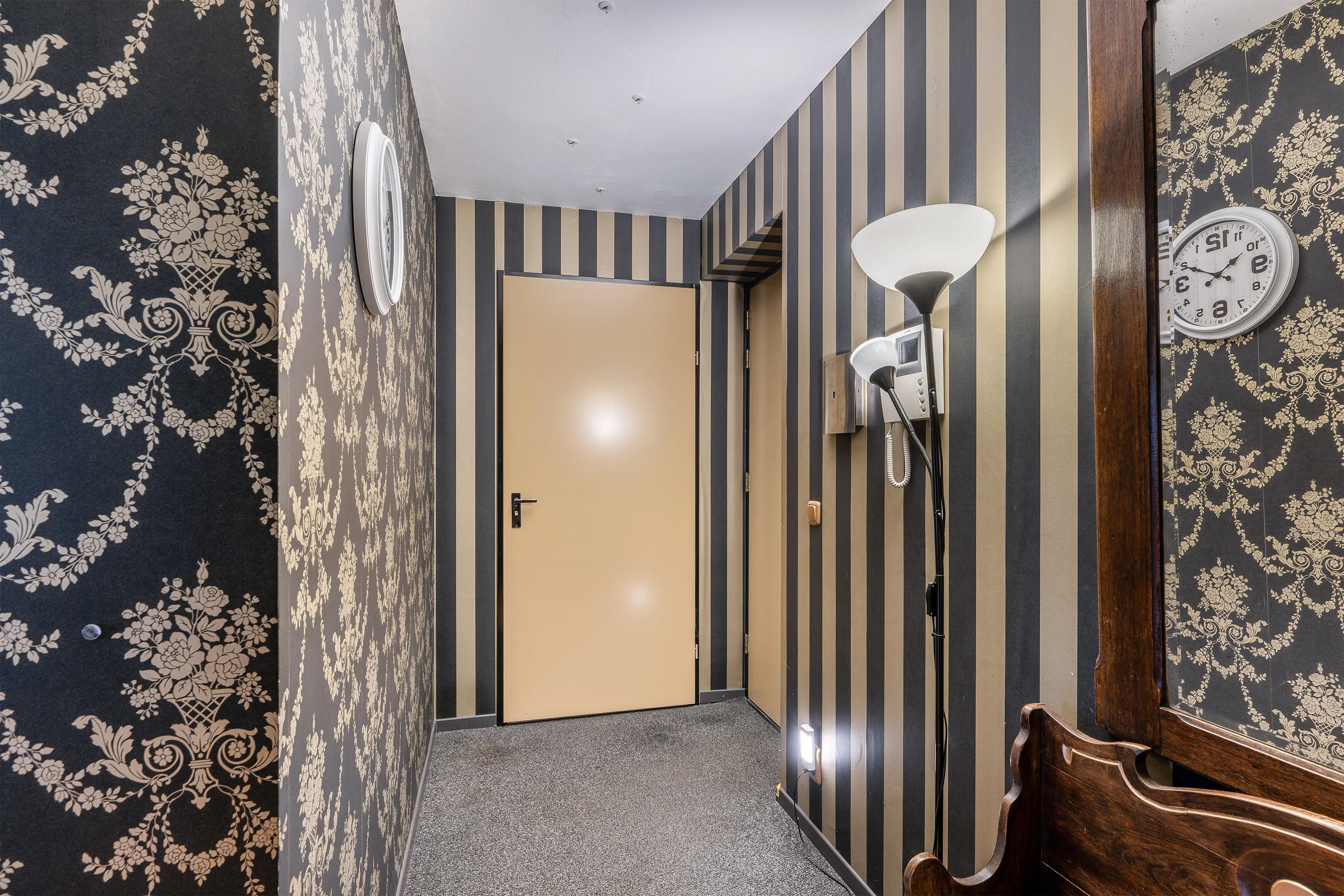 Wanneer u de woning binnenkomt, arriveert u in een L-vormige hal. Direct aan uw rechterzijde bevindt zich het toilet met fontein. Verder bereikt u op de hal de meterkast en aan het einde van de hal vind u de deur naar de woonkamer.