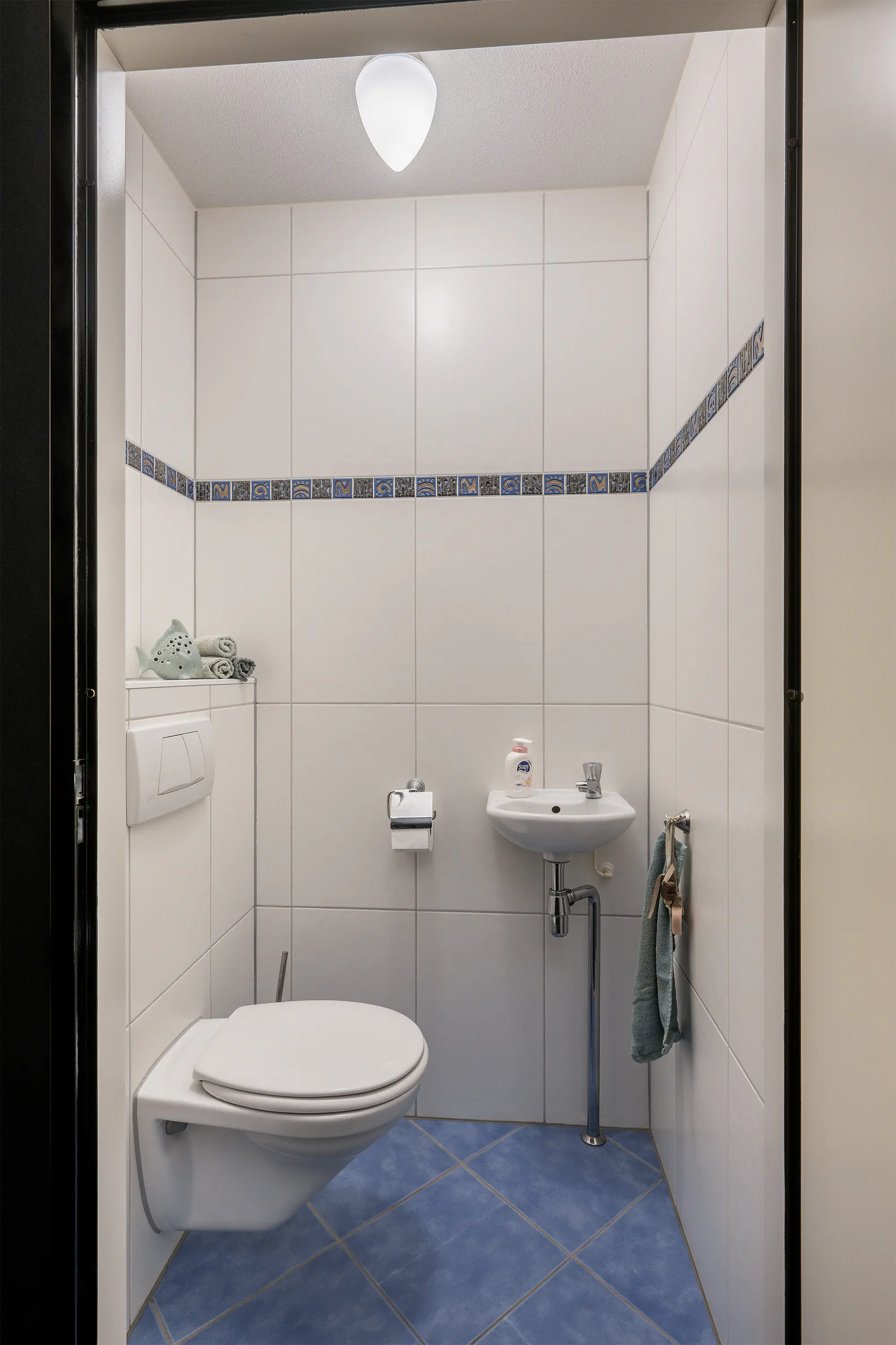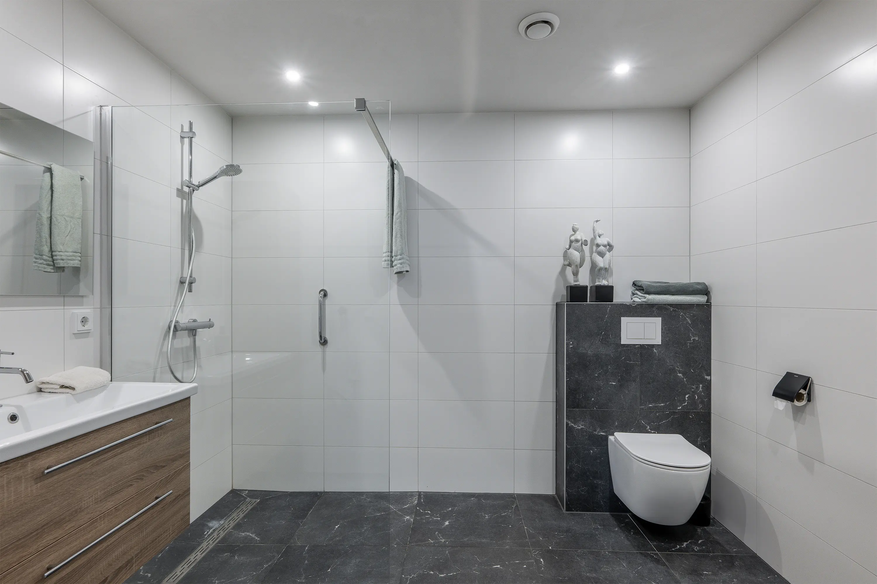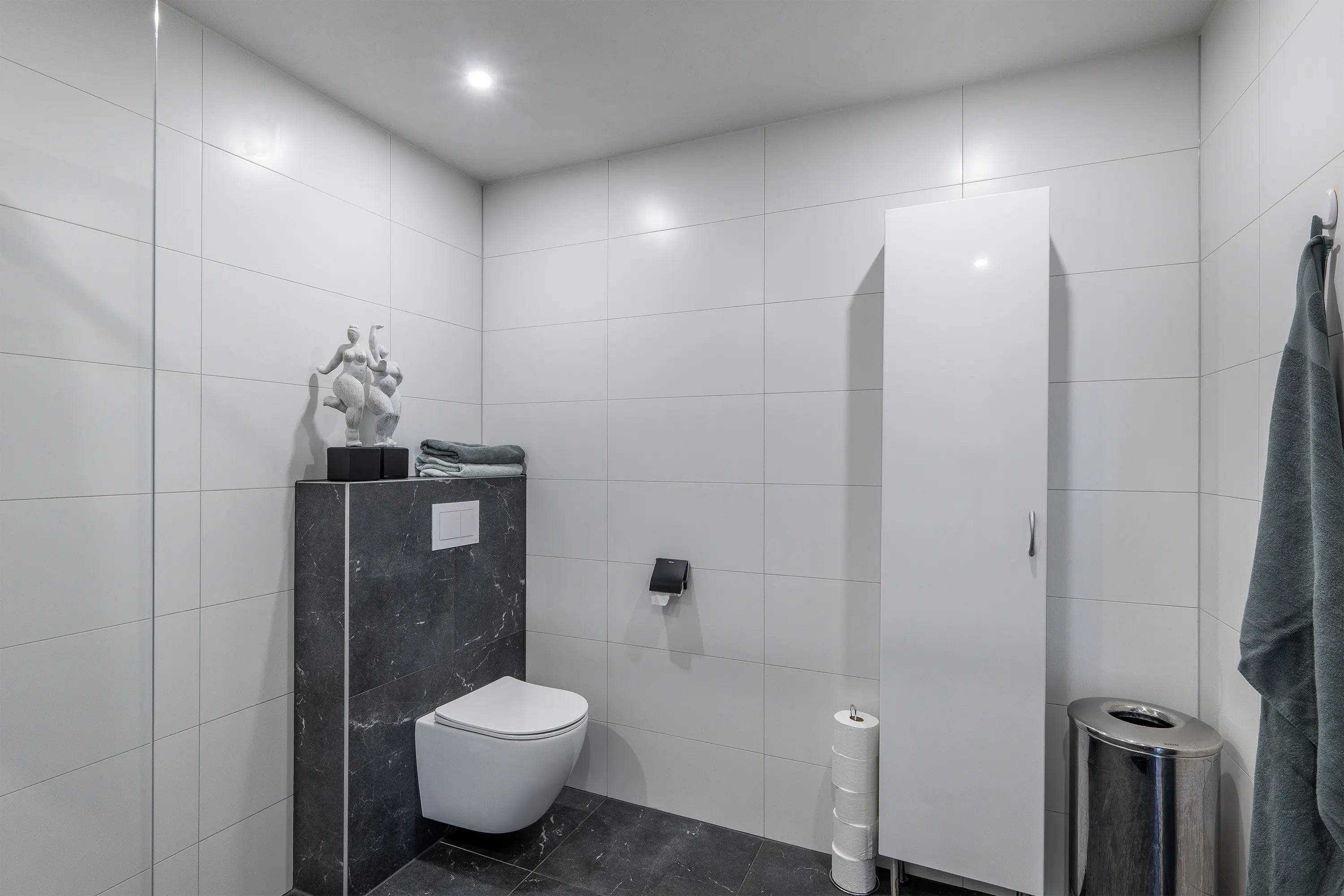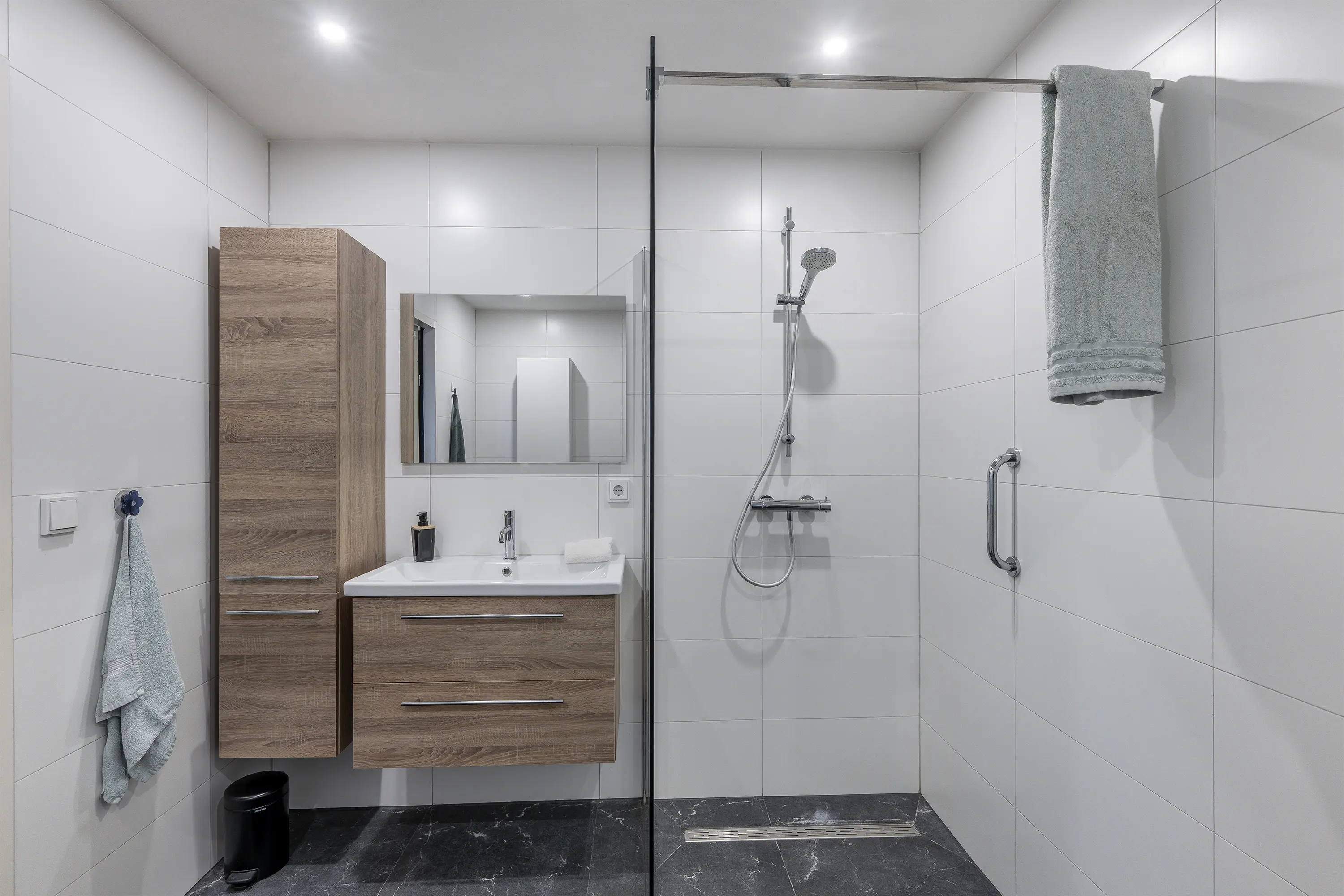 Tegenover de slaapkamers bevindt zich de badkamer. Deze is uitgerust met een inloopdouche, toilet en een wastafelmeubel in houtlook. De wanden zijn afgewerkt met strakke witte tegels en een plavuizen vloer, wat zorgt voor een moderne en luxe uitstraling.