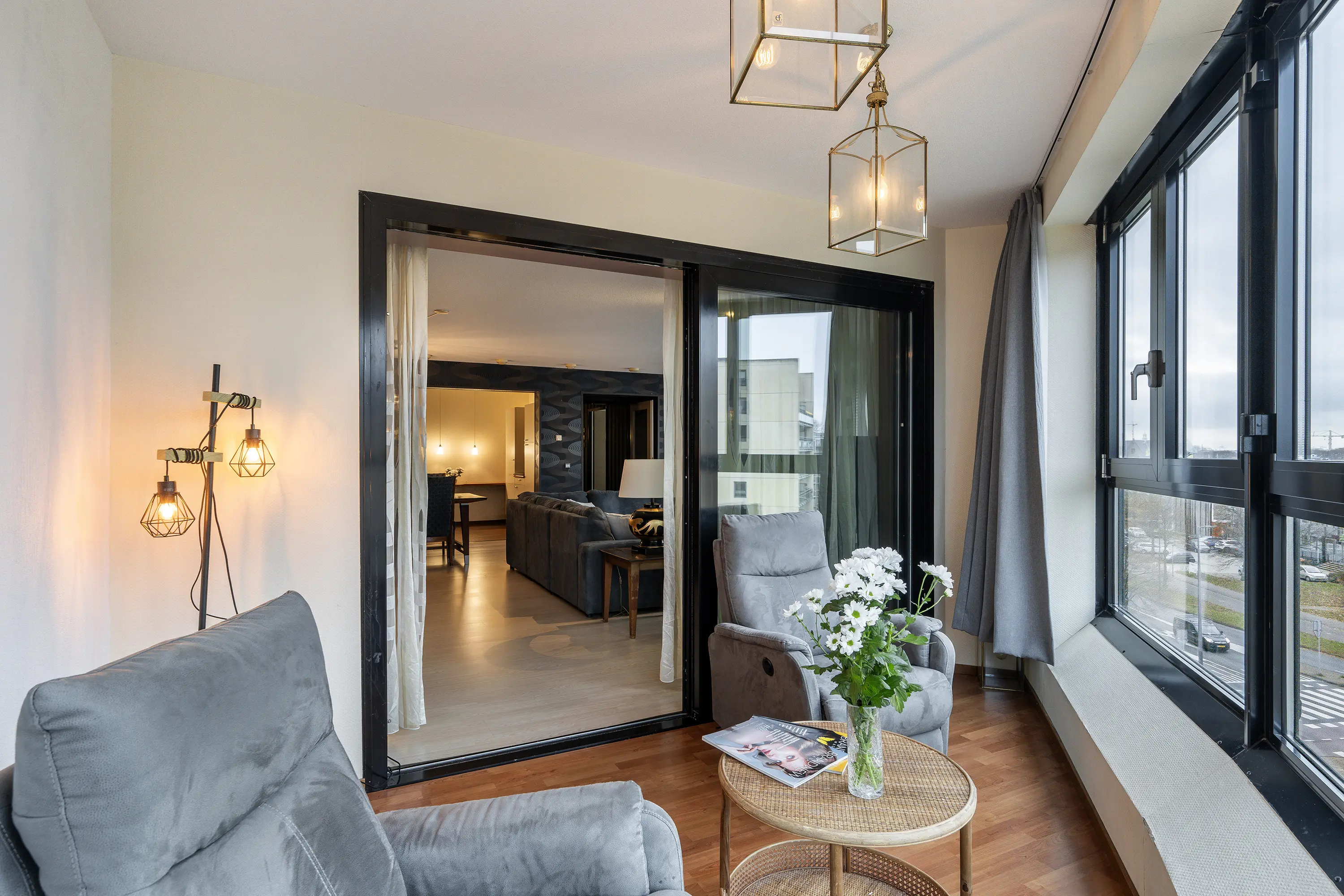 - Royale, lichte woonkamer met twee grote glazen puien en extra verlengd deel richting de loggia;