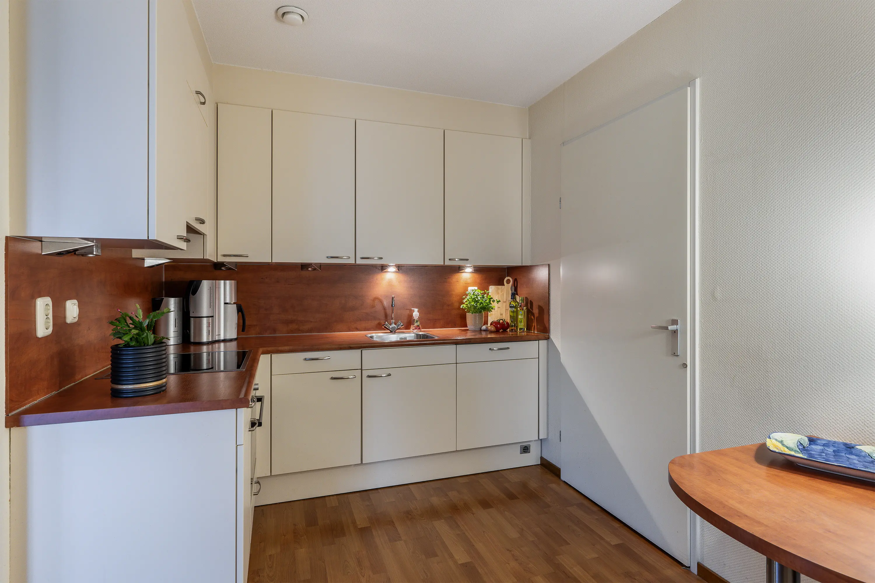 De keuken is voorzien van diverse inbouwapparatuur, waaronder een inductiekookplaat, vaatwasser, koelkast, vriezer en een afzuiginstallatie. Dankzij de ruime hoeveelheid kast- en opbergruimte kunt u al uw pannen en keukenspullen gemakkelijk kwijt. In de keuken is bovendien nog een extra deur die toegang geeft tot een bergkast, waar momenteel ook de wasmachine staat.