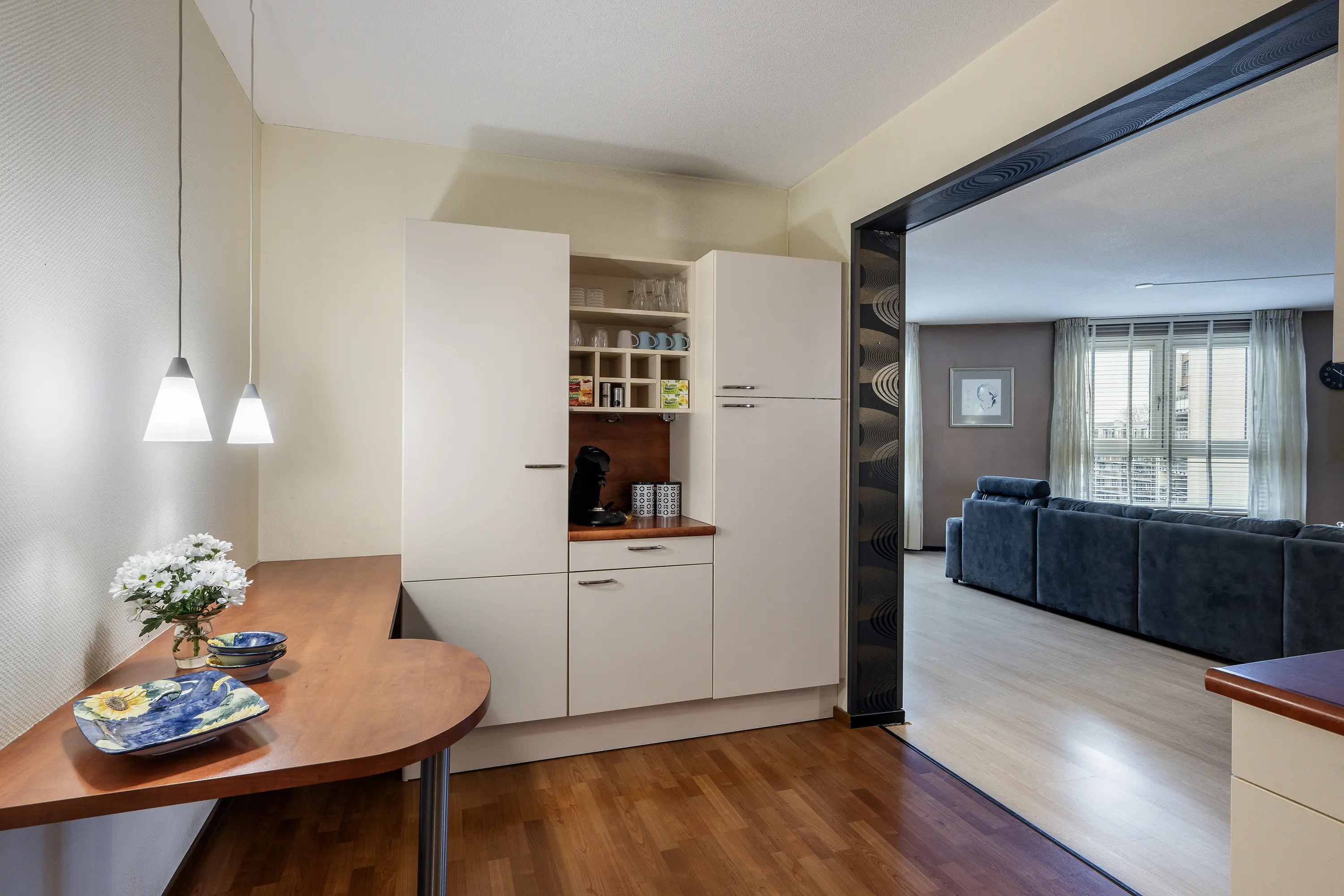 Grenzend aan de woonkamer bevindt zich een open doorgang naar de keuken.