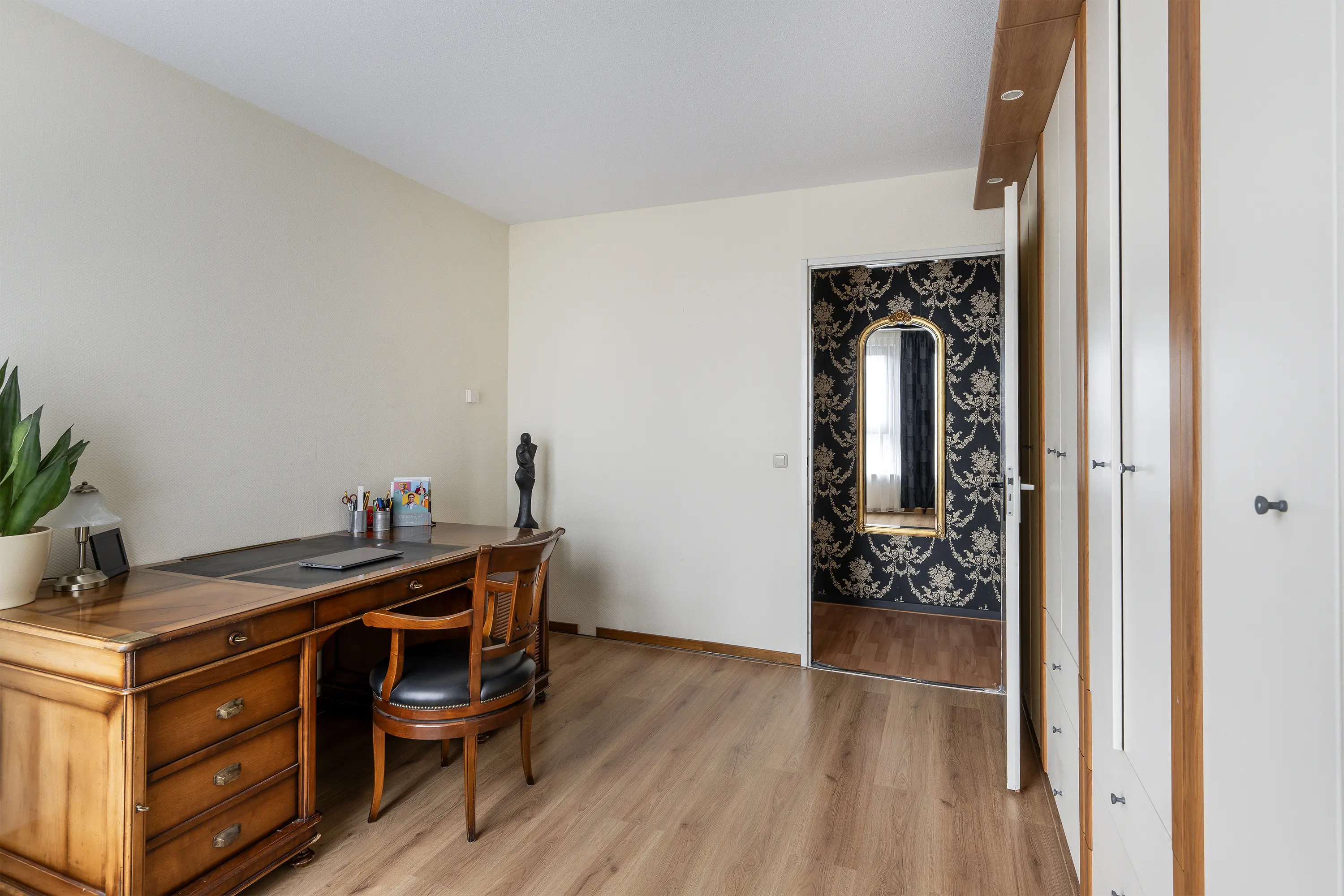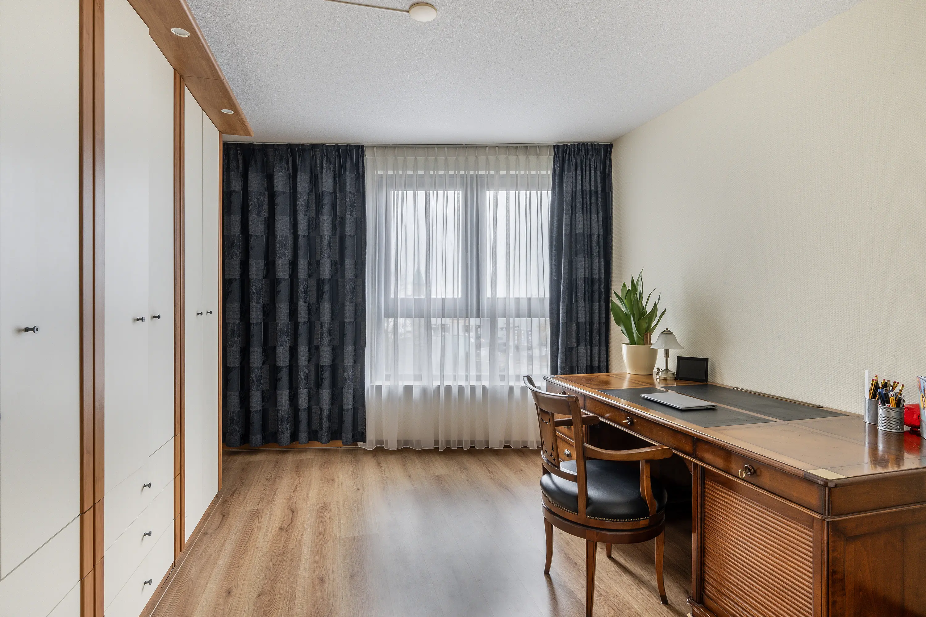 De tweede (slaap)kamer wordt momenteel gebruikt als kantoor/werkruimte. De kamer is ruim genoeg om als slaapkamer te dienen en heeft, net als de hoofdslaapkamer, een grote raampartij die zorgt voor veel licht en een fraai uitzicht.