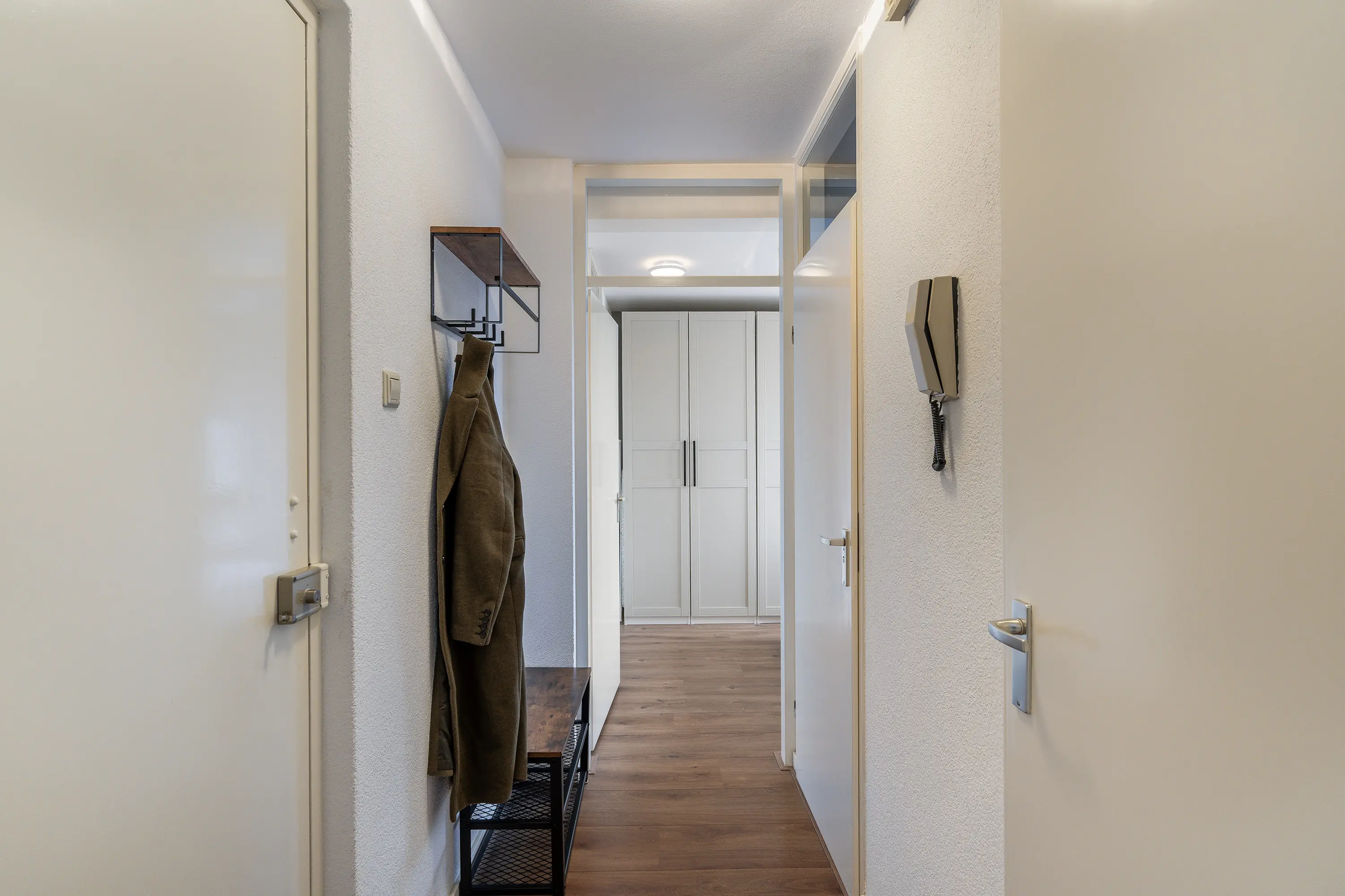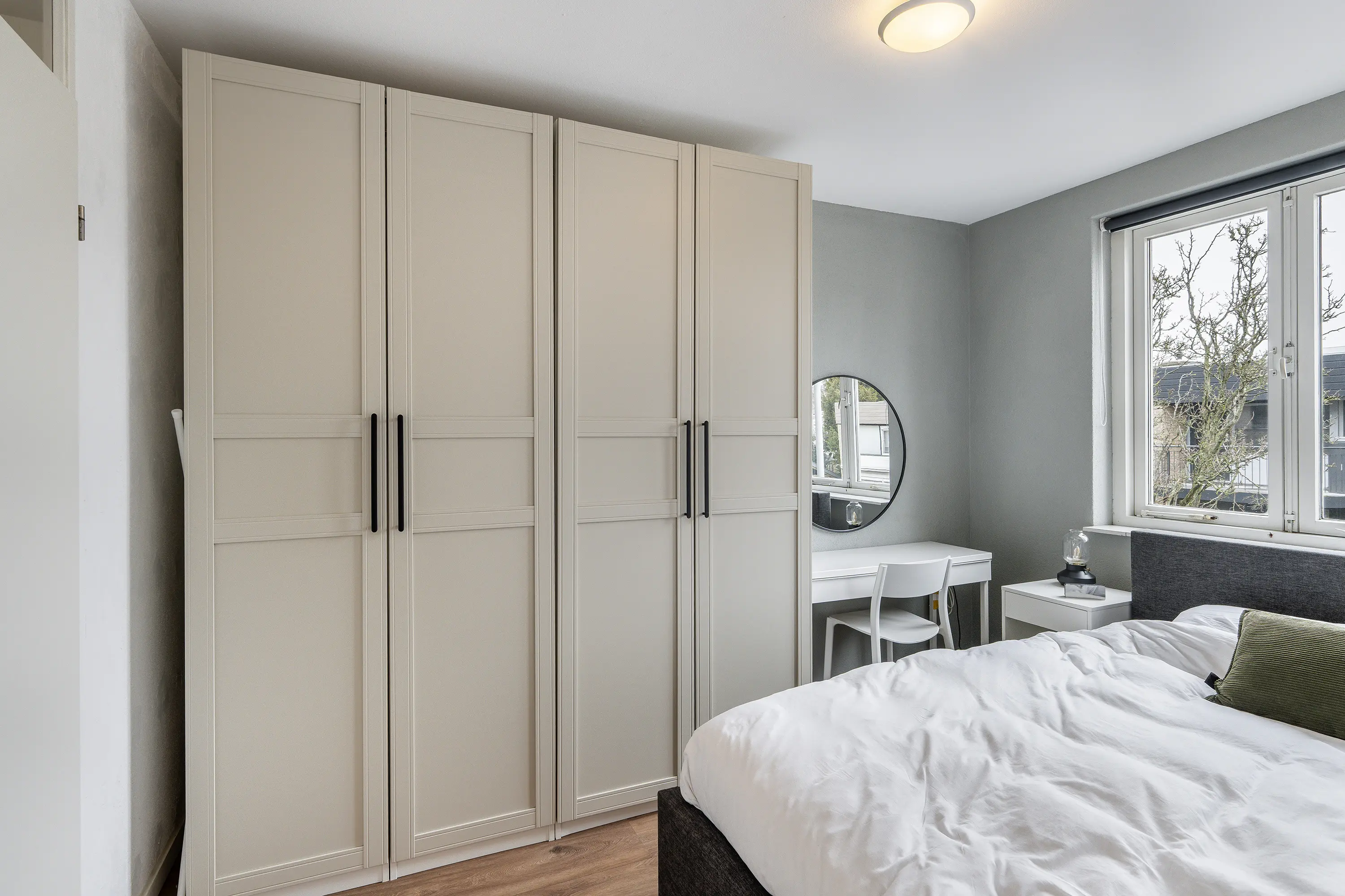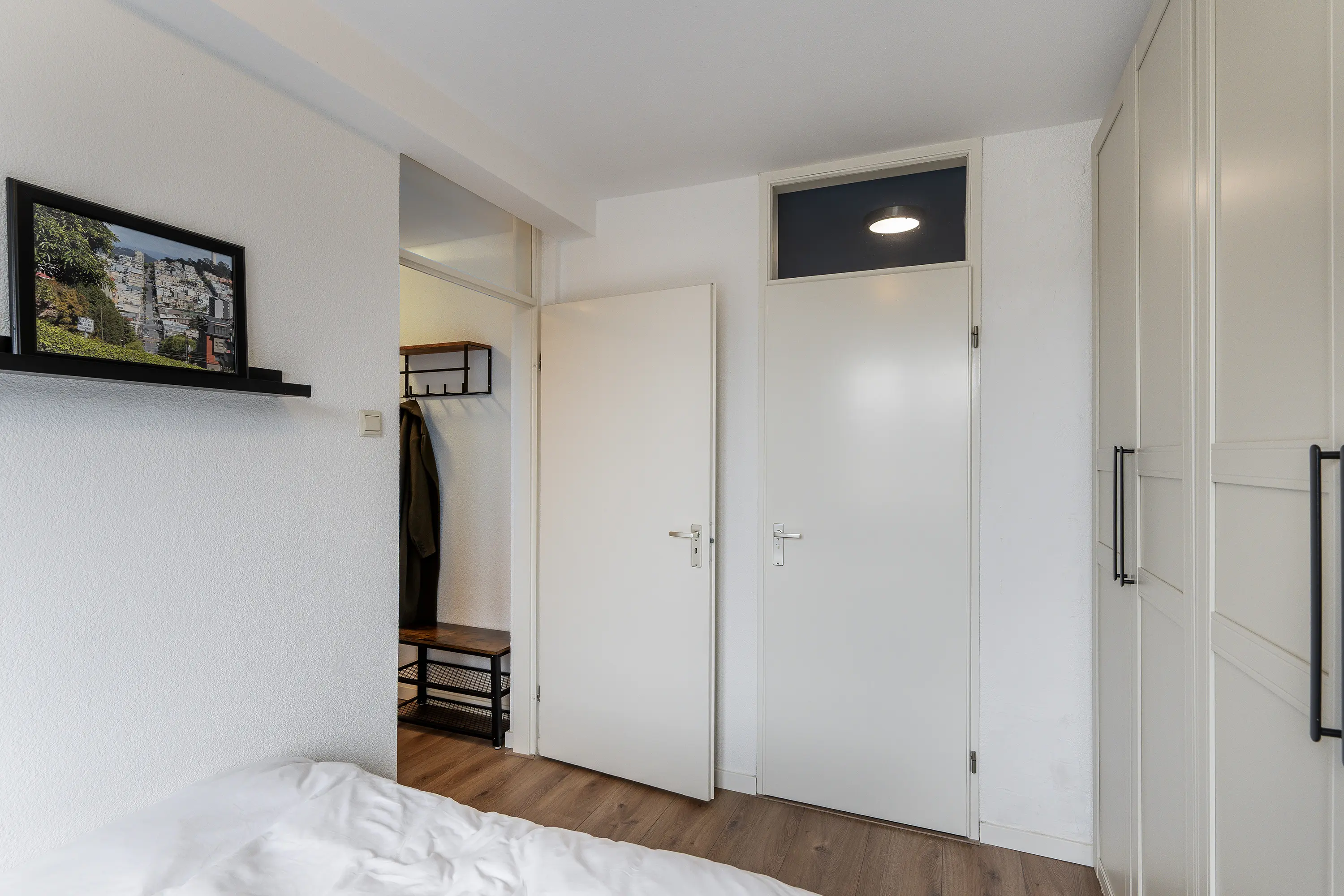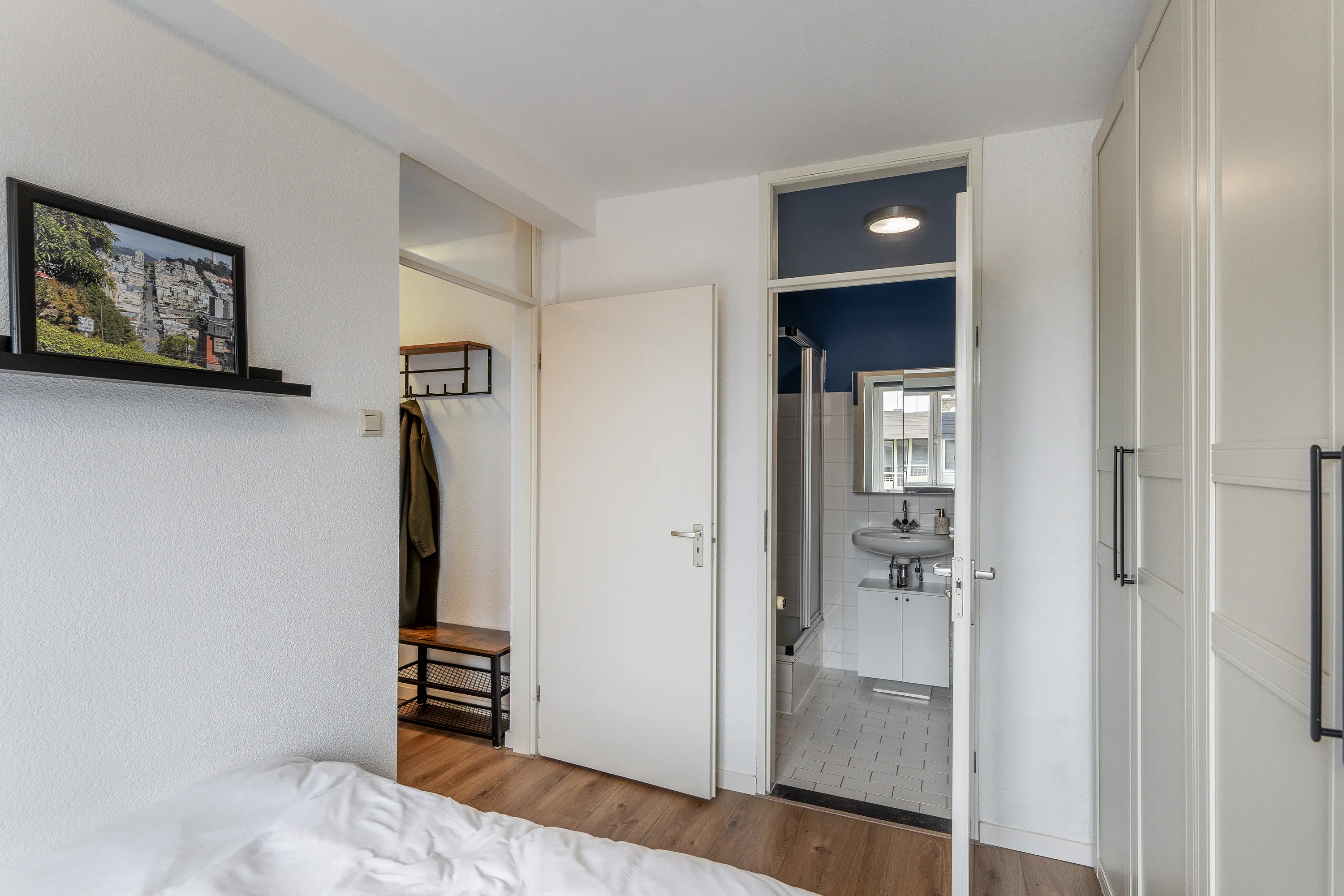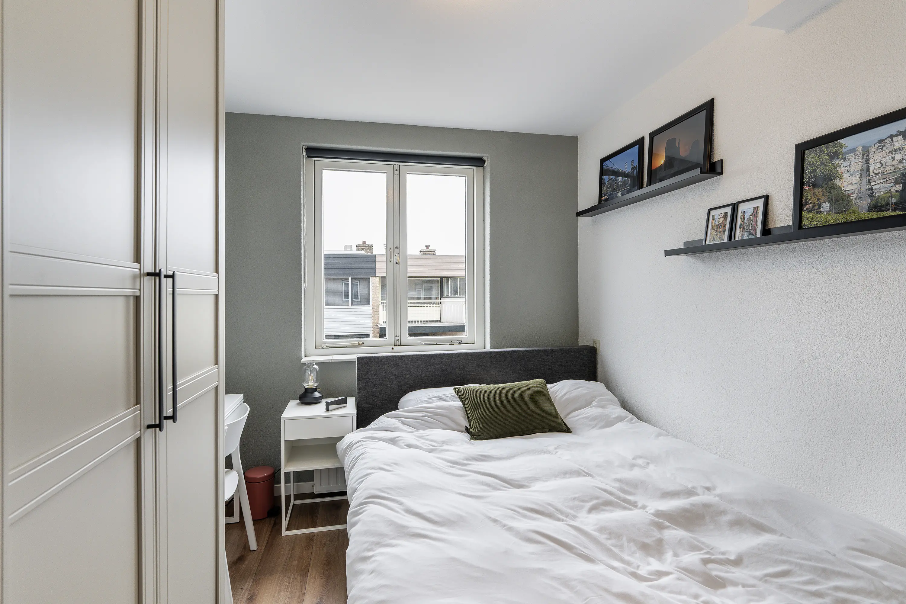 De slaapkamer ligt aan de andere zijde van de hal en heeft een fijne lichtinval. Net als de hal en woonkamer is ook hier de nette laminaatvloer doorgelegd, wat zorgt voor een samenhangende uitstraling.