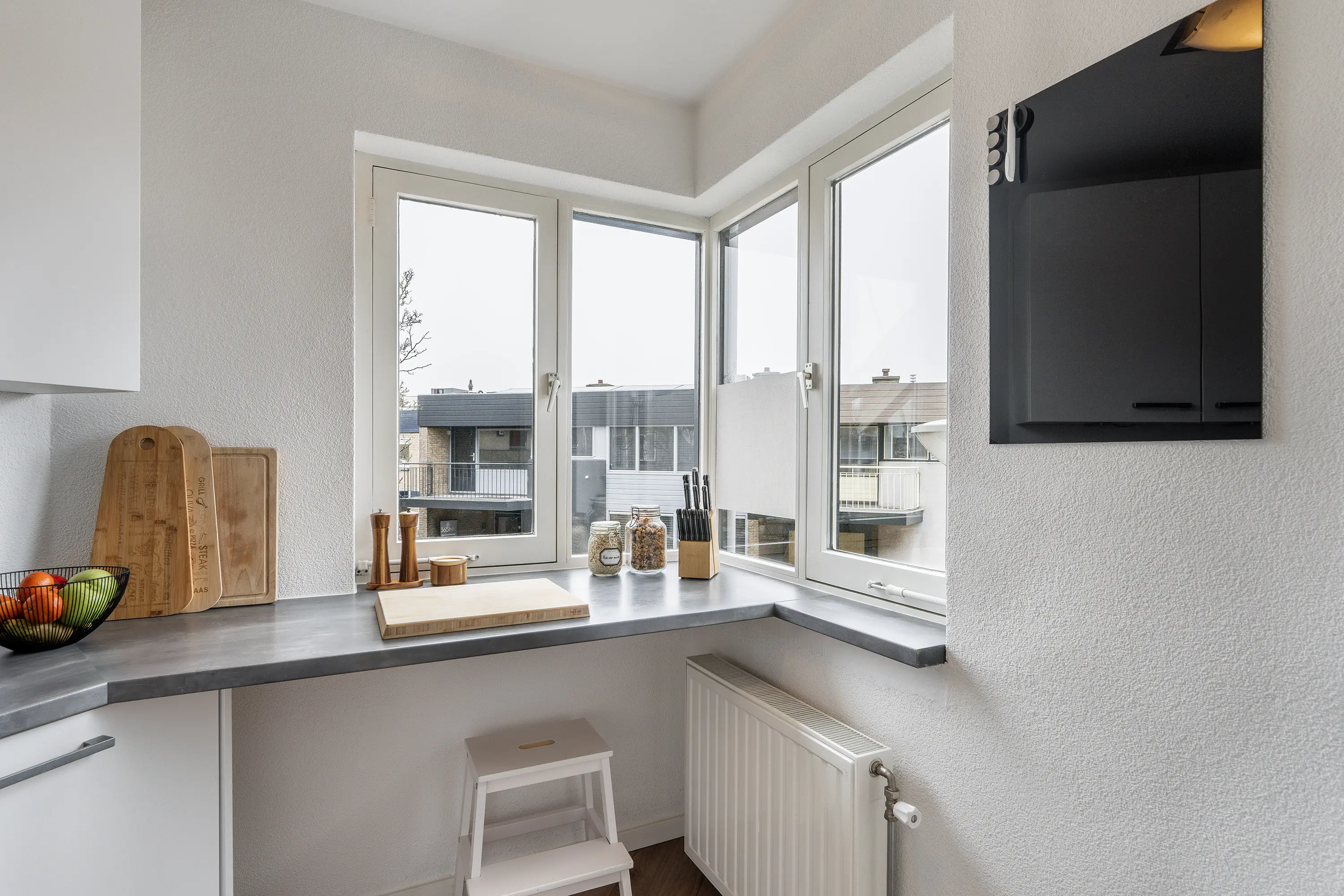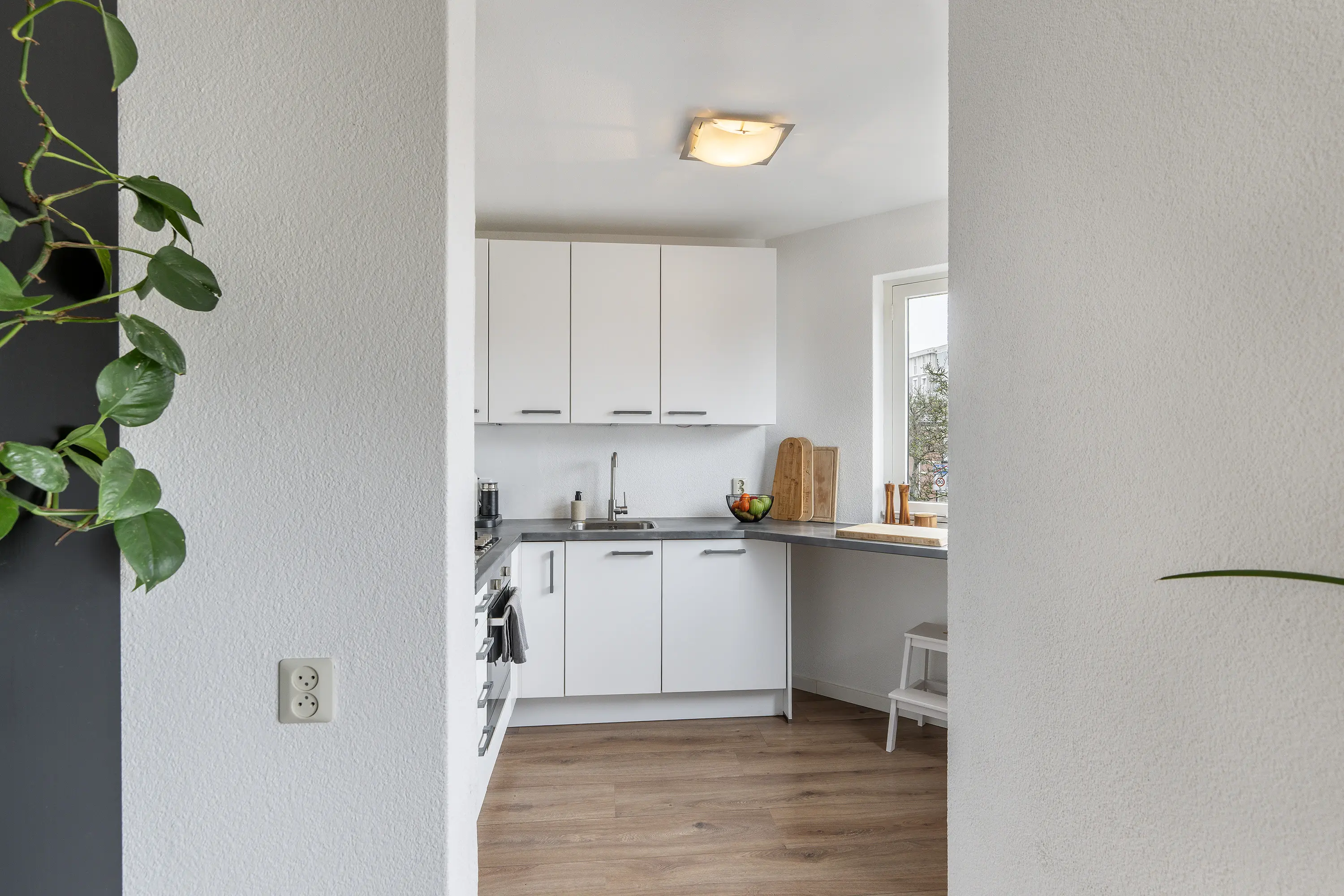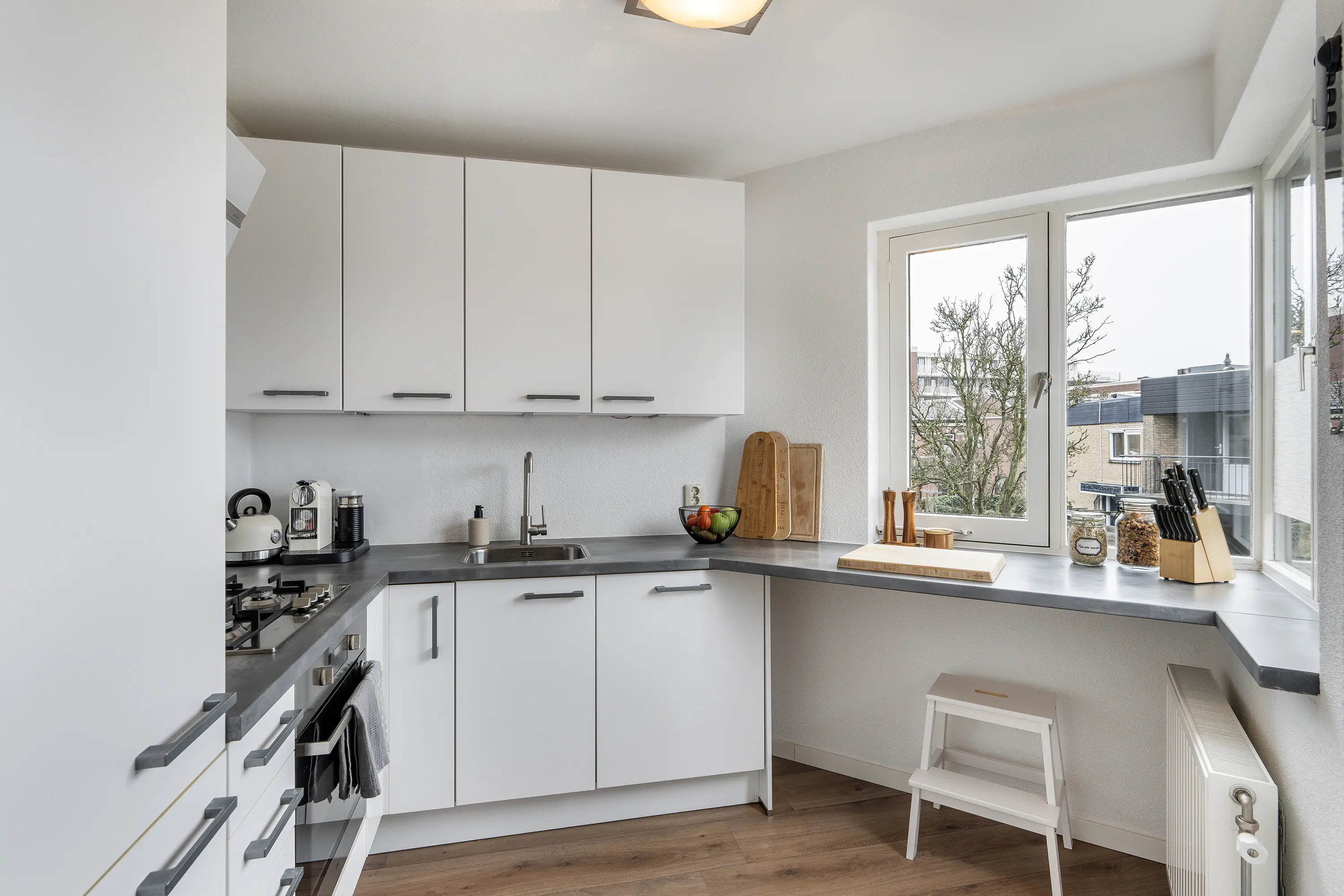 U komt binnen in de hal, die toegang geeft tot het toilet met fontein, een praktische bergkast, de slaapkamer en de woonkamer. De woonkamer is logisch ingedeeld met een gezellige zithoek en ruimte voor een eettafel. Dankzij de grote raampartij en het balkon aan de voorzijde is het hier heerlijk licht. Het balkon ligt op het noordwesten, waardoor u hier in de zomermaanden na een lange werkdag nog eventjes van de zon kunt genieten.