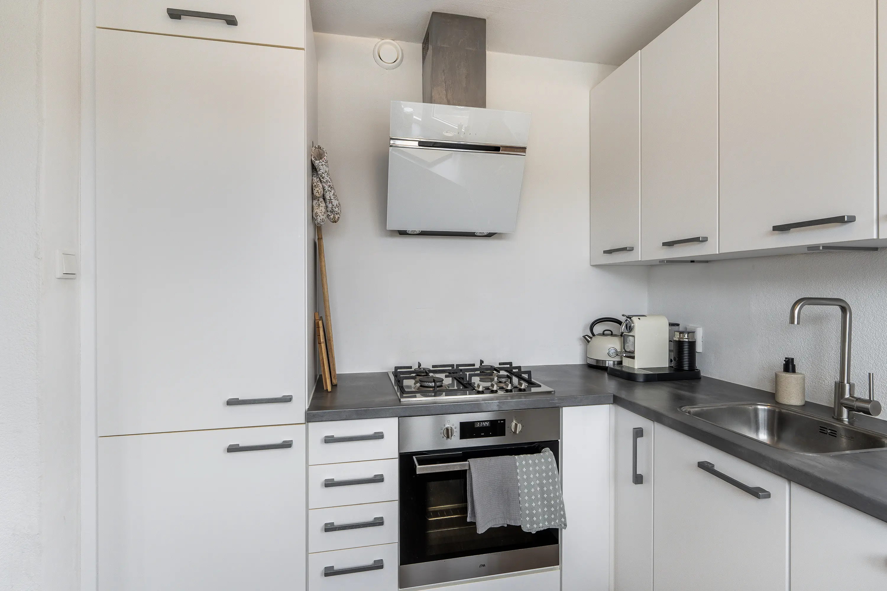 De halfopen keuken sluit mooi aan op de eethoek en is voorzien van diverse inbouwapparatuur, waaronder een oven, gasfornuis, afzuigkap, koelkast, vriezer en vaatwasser.