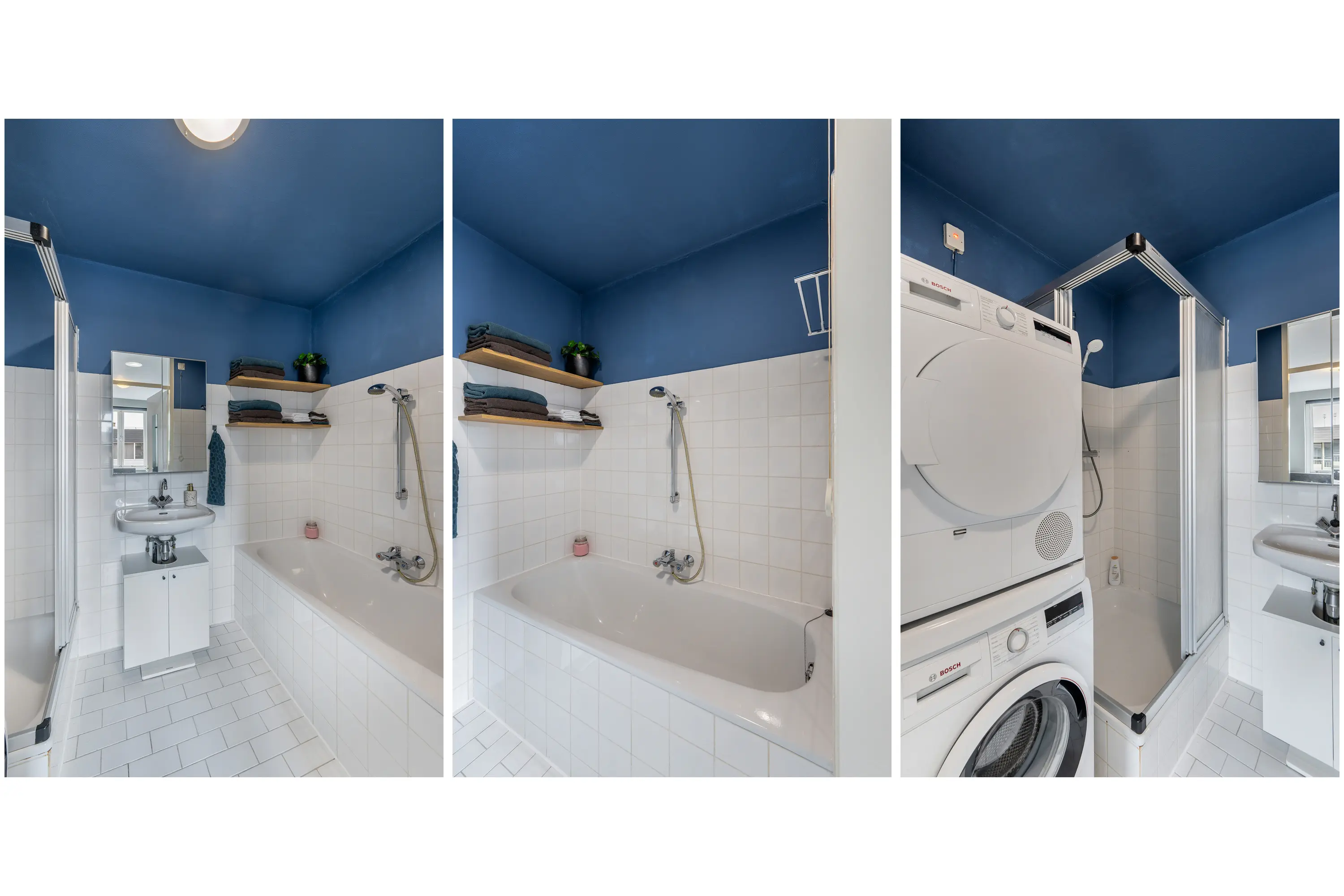 Vanuit de slaapkamer is de badkamer direct bereikbaar. Deze is ingericht met een ligbad, aparte douche, wastafel en de opstelplaats voor de wasmachine en droger. Dankzij de mechanische ventilatie is het hier altijd goed te ventileren.