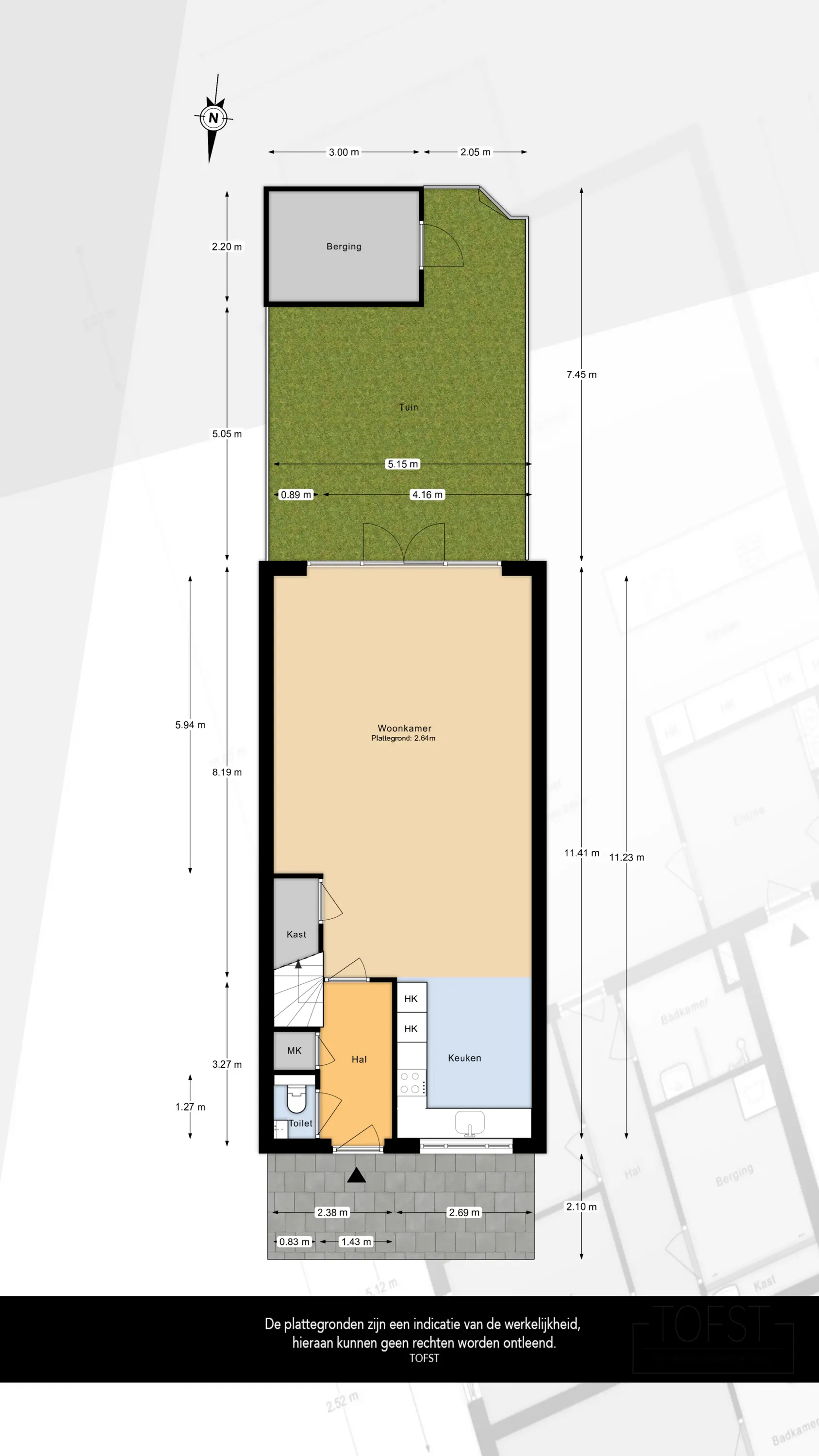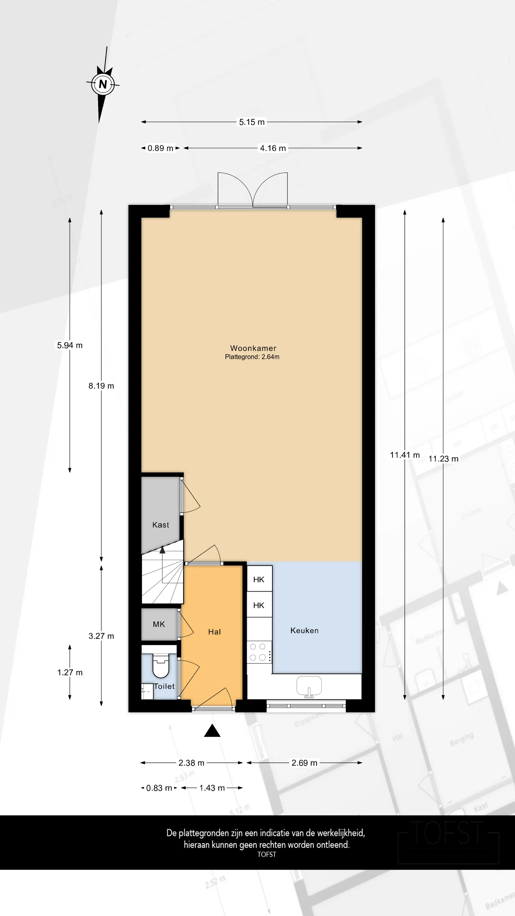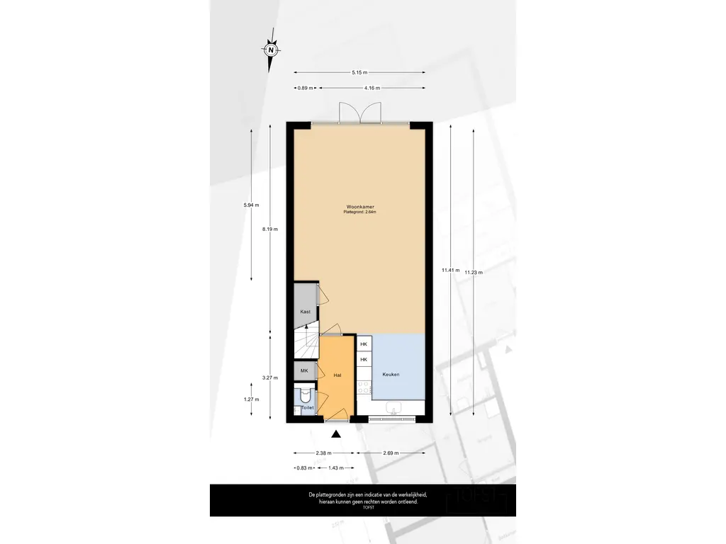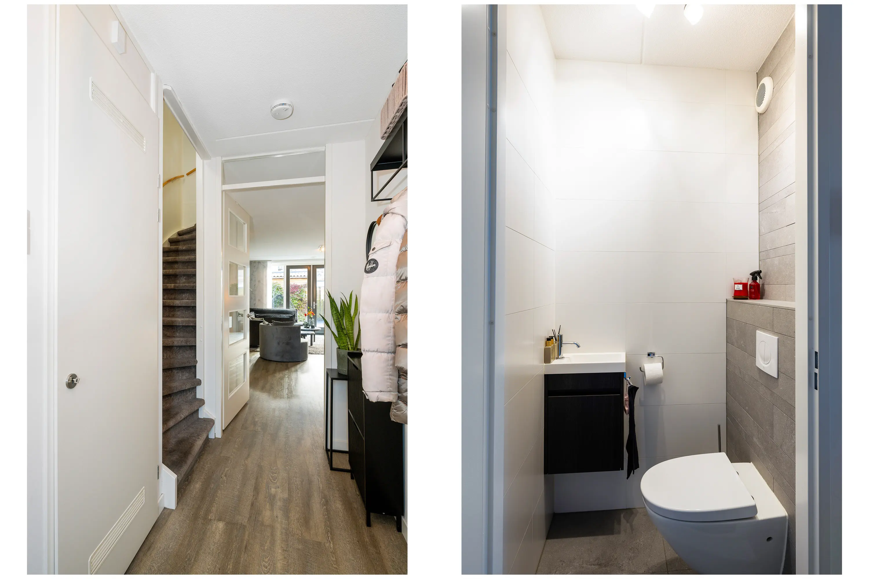 Aan de Portalaan betreedt u de entree van de woning, die toegang biedt tot het toilet, de meterkast, de trap naar de eerste verdieping en de woonkamer.