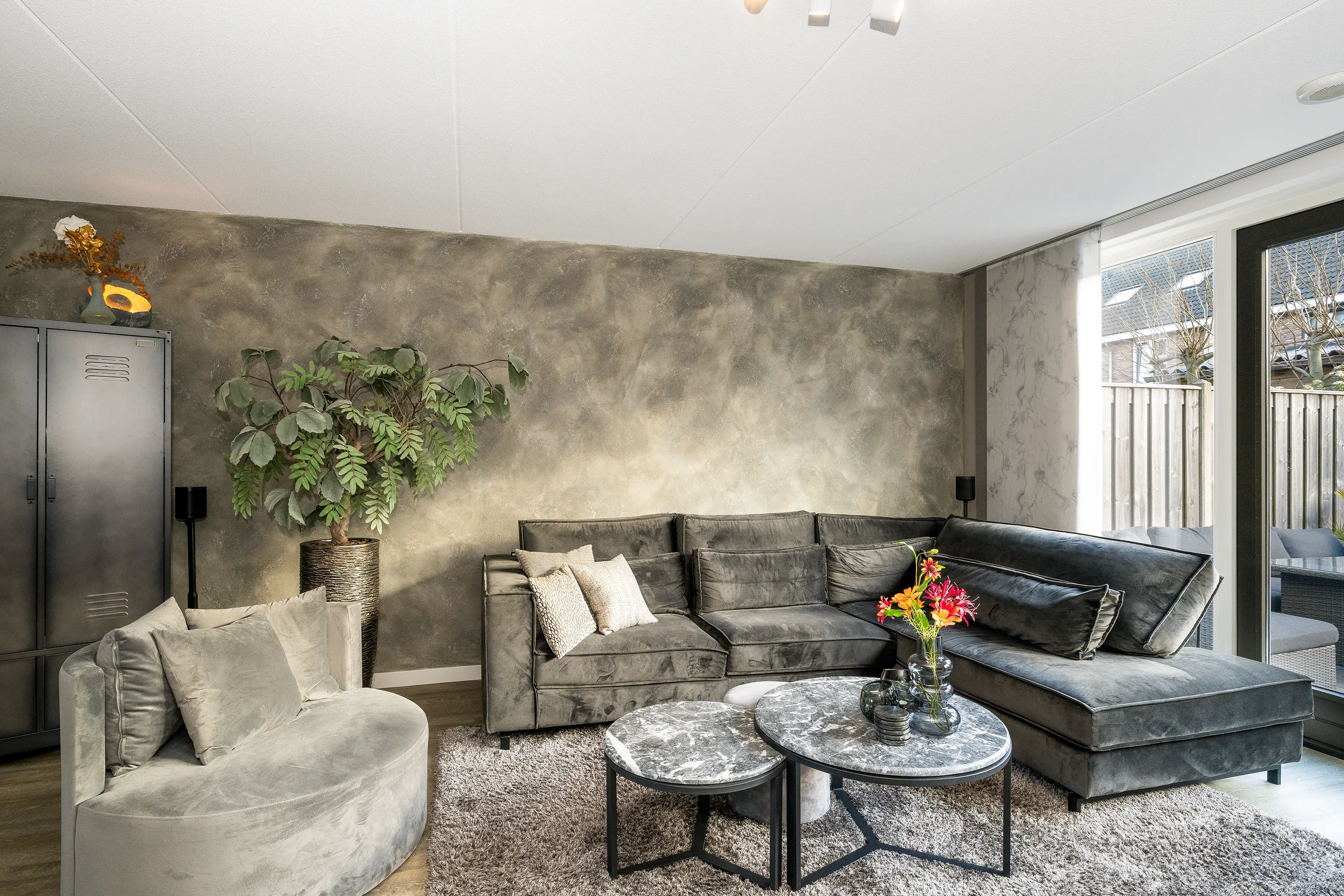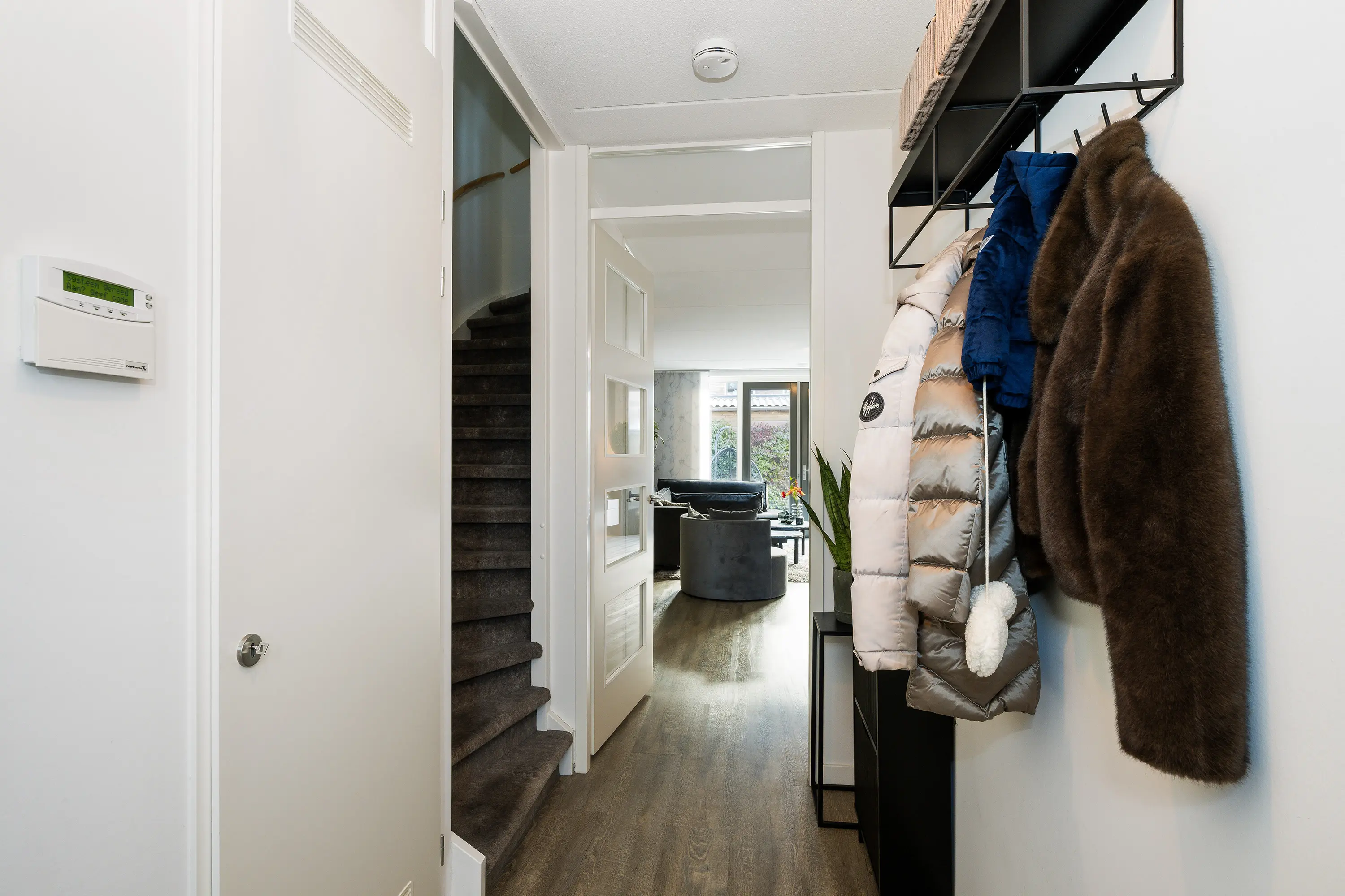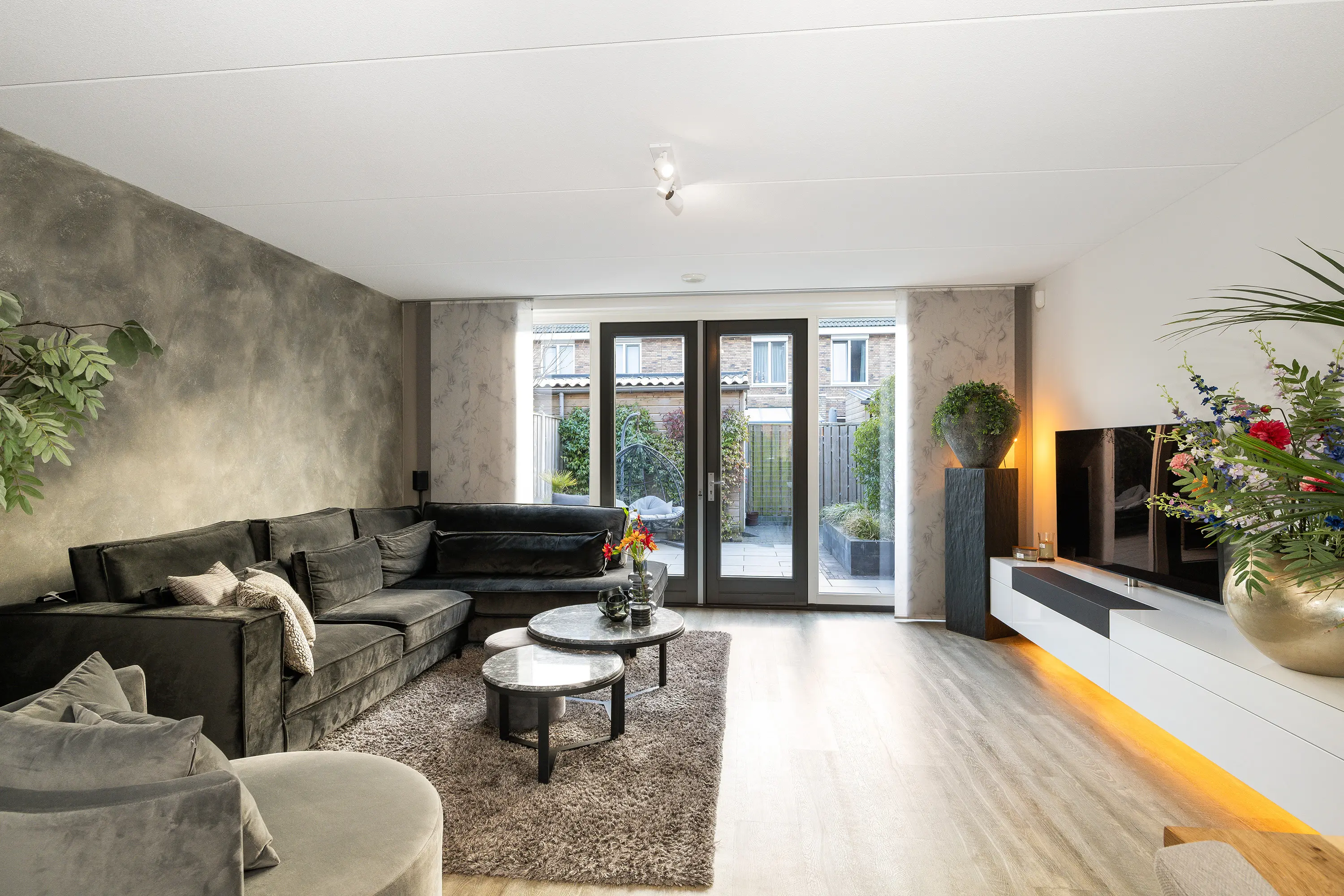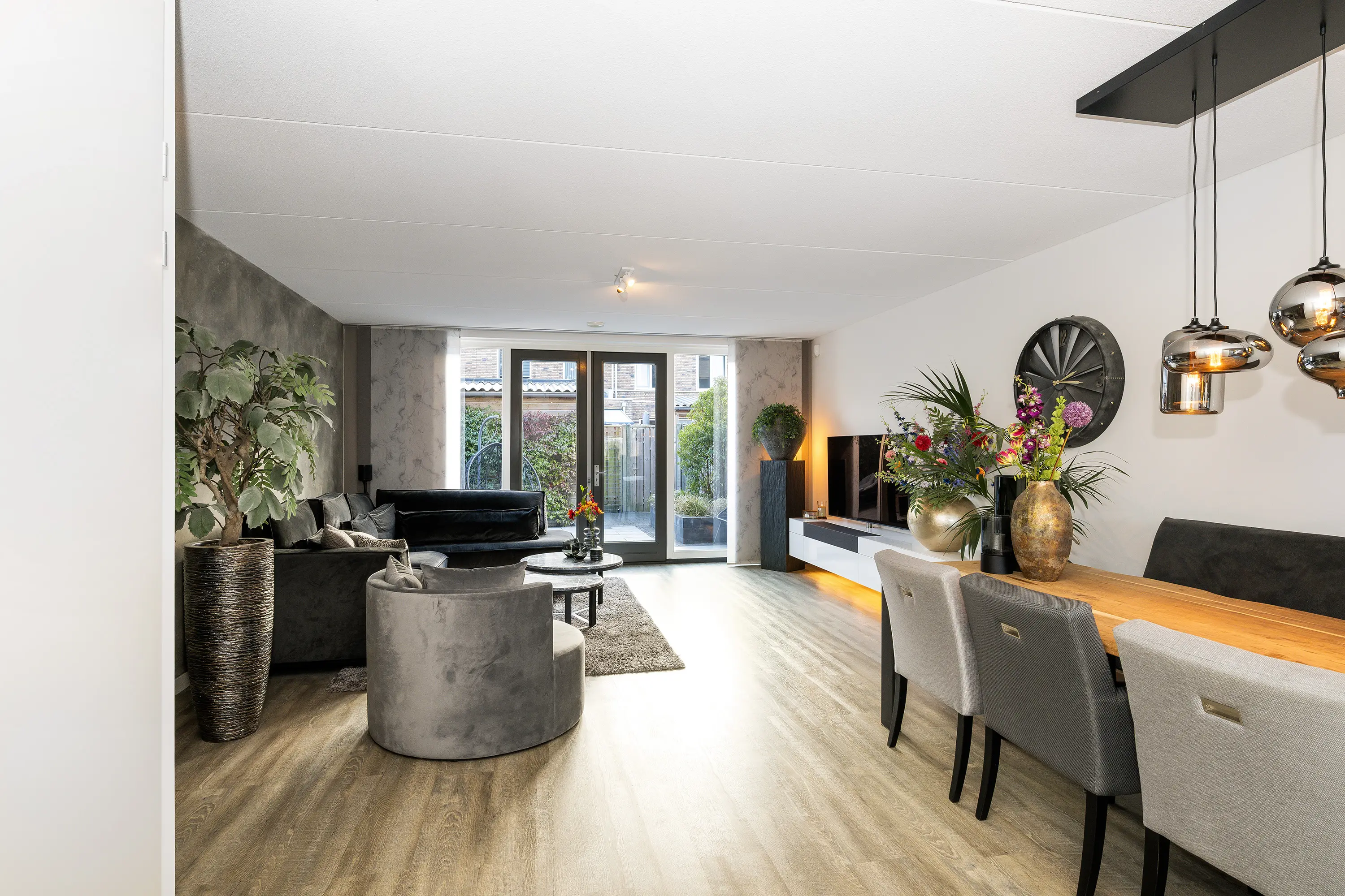 - Ruime en lichte woonkamer met pvc-vloer, trapkast en glazen pui met openslaande deuren naar de tuin;