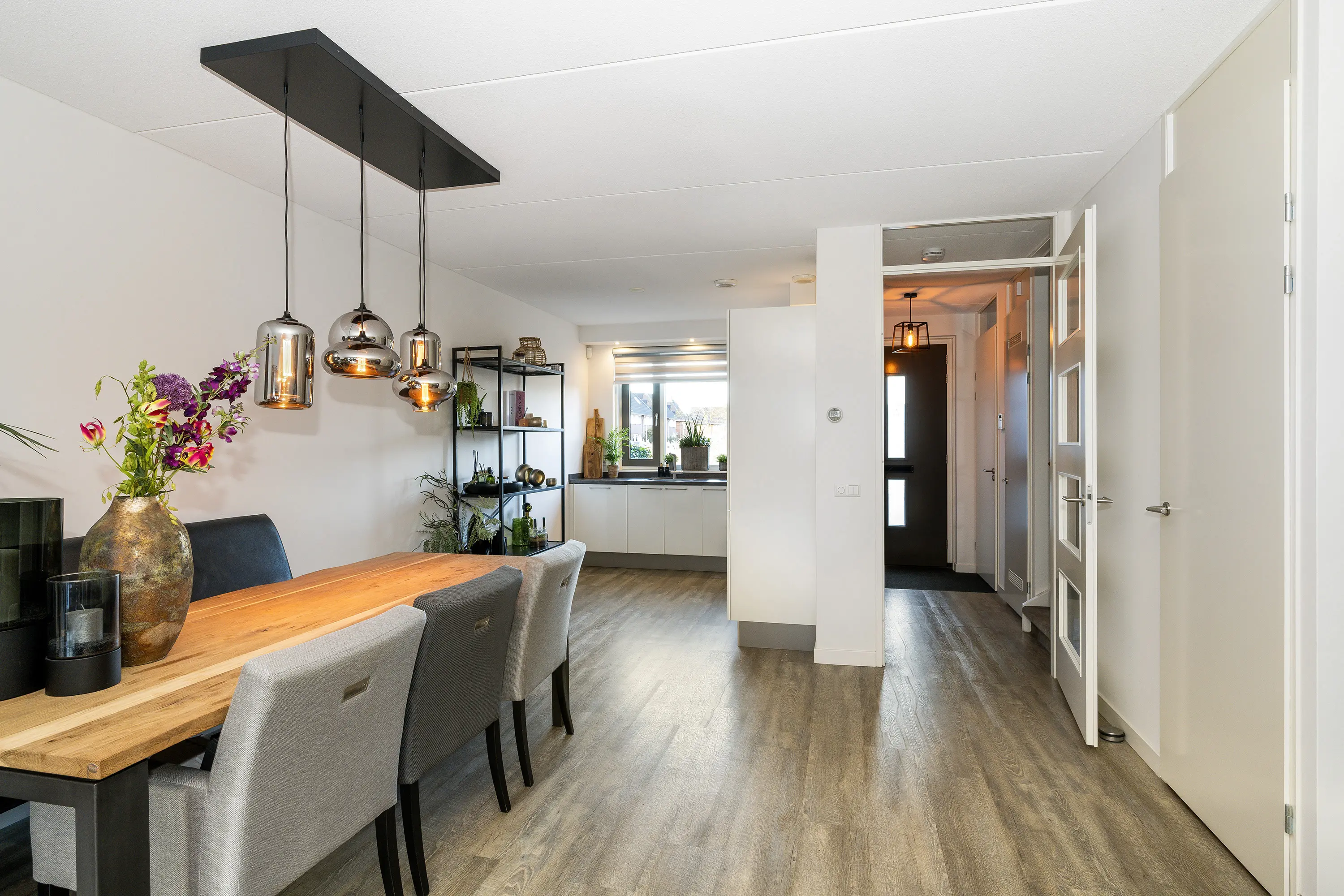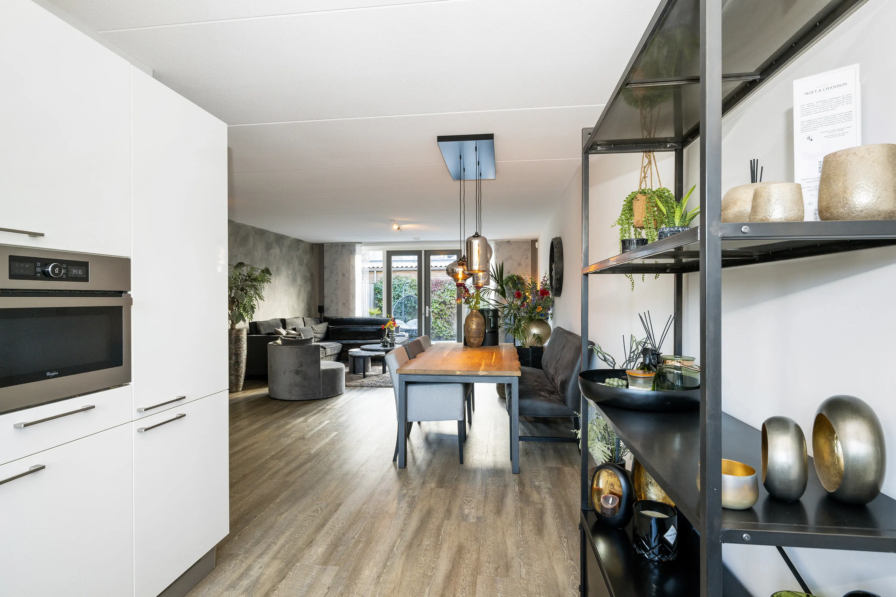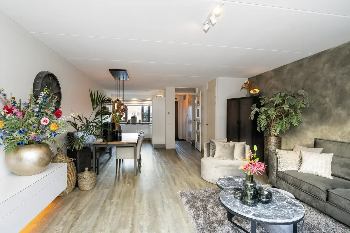 De ruime woonkamer is voorzien van een pvc-vloer en kenmerkt zich door een prettige lichtinval dankzij de glazen pui aan de achterzijde met openslaande deuren naar de tuin. Daarnaast beschikt de woonkamer over een praktische trapkast. Aan de achterzijde bevindt zich de eethoek, die grenst aan de open keuken.
