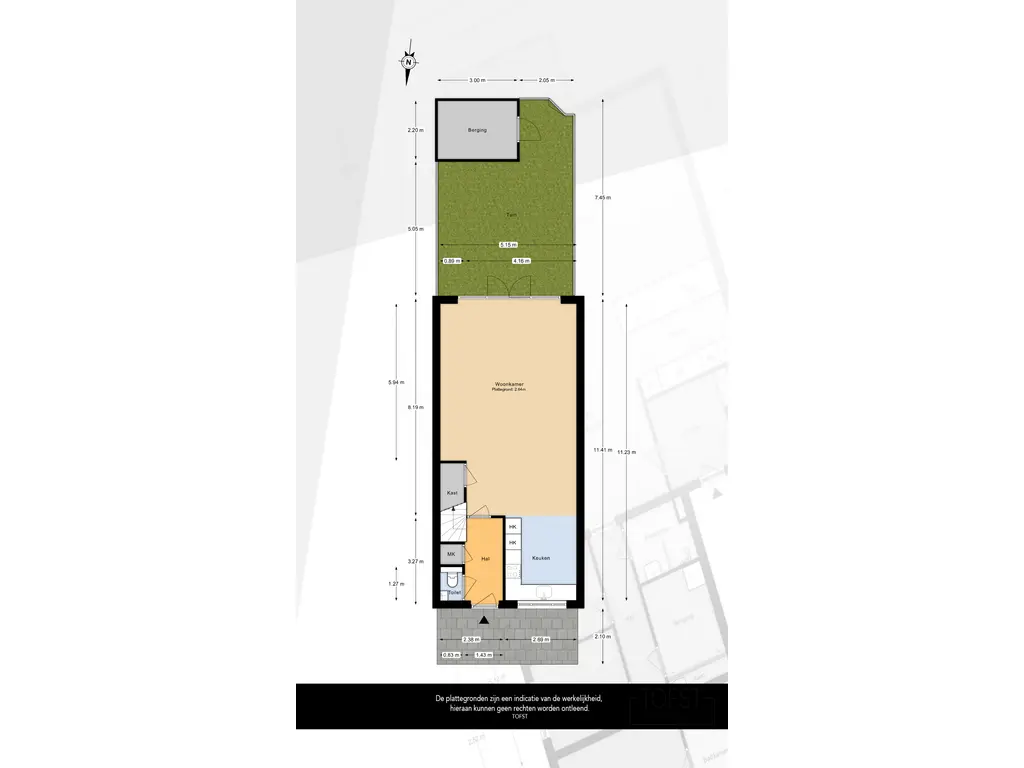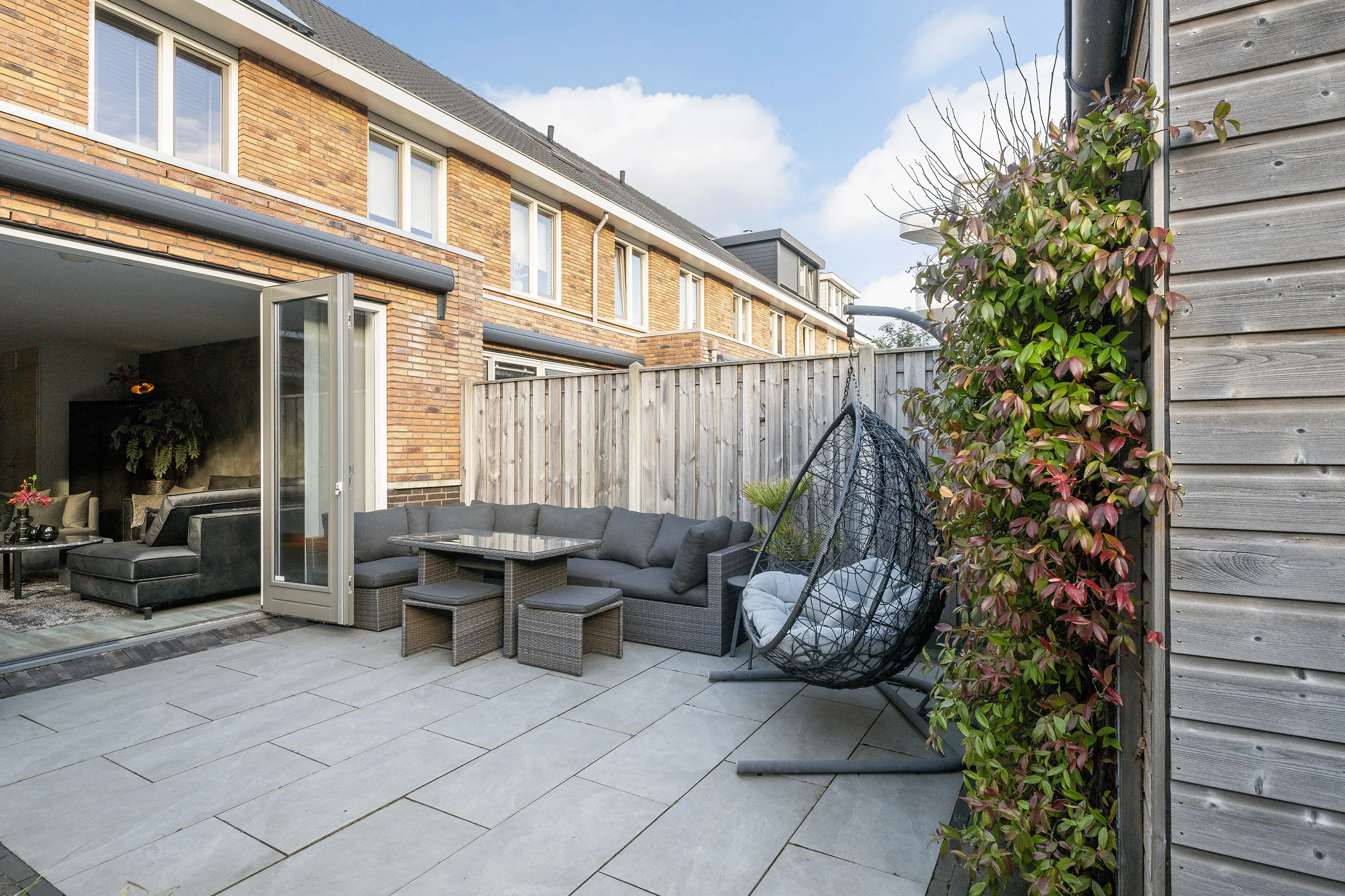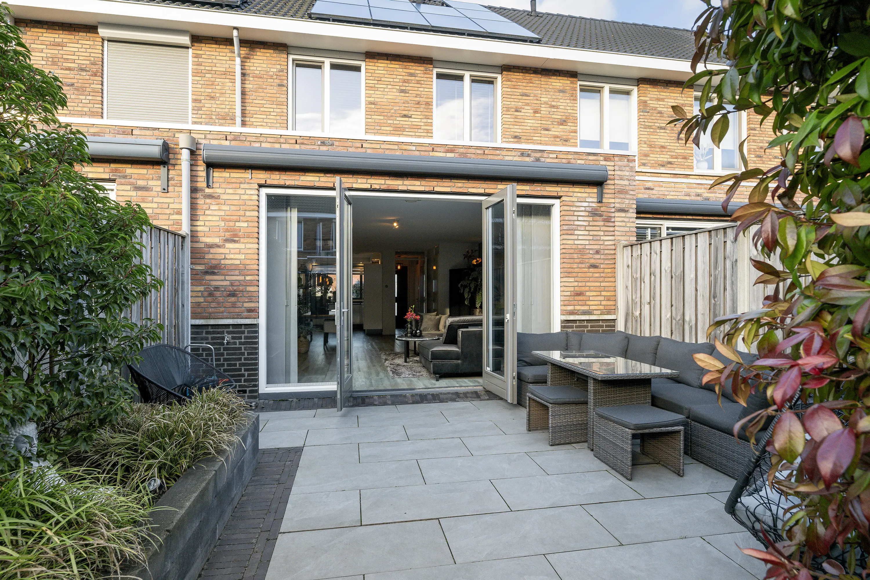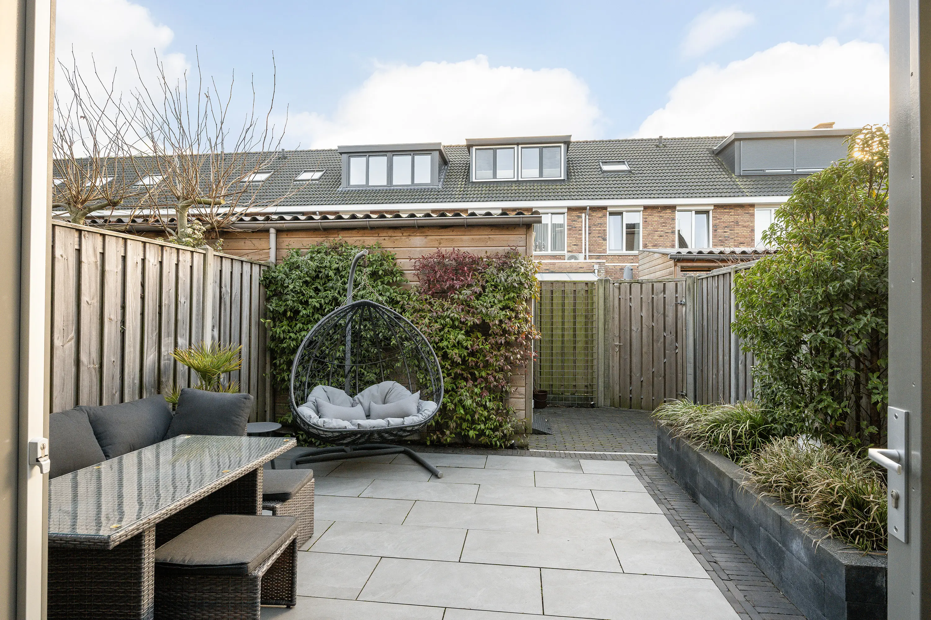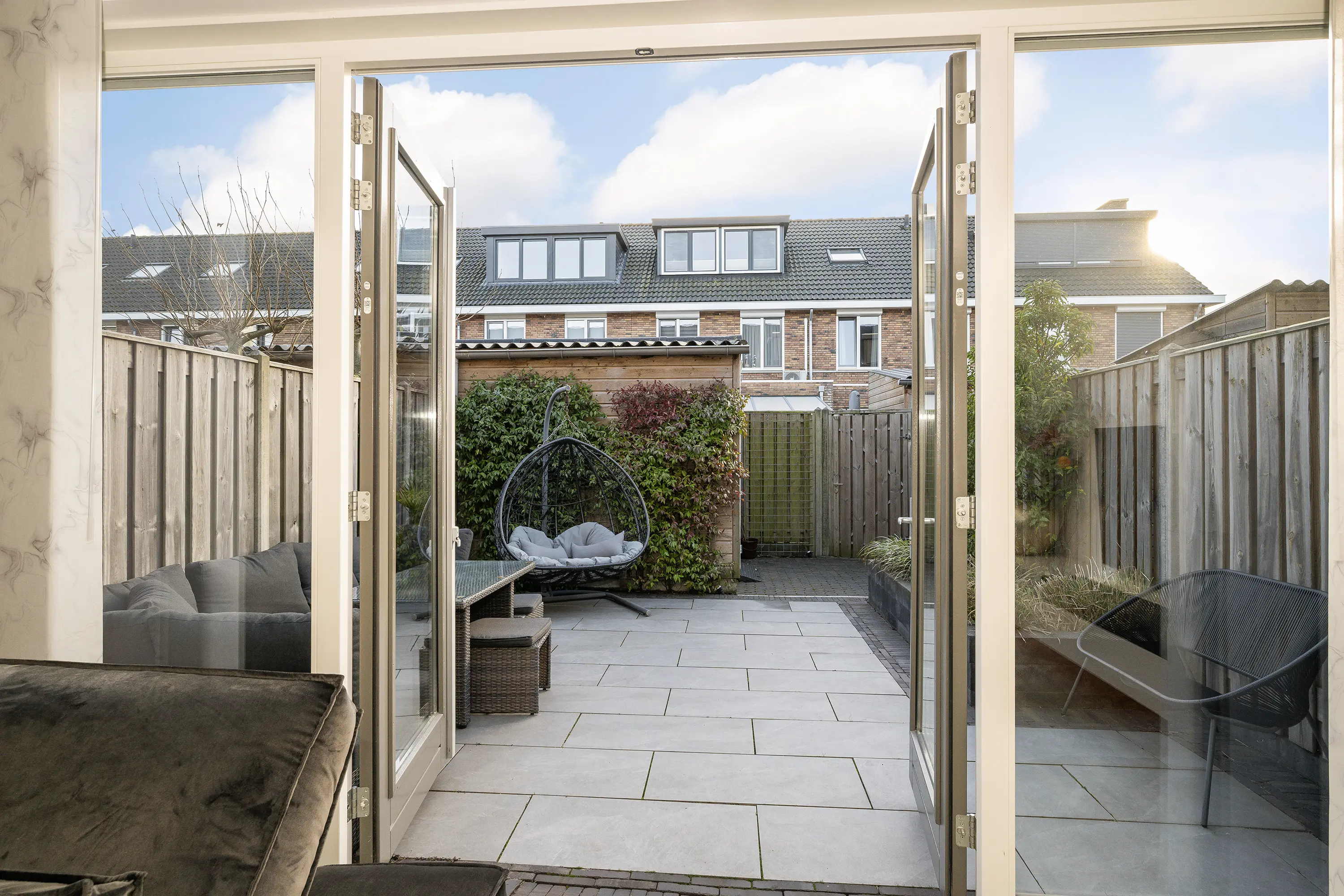 - Zonnige tuin van circa 38 m², gelegen op het zuiden, met houten berging en achterom;