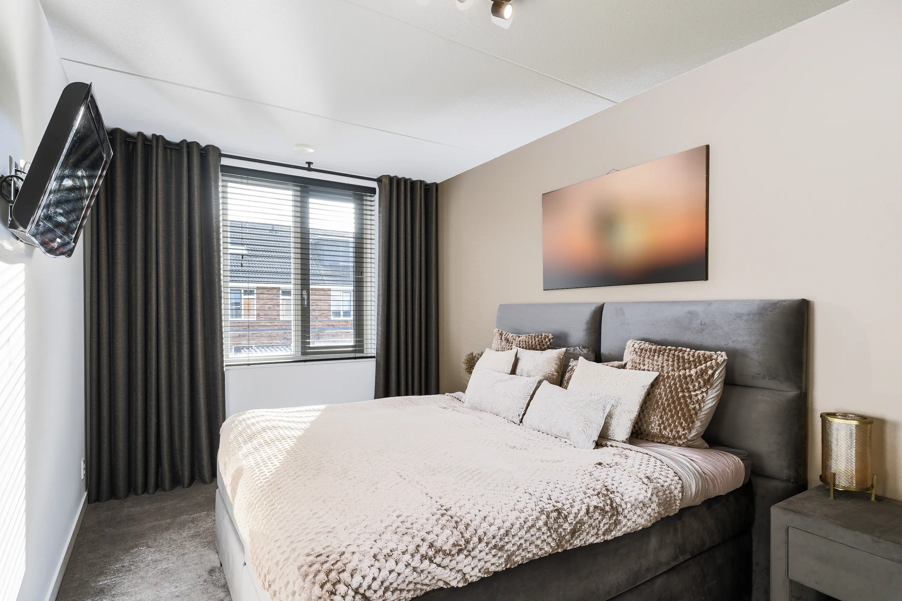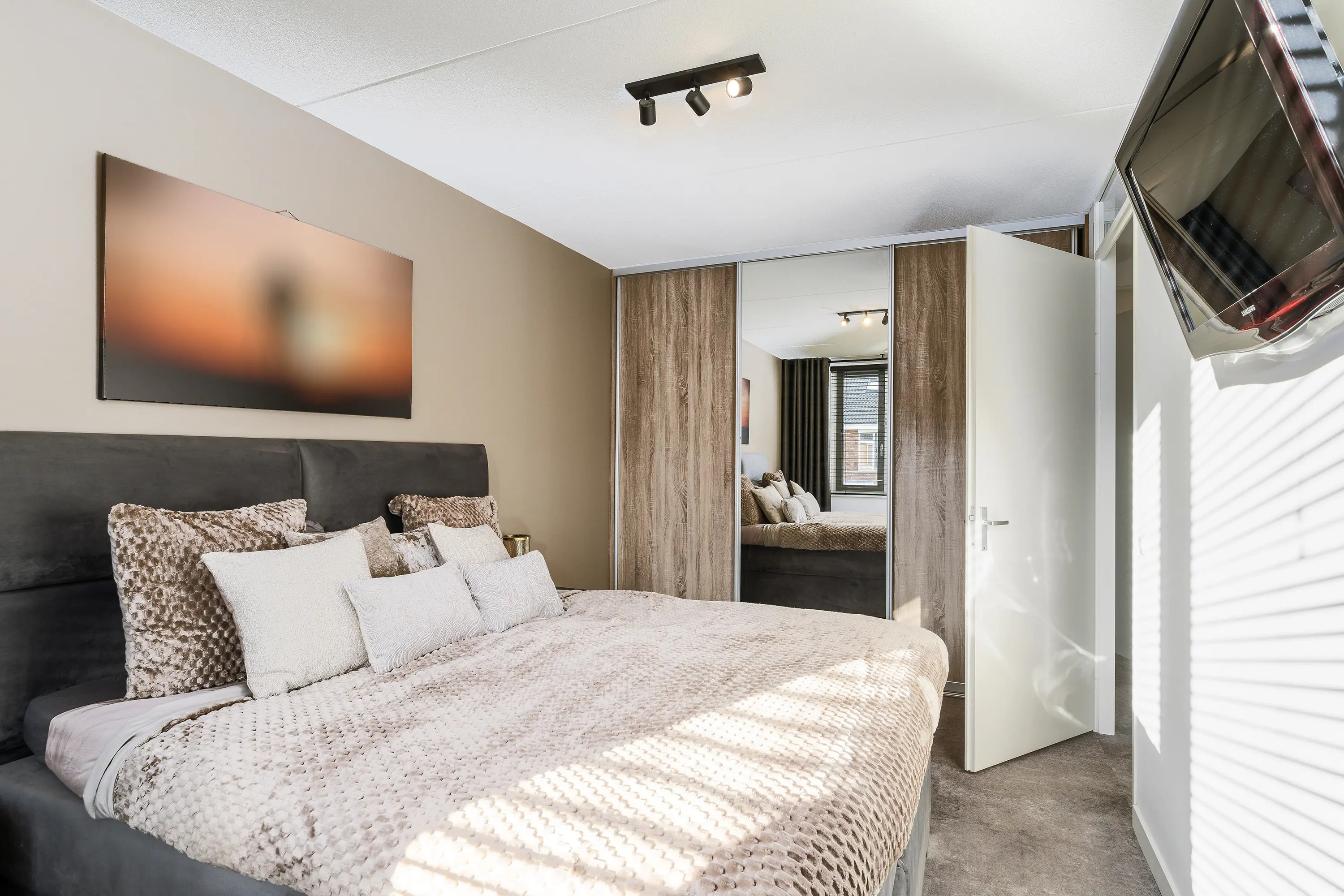 De hoofdslaapkamer is gelegen aan de achterzijde van de woning en beschikt over een ruime raampartij die zorgt voor veel natuurlijk licht. Daarnaast is deze kamer voorzien van een ingebouwde kastenwand, wat zorgt voor voldoende opbergruimte.