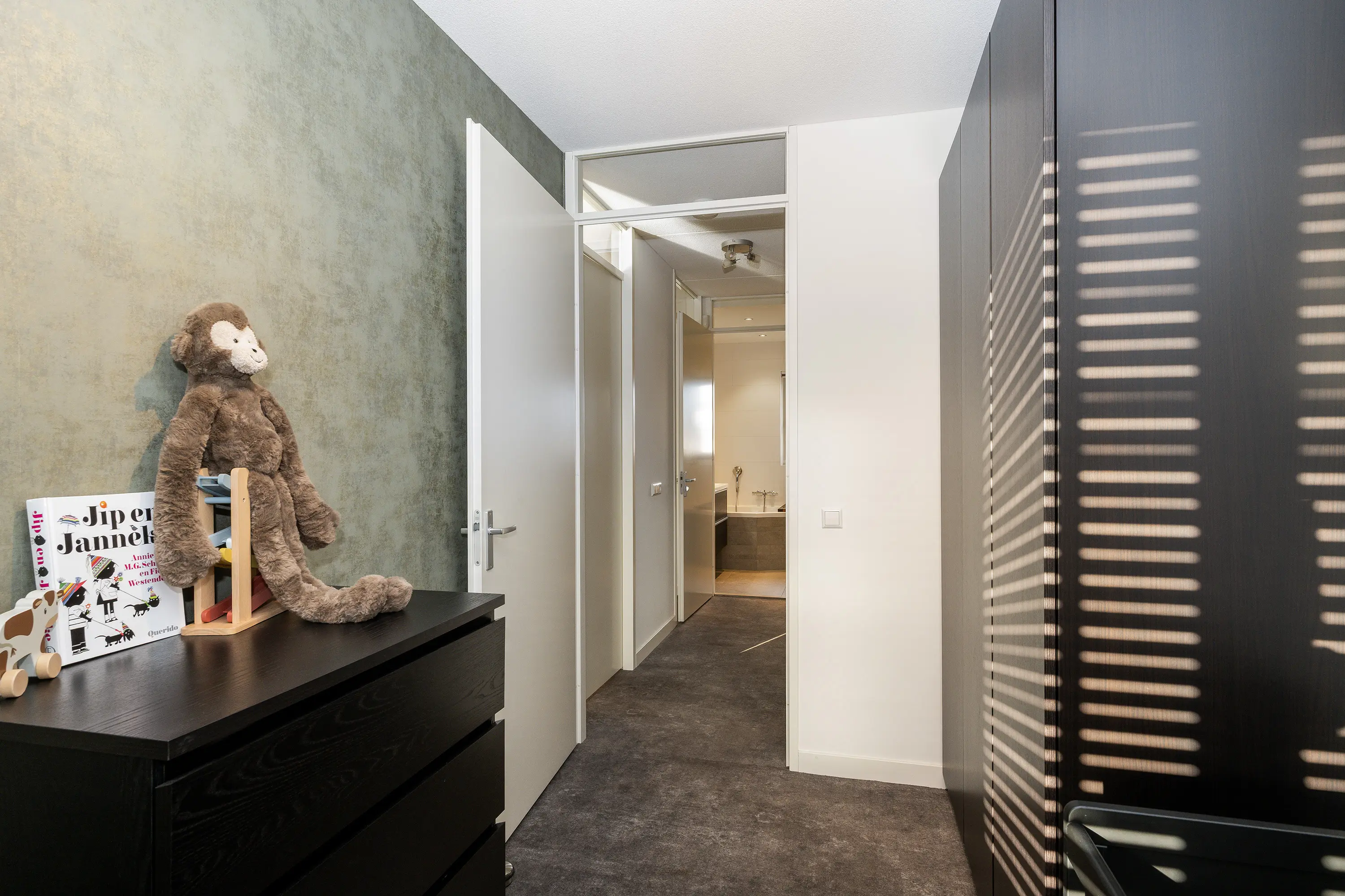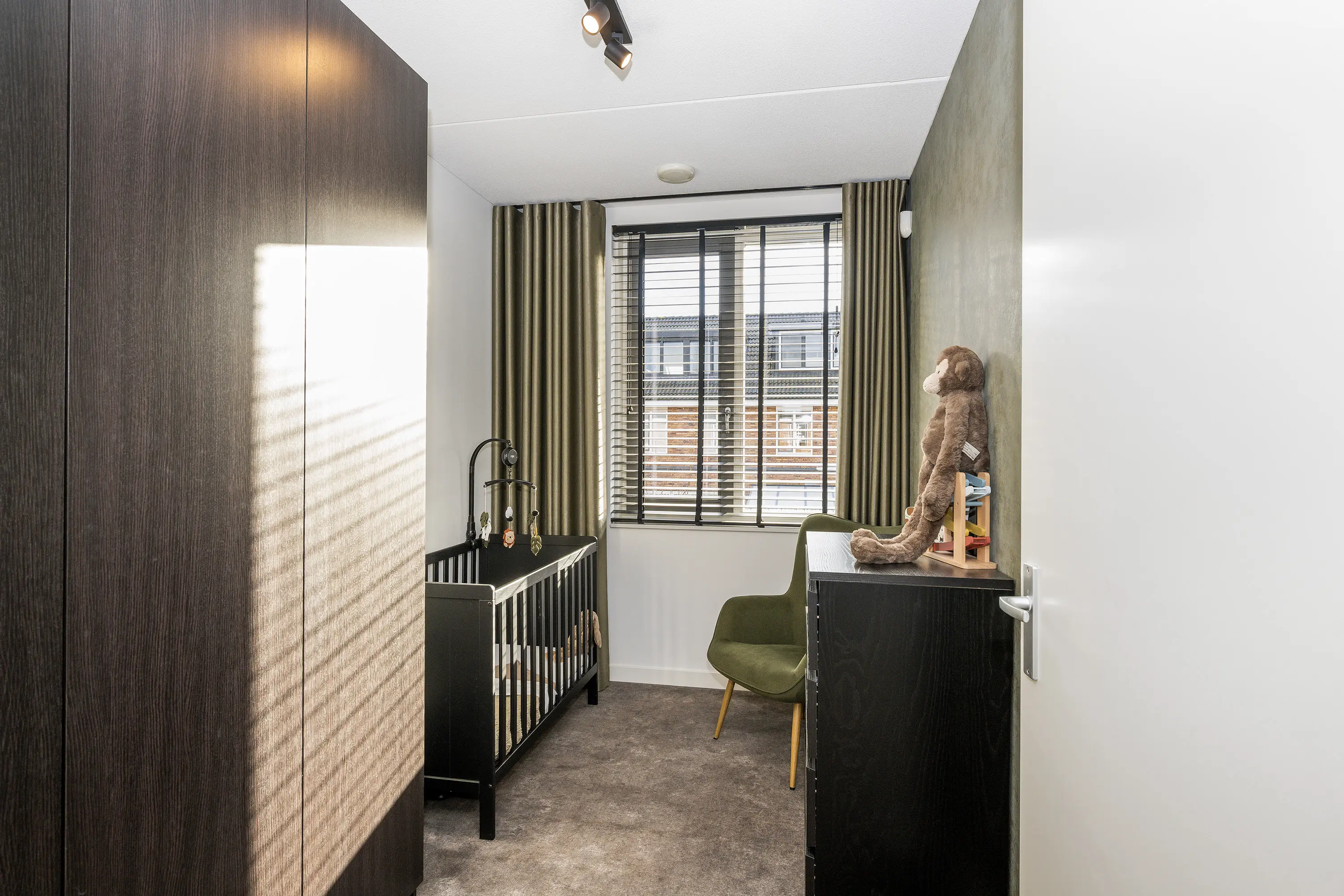 De tweede slaapkamer, eveneens gelegen aan de achterzijde, wordt momenteel gebruikt als kinderkamer en heeft een raampartij met prettige lichtinval.