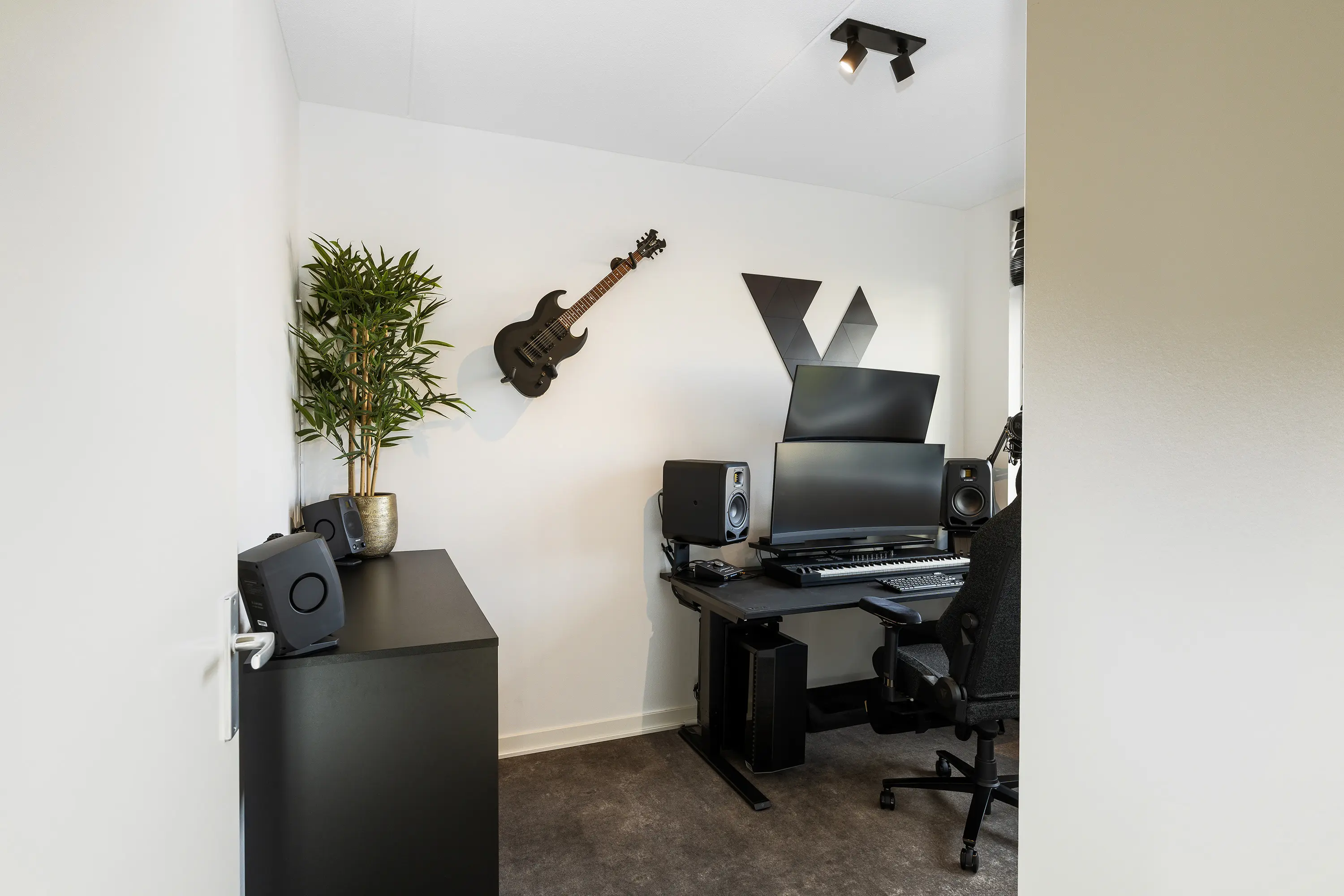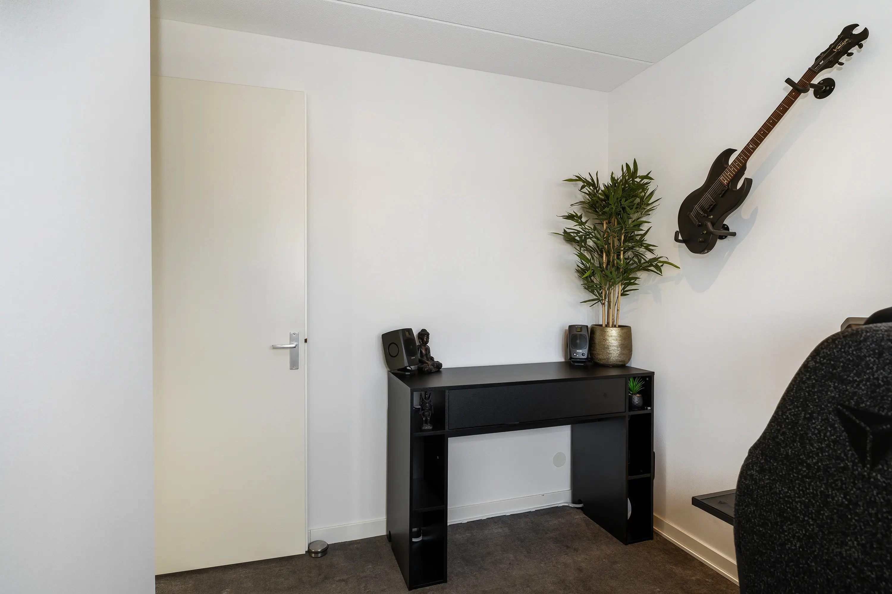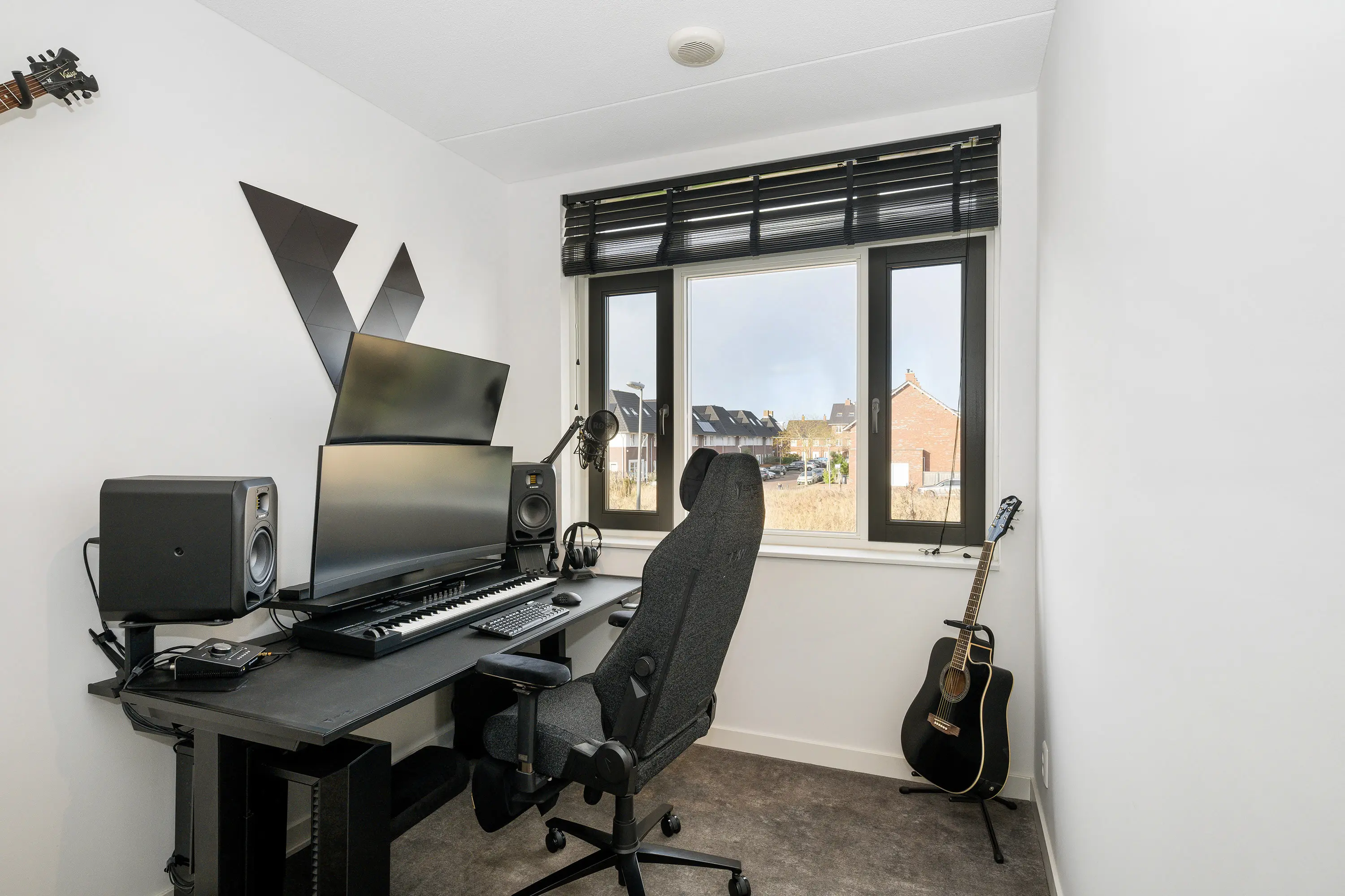 De derde slaapkamer bevindt zich aan de voorzijde van de woning en is momenteel in gebruik als kantoor/werkruimte. Dankzij de grote raampartij is deze kamer heerlijk licht en bovendien ruim genoeg om te dienen als volwaardige slaapkamer.