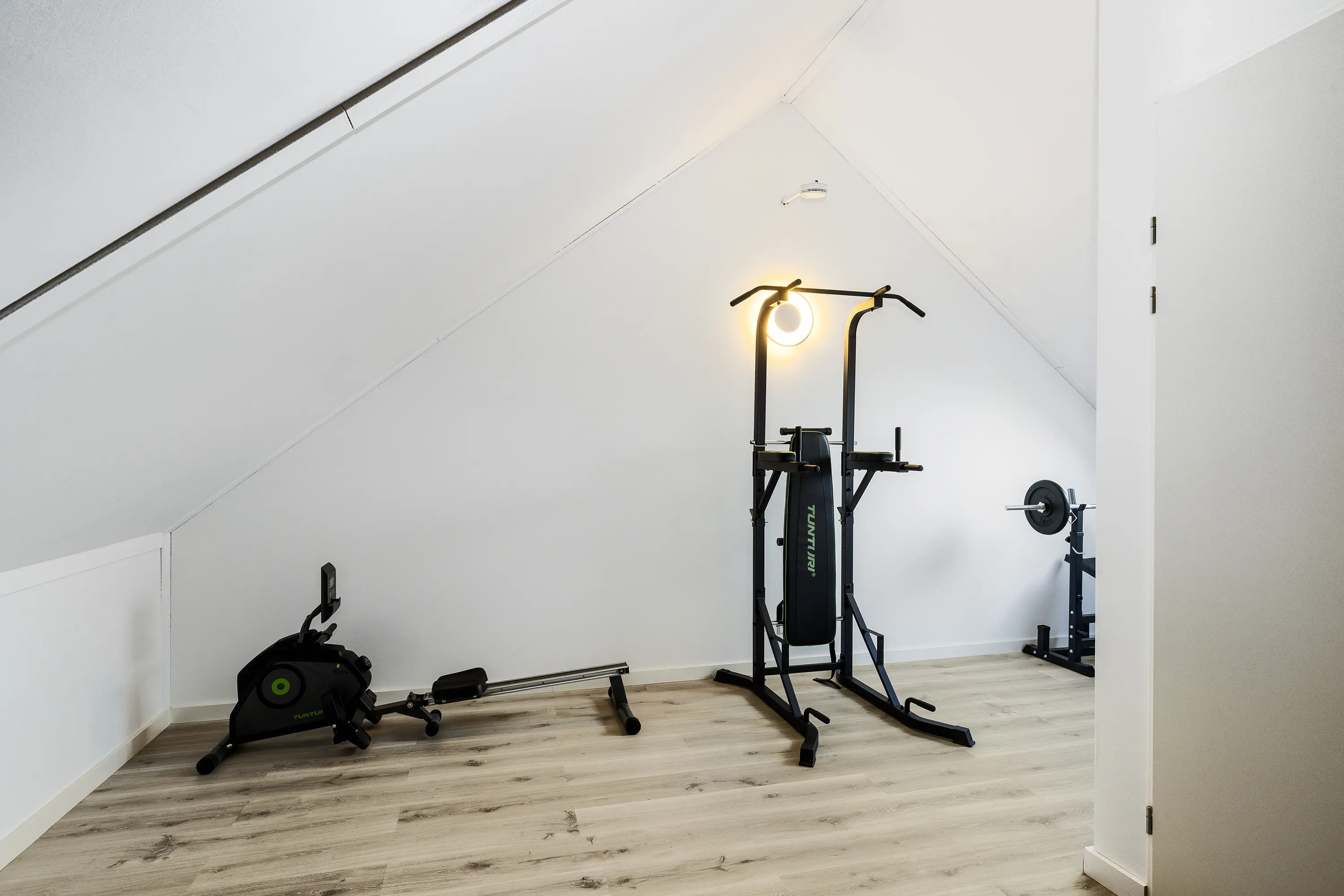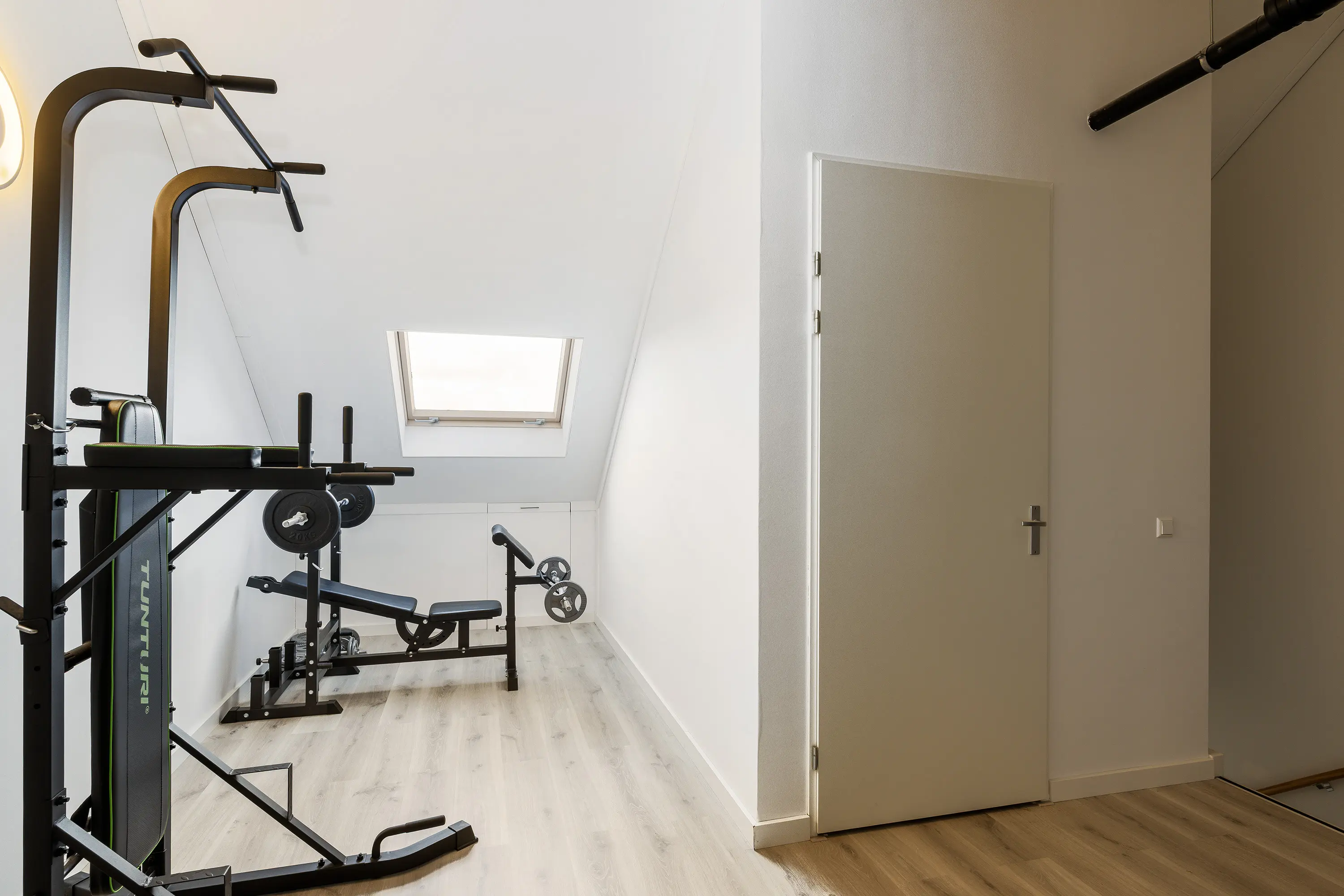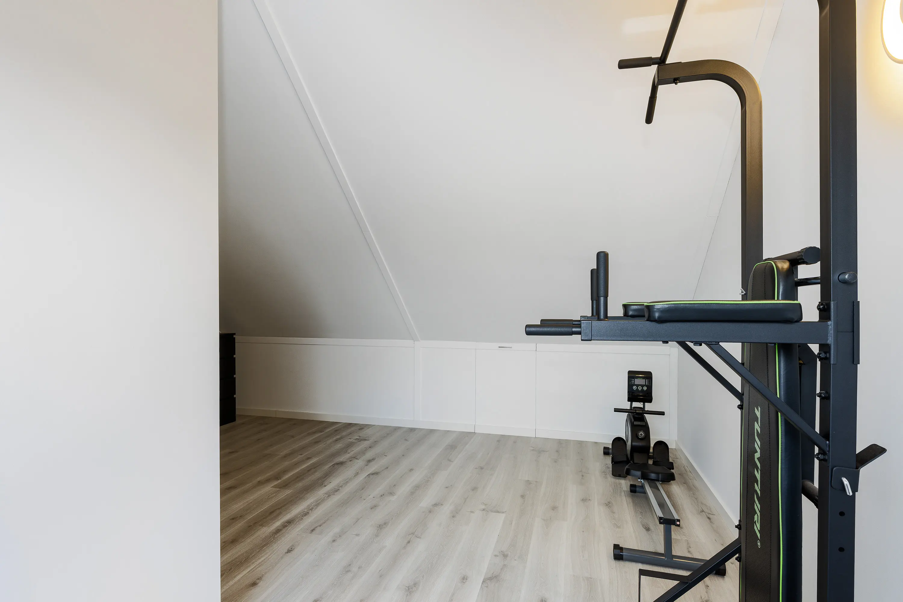 De verdieping wordt op dit moment gebruikt als sportruimte, maar kan eenvoudig worden ingericht als een volwaardige extra slaapkamer, werkruimte of hobbykamer, wat deze woning extra flexibel maakt.