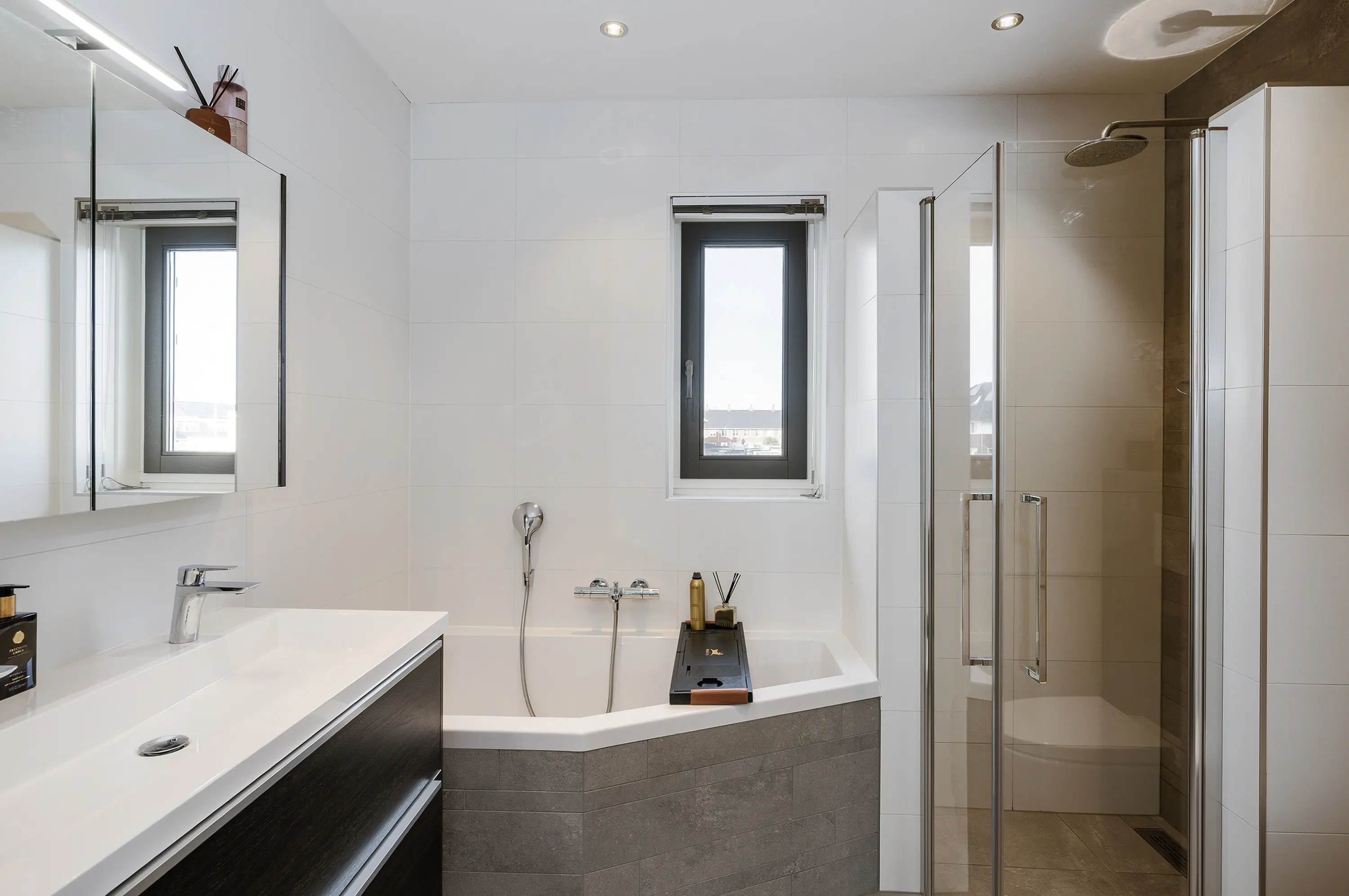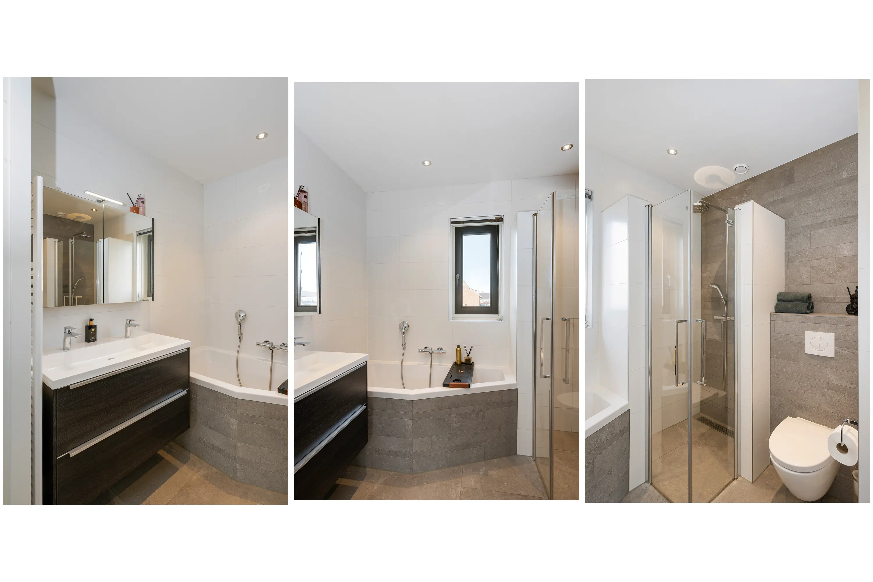 De badkamer, eveneens gelegen aan de voorzijde van de woning, is uitgerust met een ligbad, douche, toilet en een dubbel wastafelmeubel. De badkamer heeft een strakke en moderne uitstraling, mede door de witte wandtegels in combinatie met bruinaccenten op de wand en vloer.