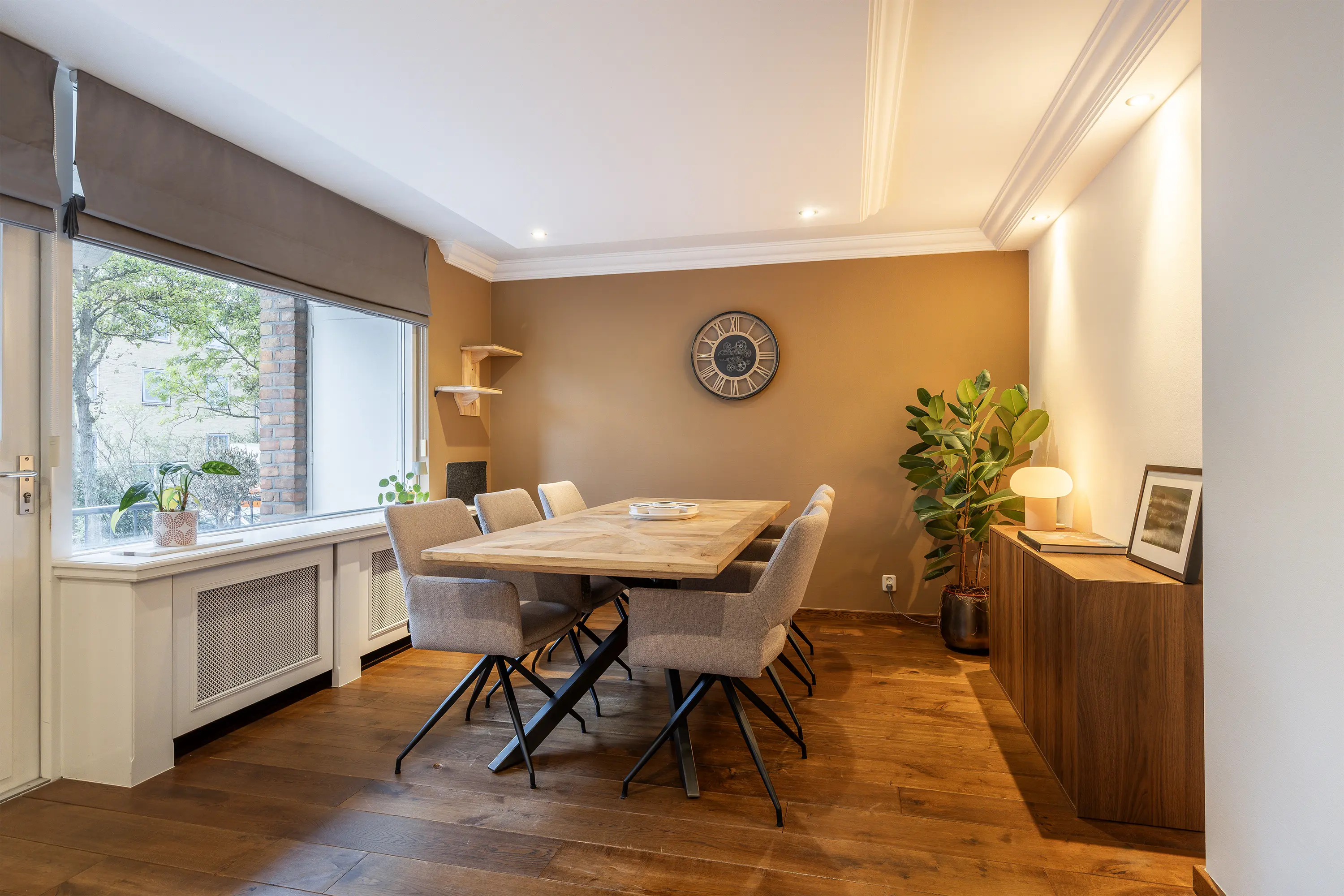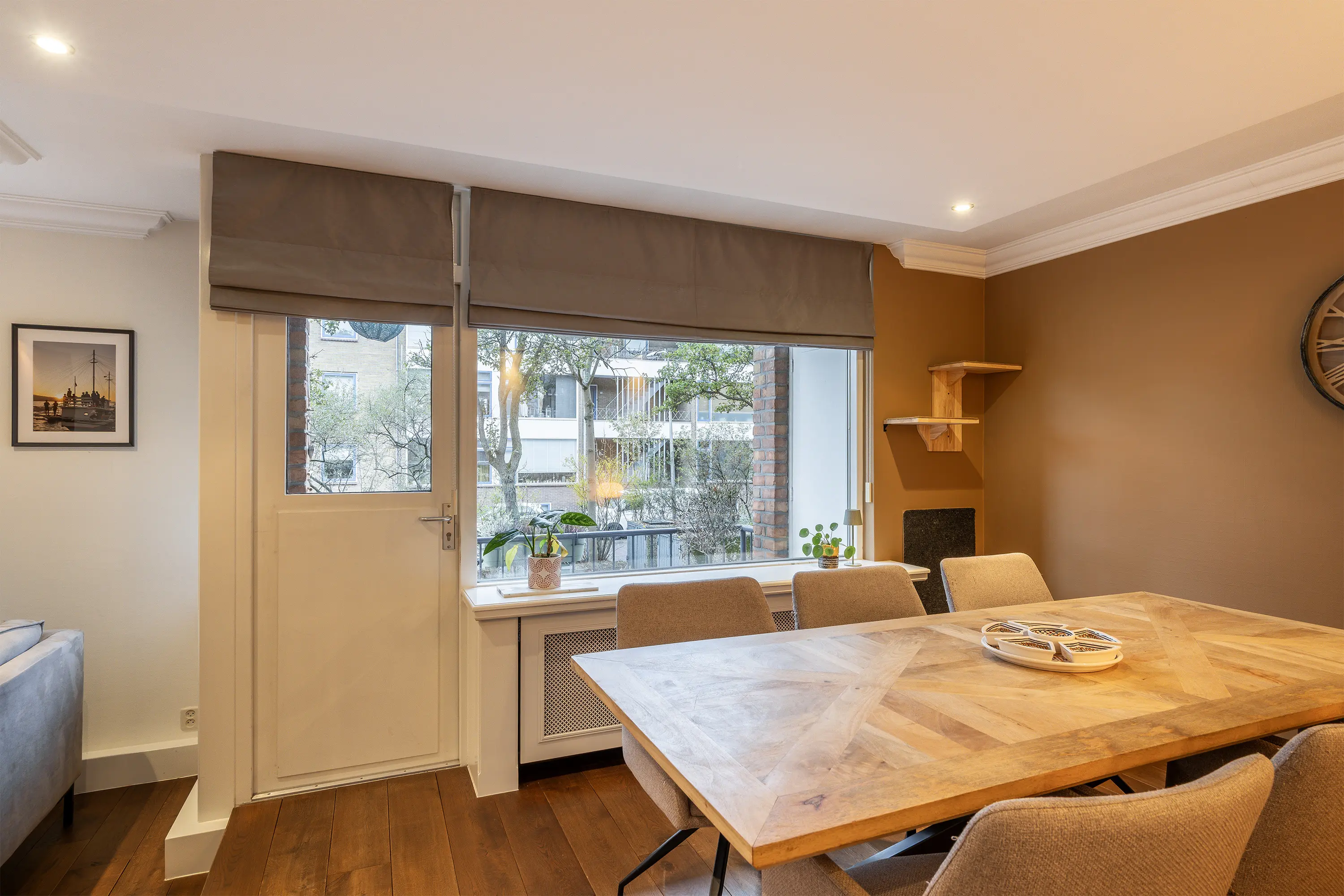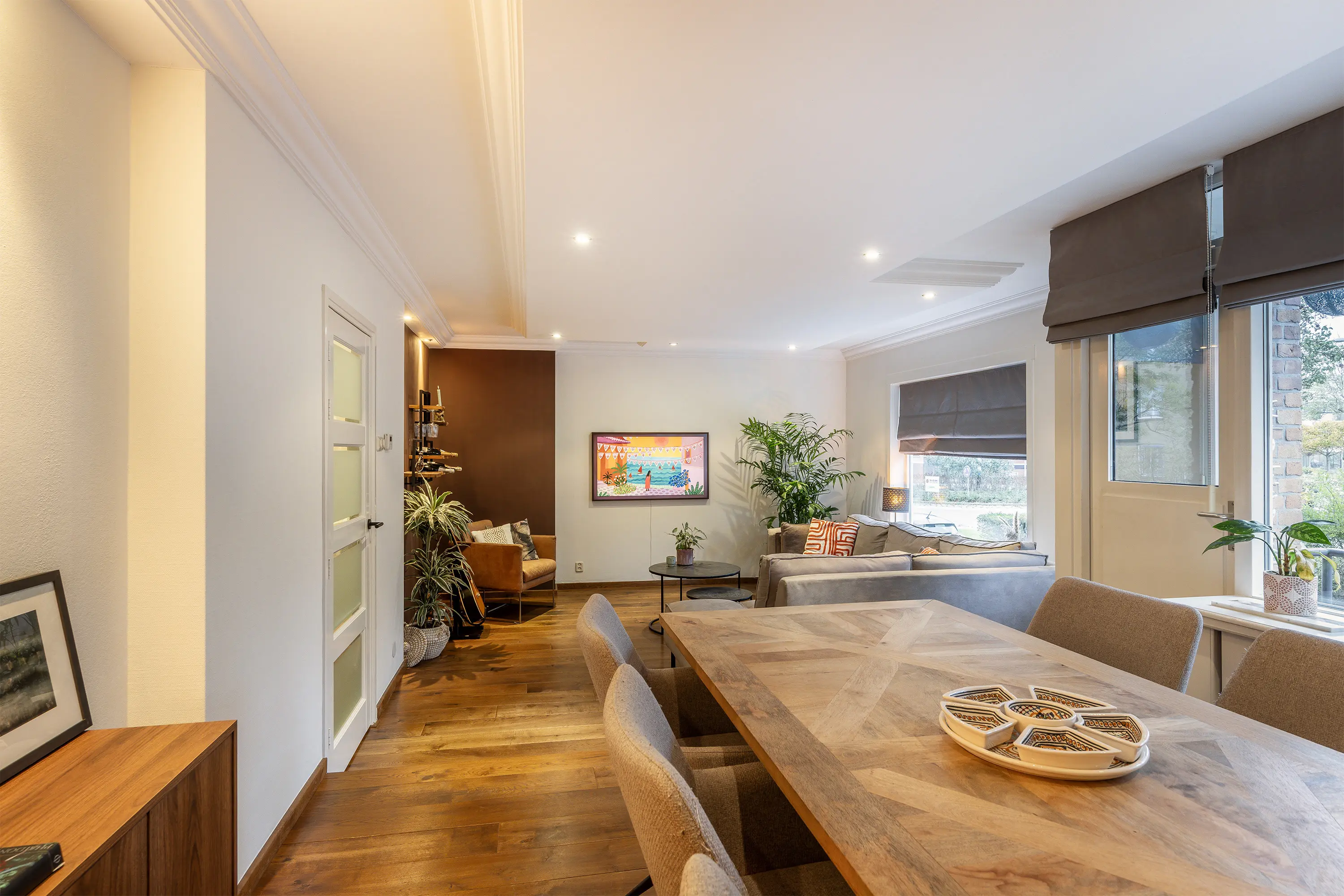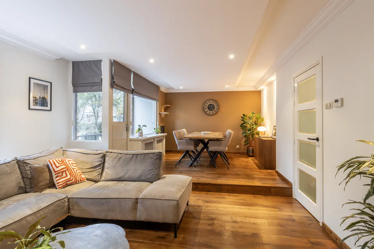 De woonkamer, gelegen aan de achterzijde, is verrassend ruim en heerlijk licht door de grote raampartijen. De ruimte is strak afgewerkt met glad gestuukte wanden, een verlaagd plafond met inbouwspots en sierlijsten. Wat direct opvalt, is de prachtige eikenhouten vloer die in de hele woning is doorgelegd, deze zorgt voor een warme uitstraling en vormt een stijlvol contrast met de strak afgewerkte wanden. Door het subtiele hoogteverschil is de woonkamer opgedeeld in twee delen: een gezellige zithoek met plek voor een ruime hoekbank en een hoger gelegen eetgedeelte waar u fijn kunt tafelen met uitzicht op het balkon. Vanuit hier stapt u via de loopdeur naar het balkon, voorzien van houtlook terrastegels en voldoende ruimte voor een gezellig zitje. Een heerlijke plek om van het zonnetje te genieten!