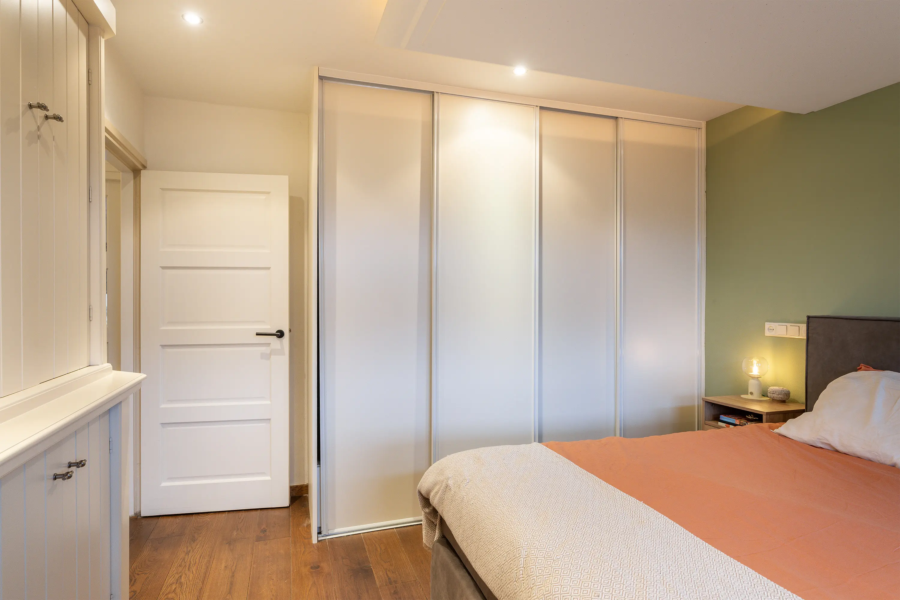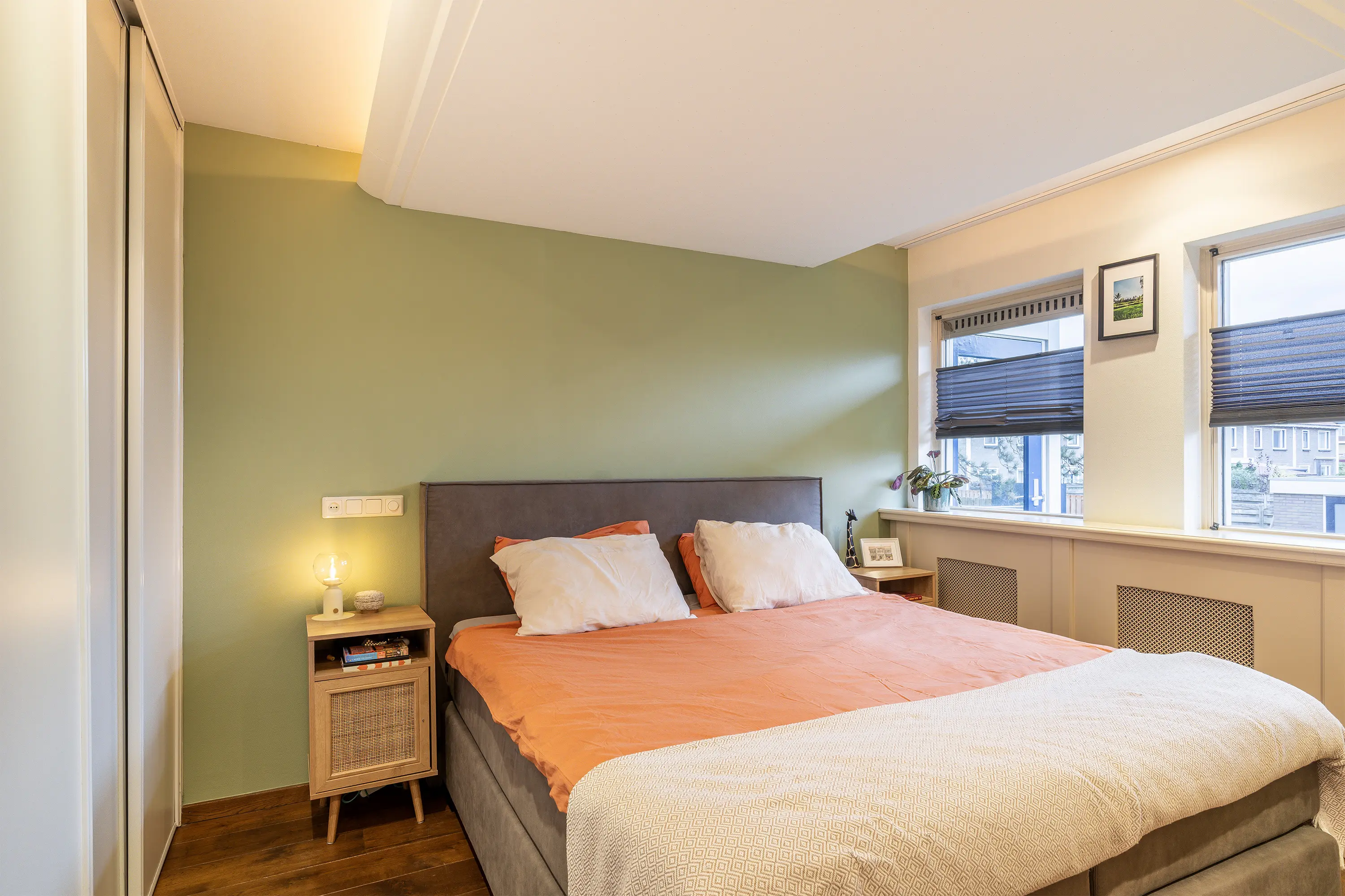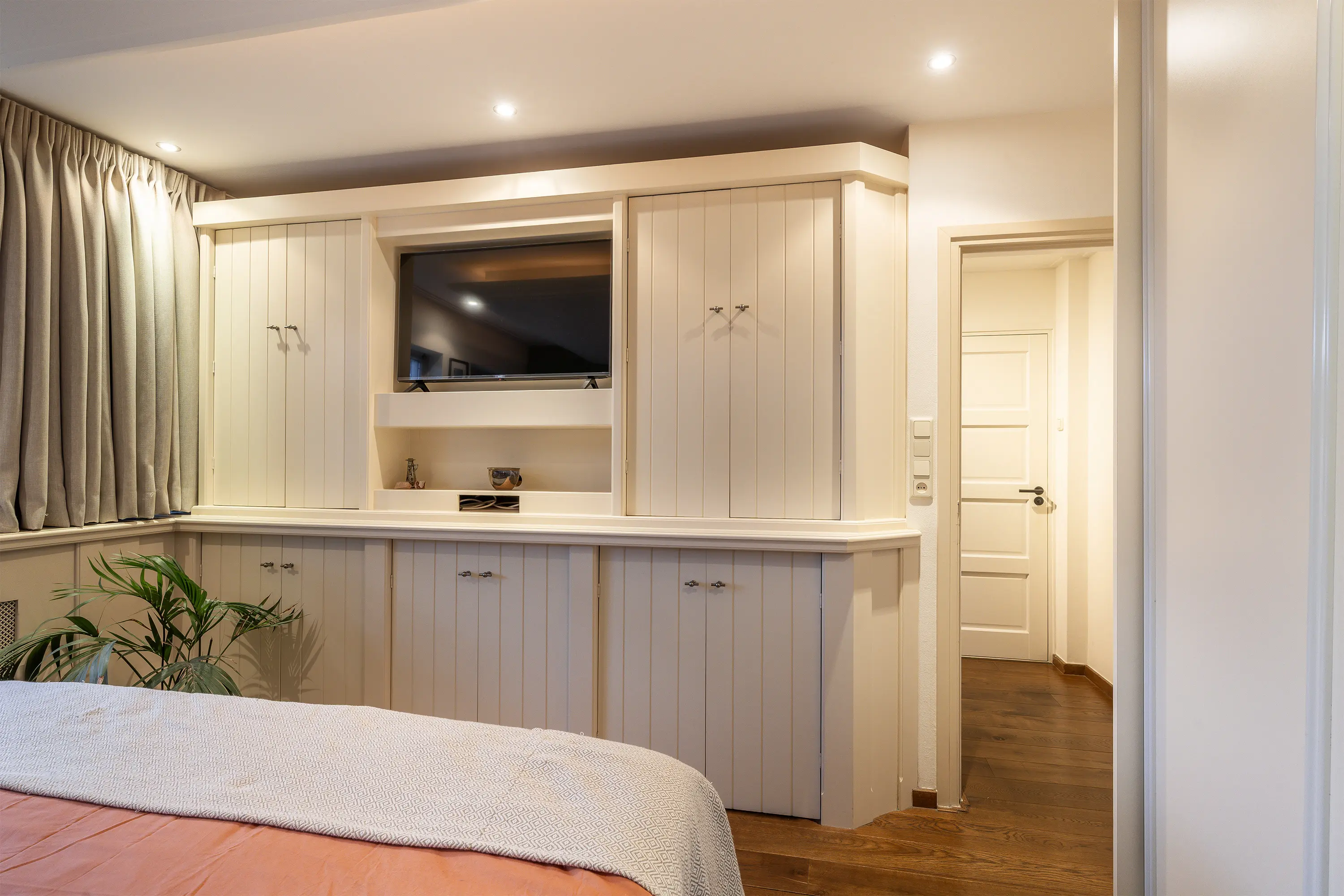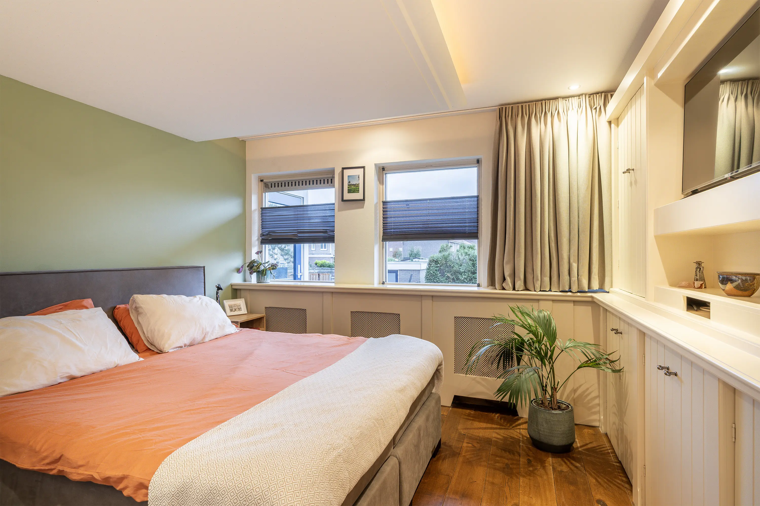 De hoofdslaapkamer bevindt zich ook aan de voorzijde en is heerlijk licht. Er is een vaste kastenwand aanwezig met veel opbergruimte, en de radiatorombouw én het tv-meubel zijn op maat gemaakt in landelijke stijl. De eiken houten vloer loopt hier mooi door en het verlaagde plafond met verlichting zorgt voor extra sfeer.