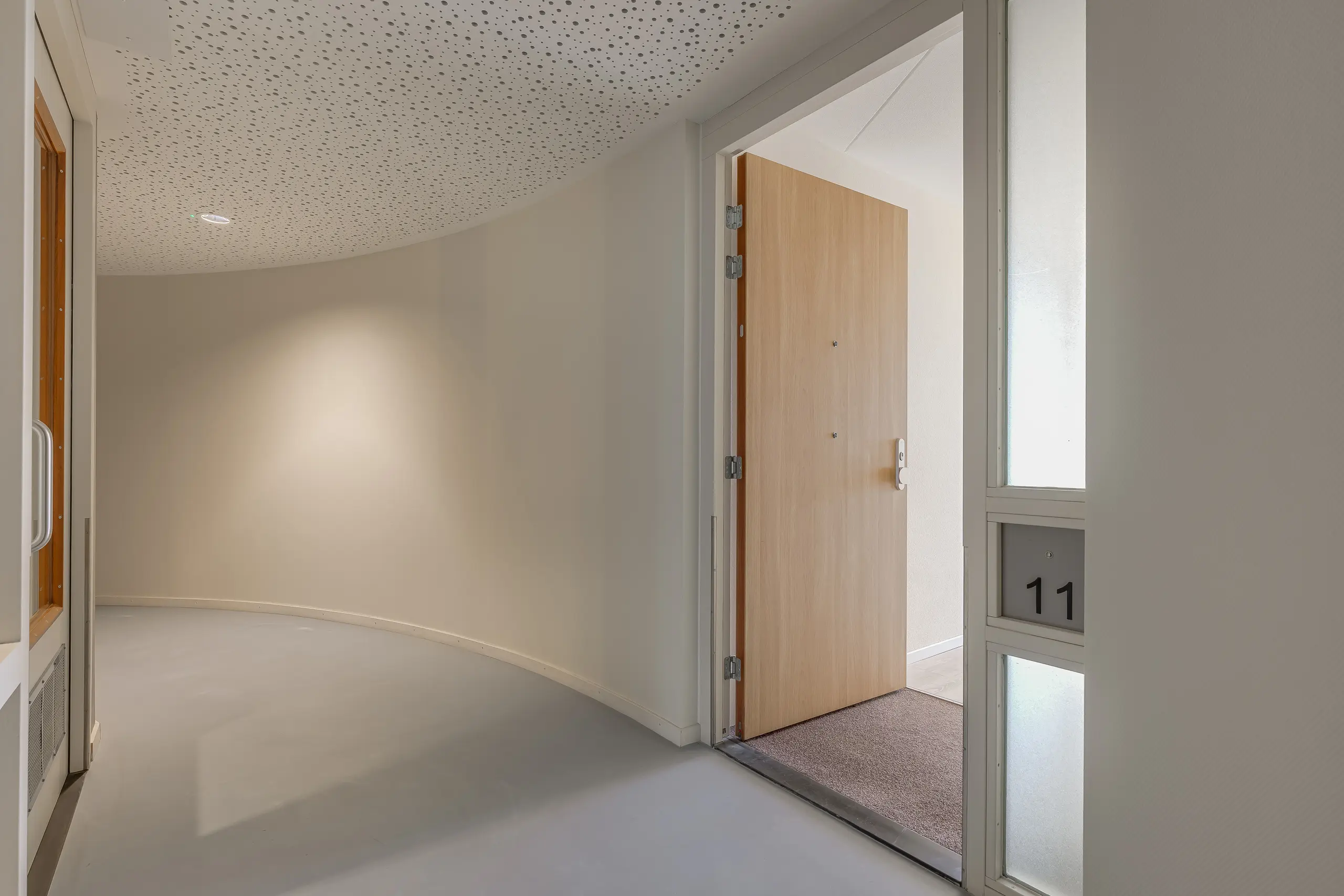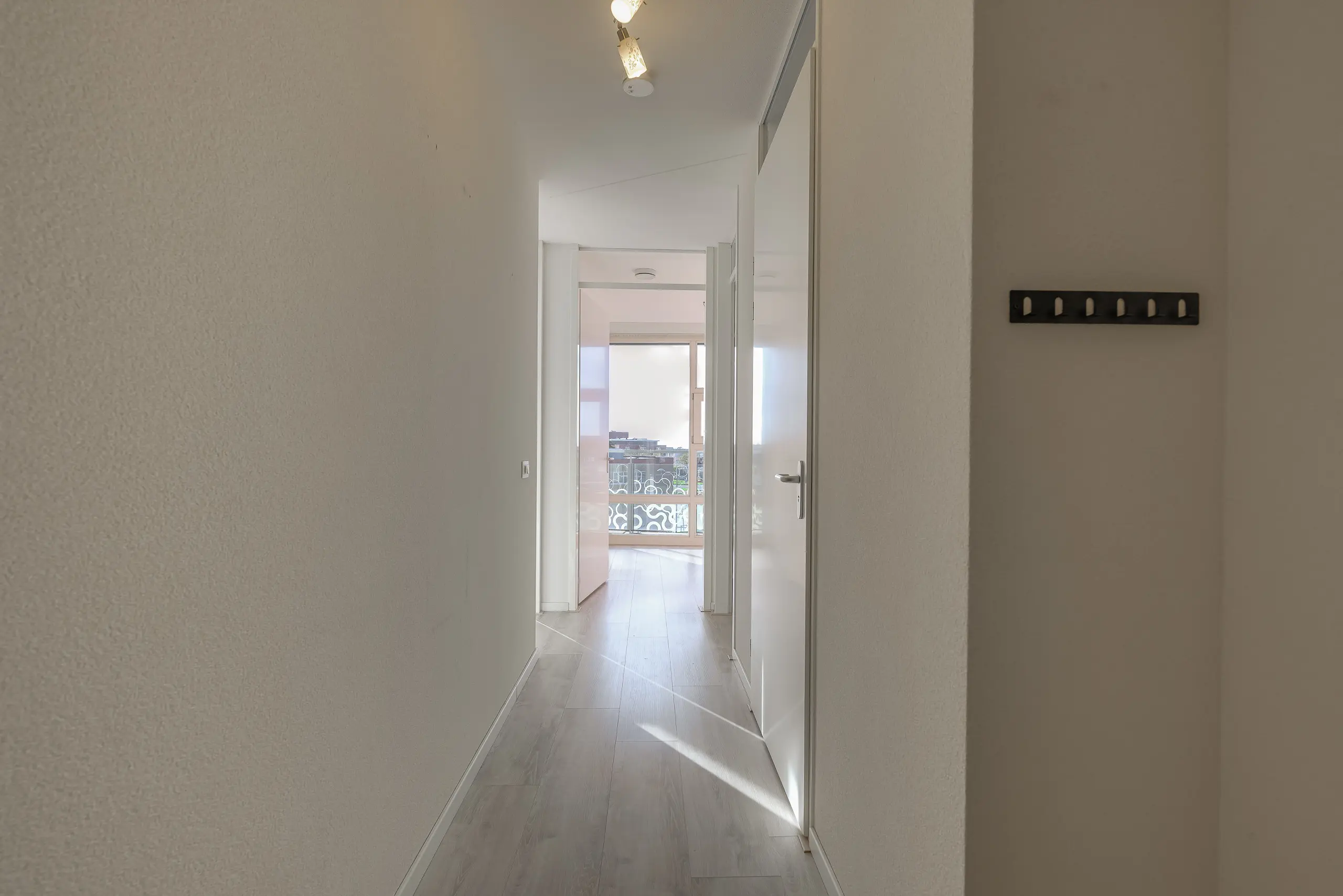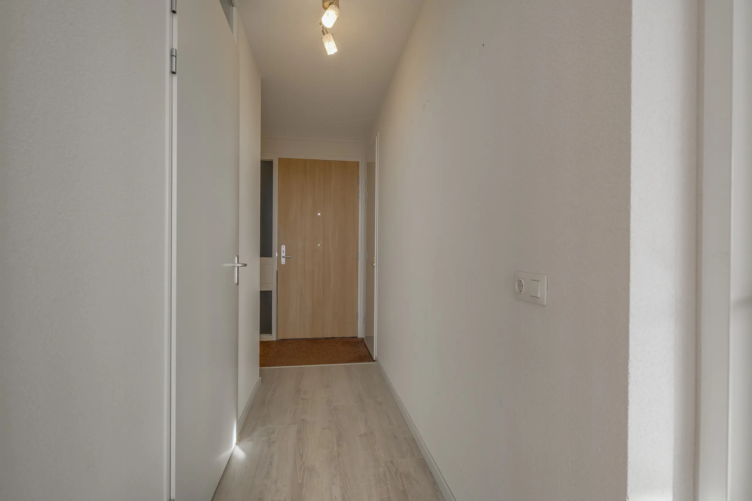 Bij binnenkomst in het appartement wordt u verwelkomd door een ruime hal die toegang biedt tot alle vertrekken. Aan de rechterzijde bevindt zich het separate toilet met fontein, terwijl aan de linkerzijde de meterkast is gesitueerd.