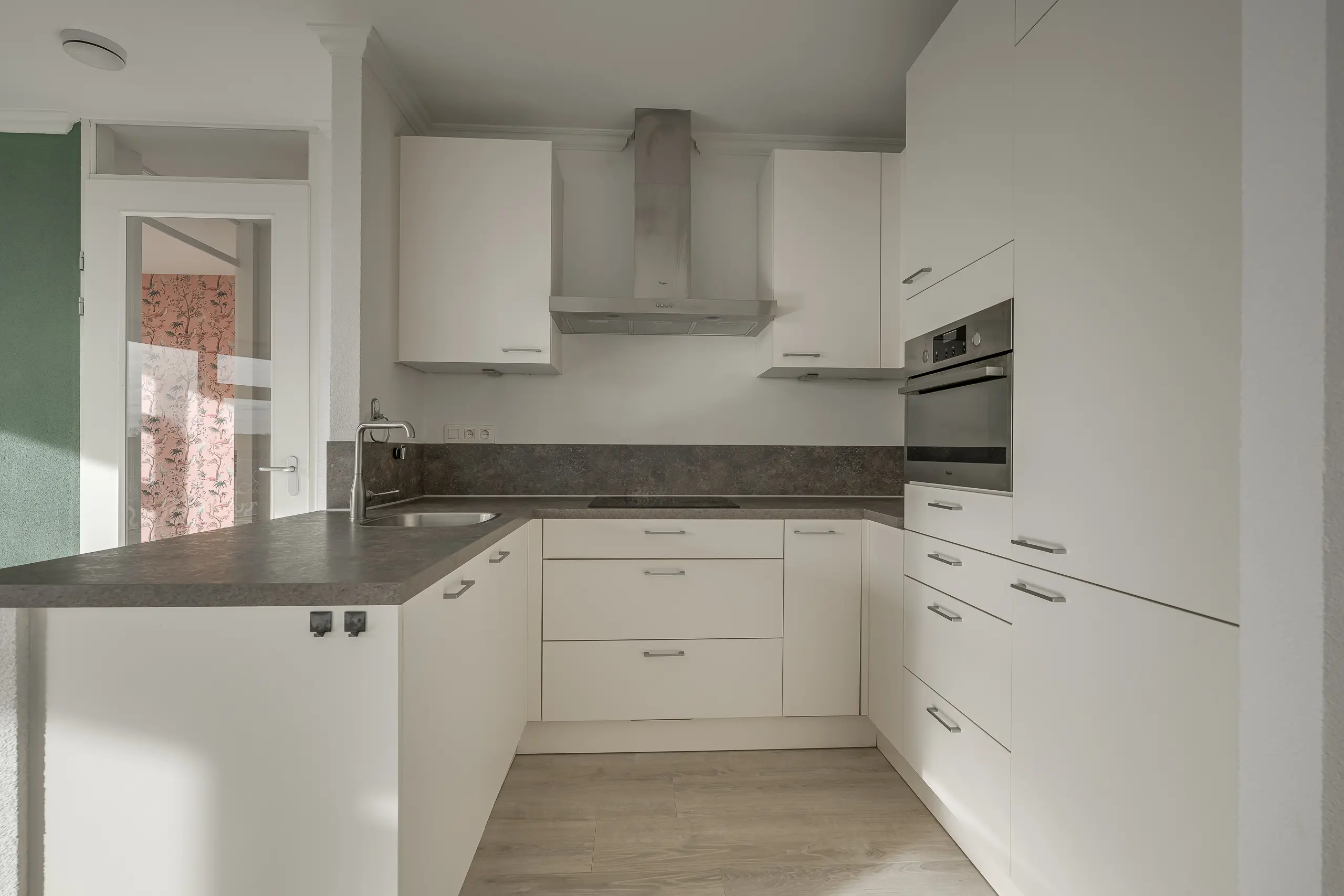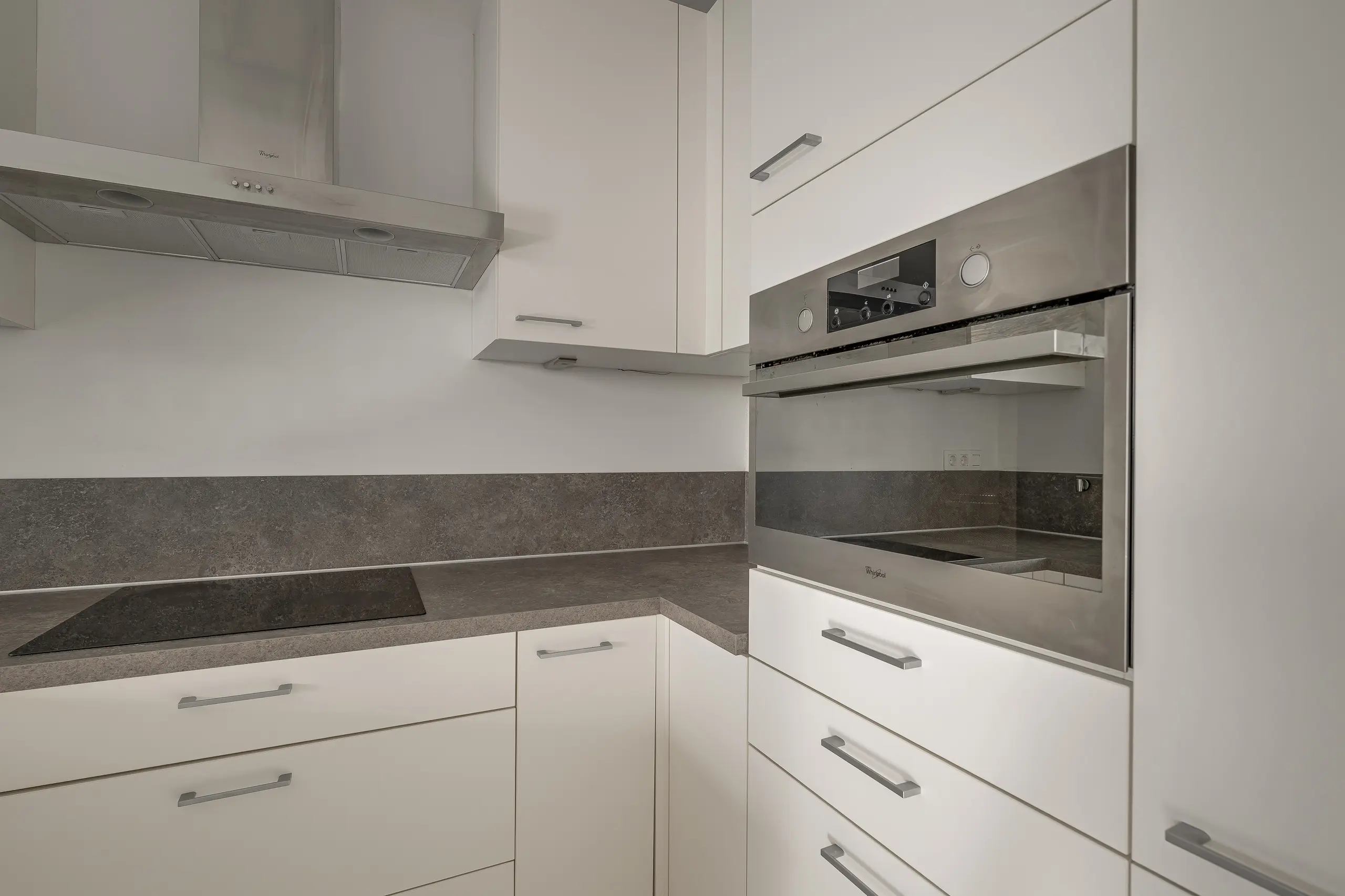 De moderne keuken bevindt zich aan de achterzijde van de woonkamer en is van alle gemakken voorzien: een inductiekookplaat, combimagnetron, afzuigkap, koelkast, vriezer en vaatwasser. Aangrenzend bevindt zich een ruime bergkast, ideaal voor voorraad of schoonmaakspullen, met opstelplaats voor de cv-installatie én aansluitingen voor de wasmachine en droger.