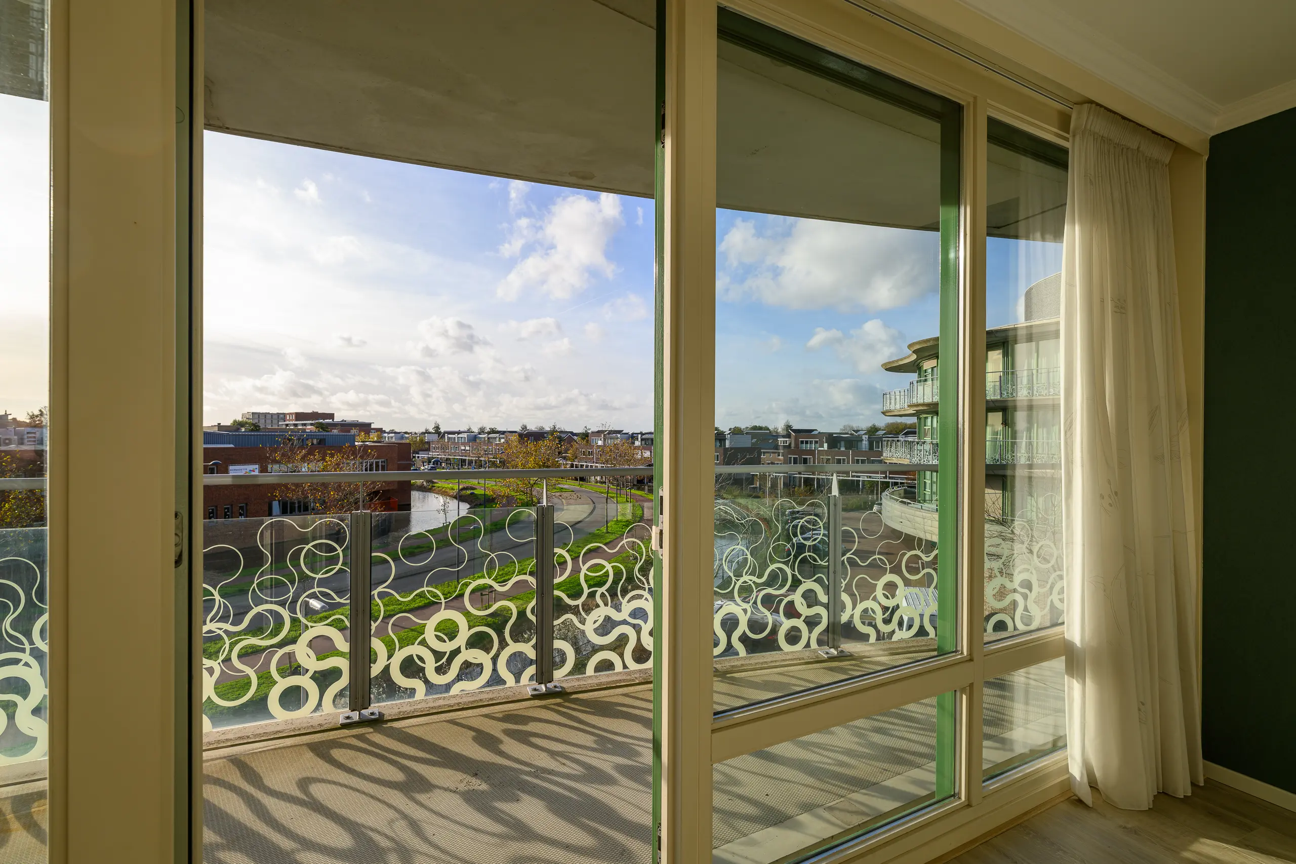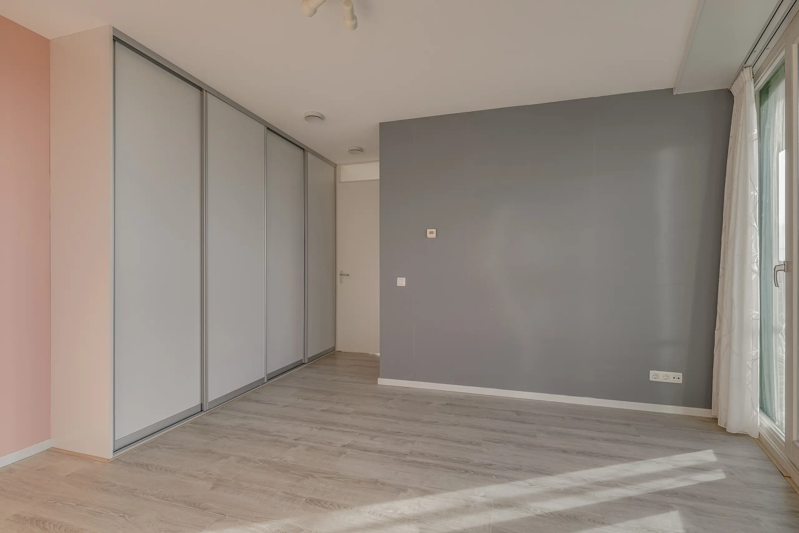 Aan de achterzijde van het appartement bevinden zich twee slaapkamers. De hoofdslaapkamer is royaal van formaat, beschikt over een praktische ingebouwde kastenwand en heeft direct toegang tot het terras. De tweede slaapkamer is eveneens licht en goed bruikbaar als logeerkamer, werkkamer of hobbyruimte.